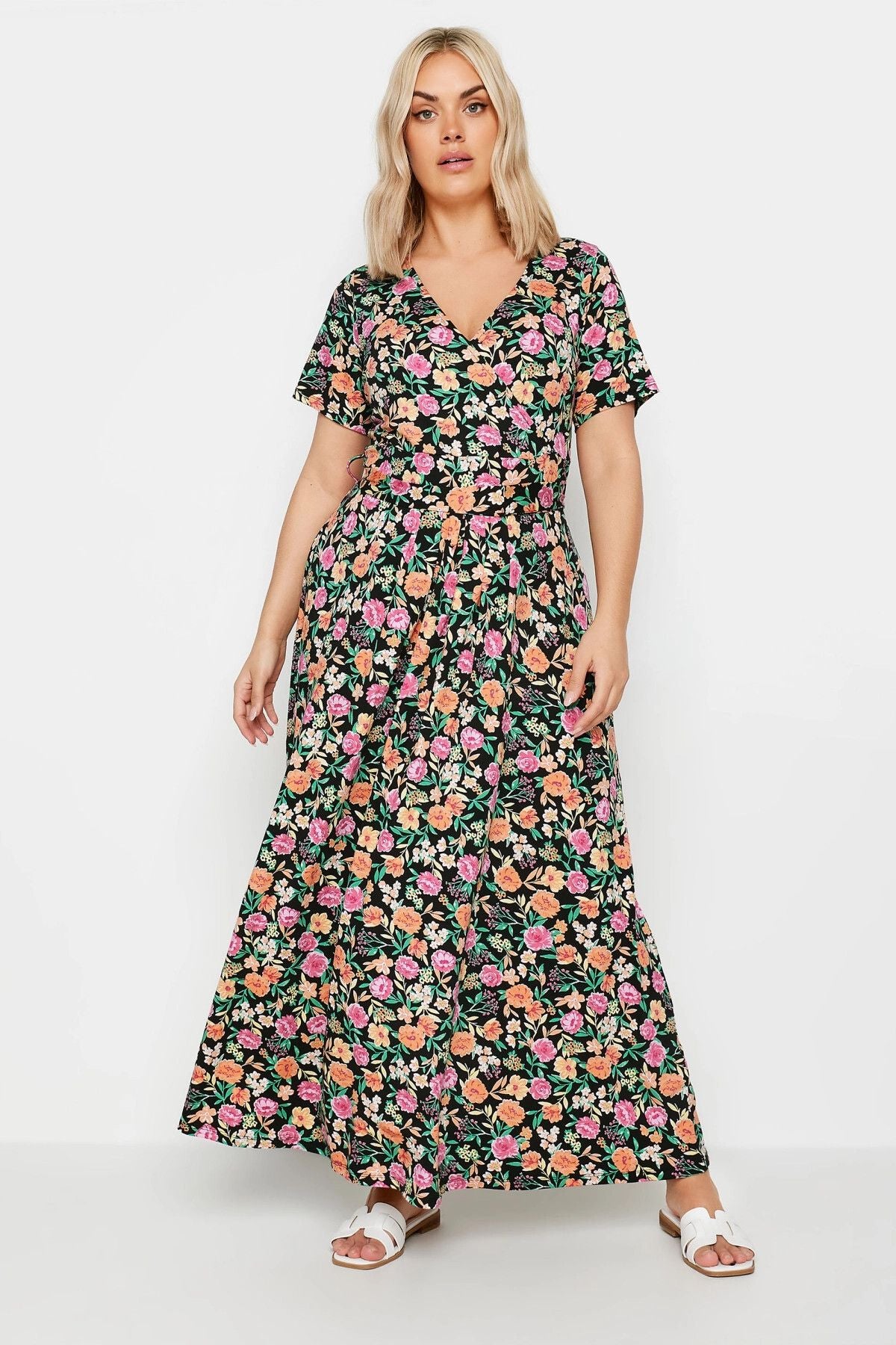 Büyük Beden V Yaka Kısa Kollu Kuşaklı Desenli Uzun Elbise 137822