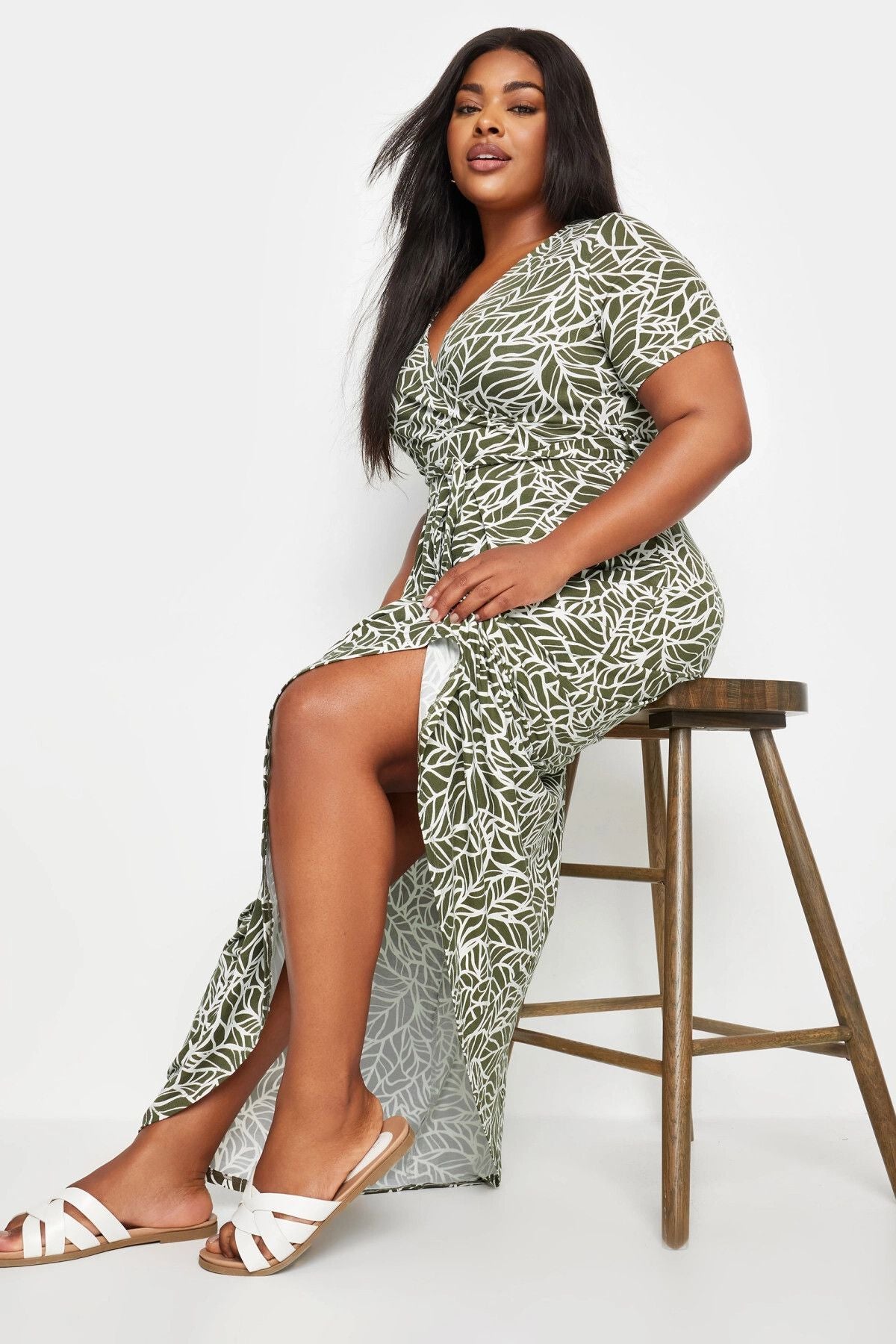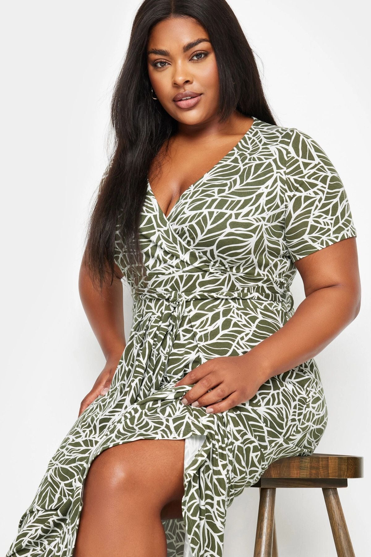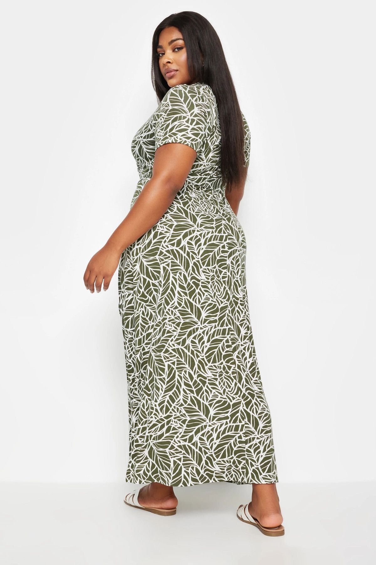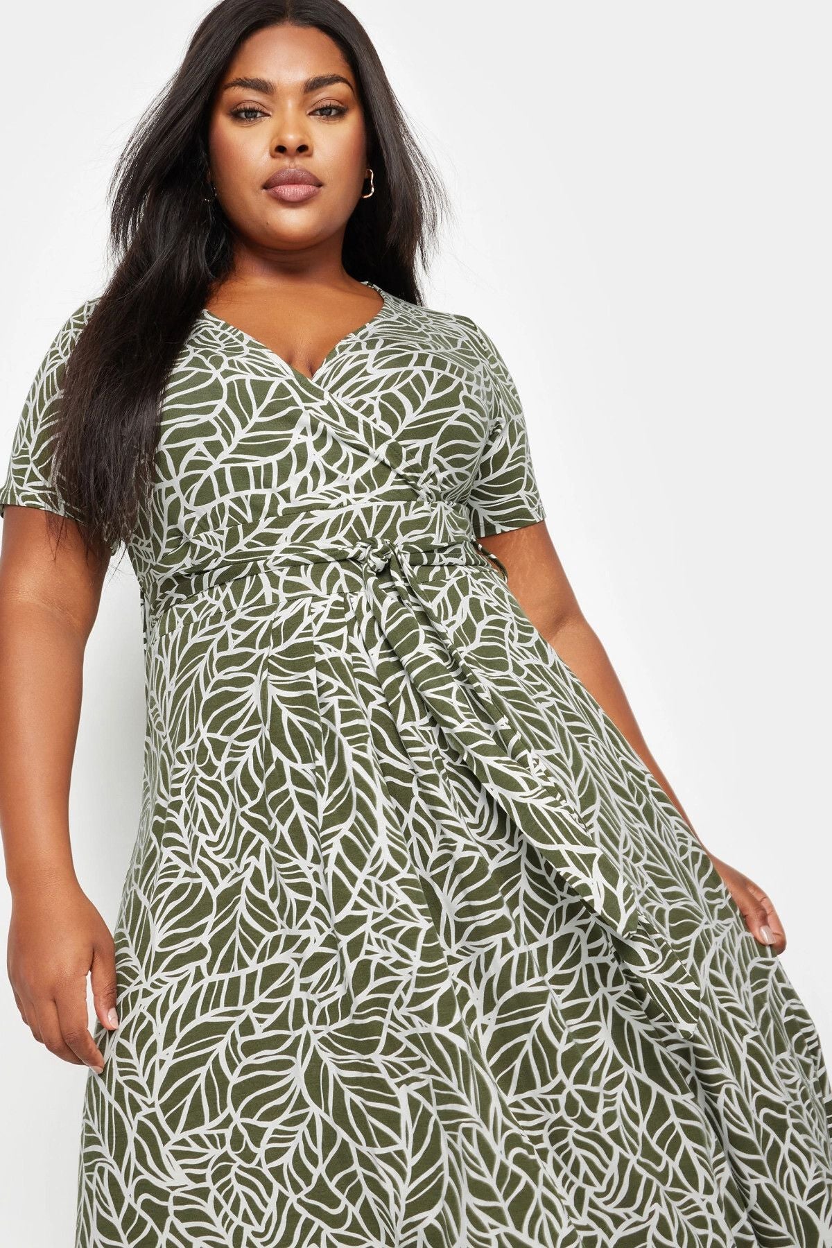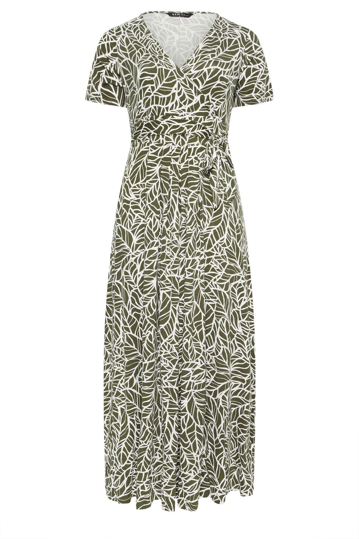 Büyük Beden V Yaka Kısa Kollu Kuşaklı Desenli Uzun Elbise 137860