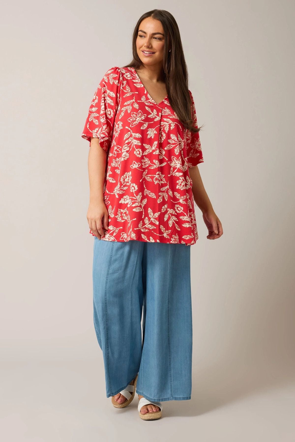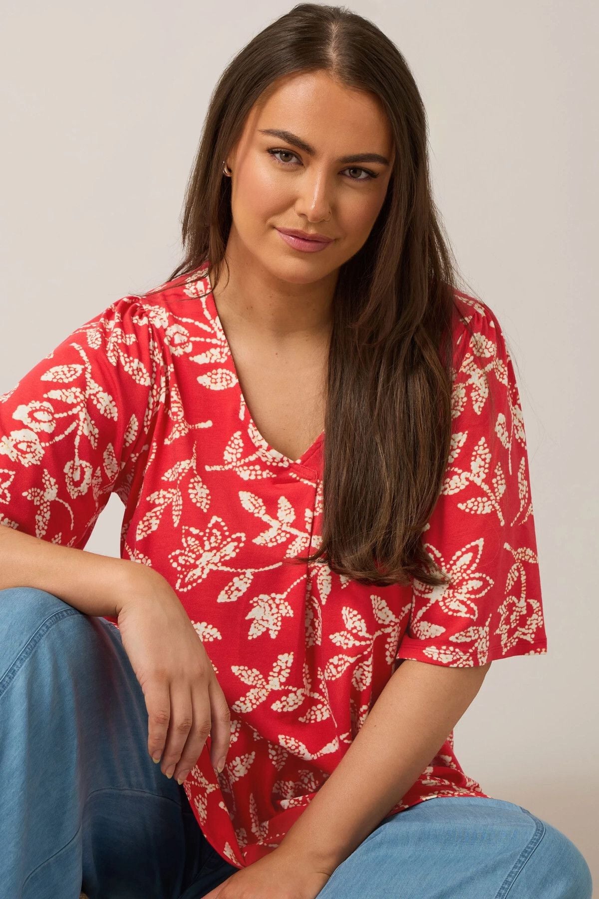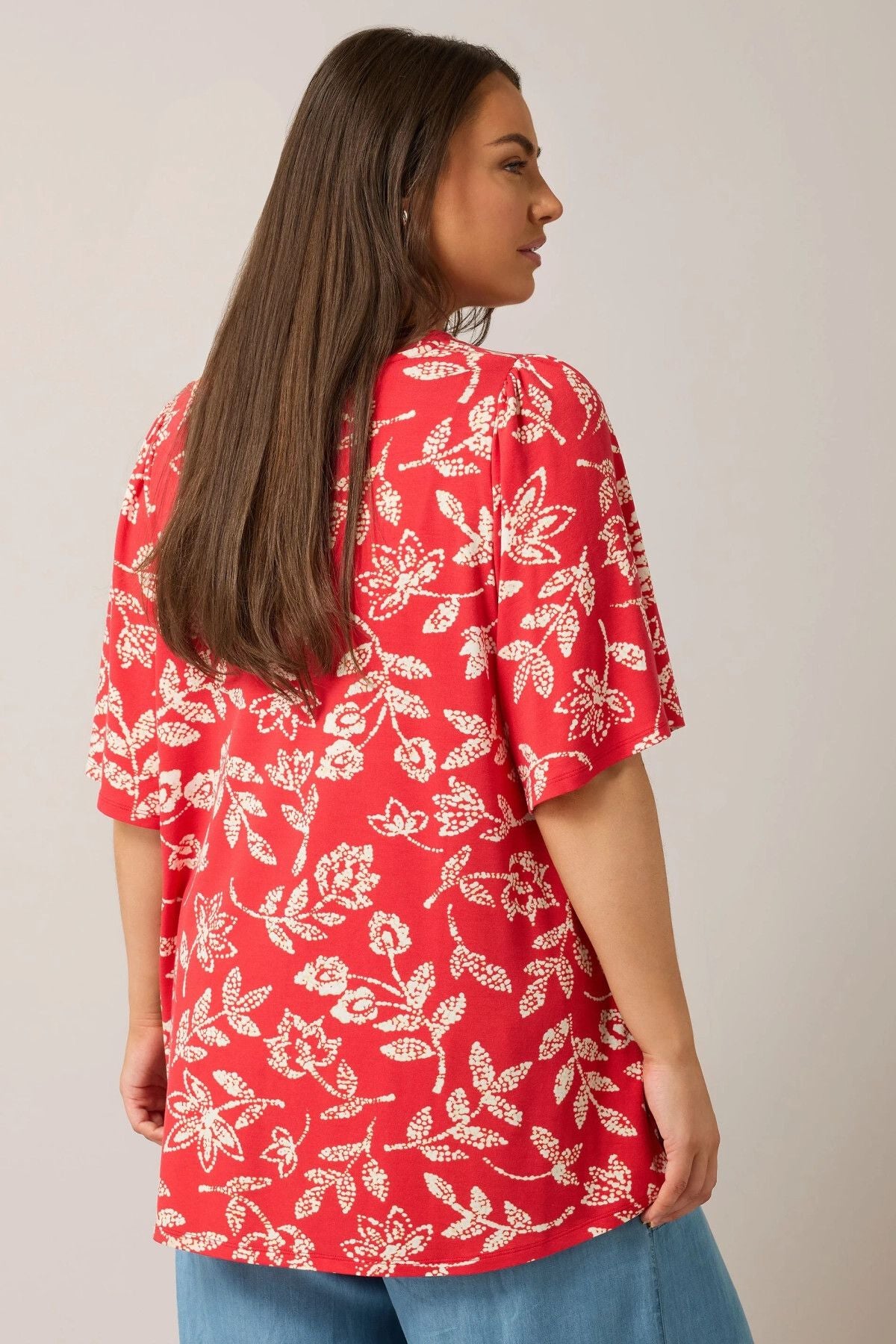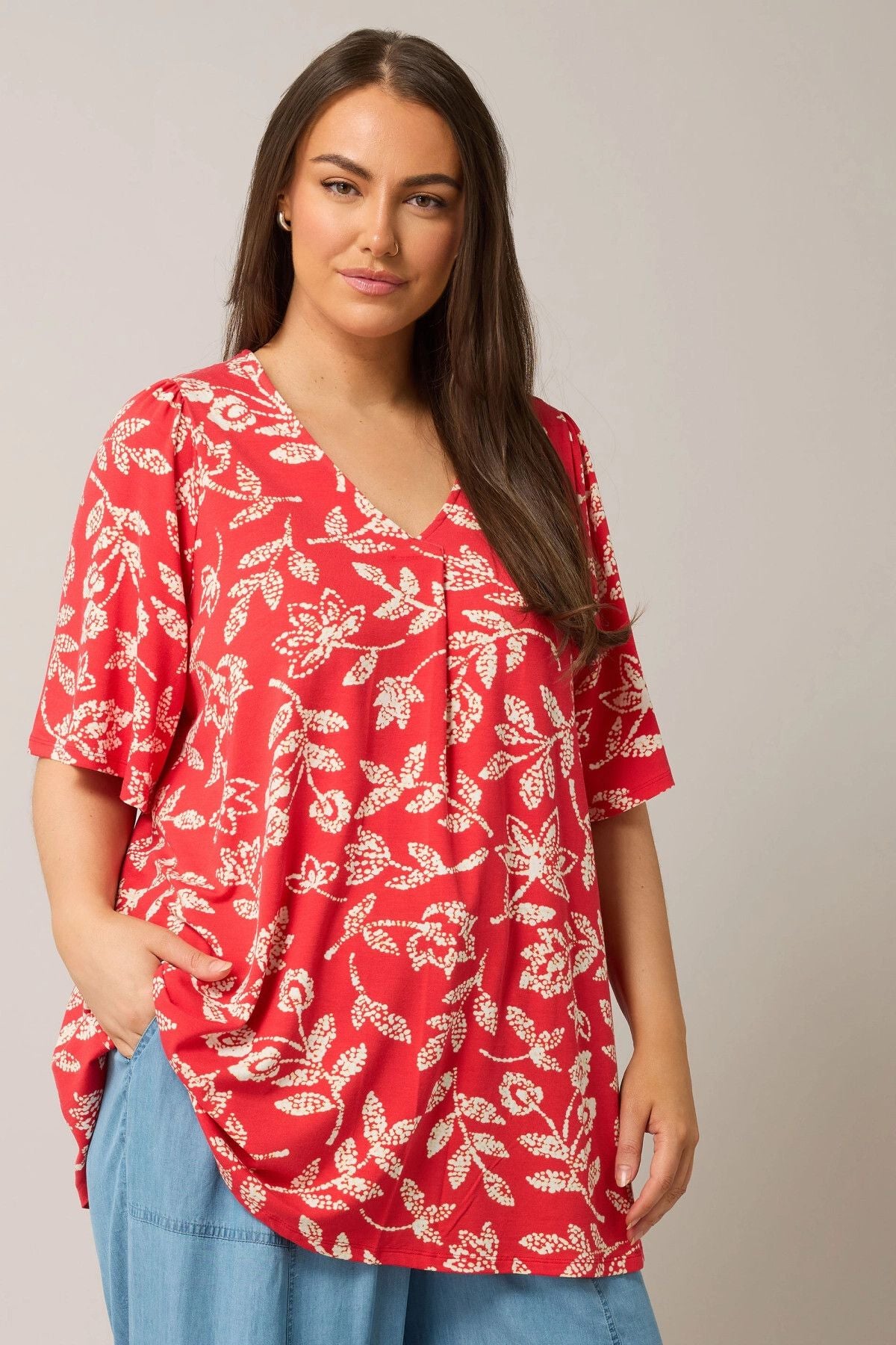 Büyük Beden V Yaka Kısa Kollu Önü Pileli Desenli Likralı Bluz 616172
