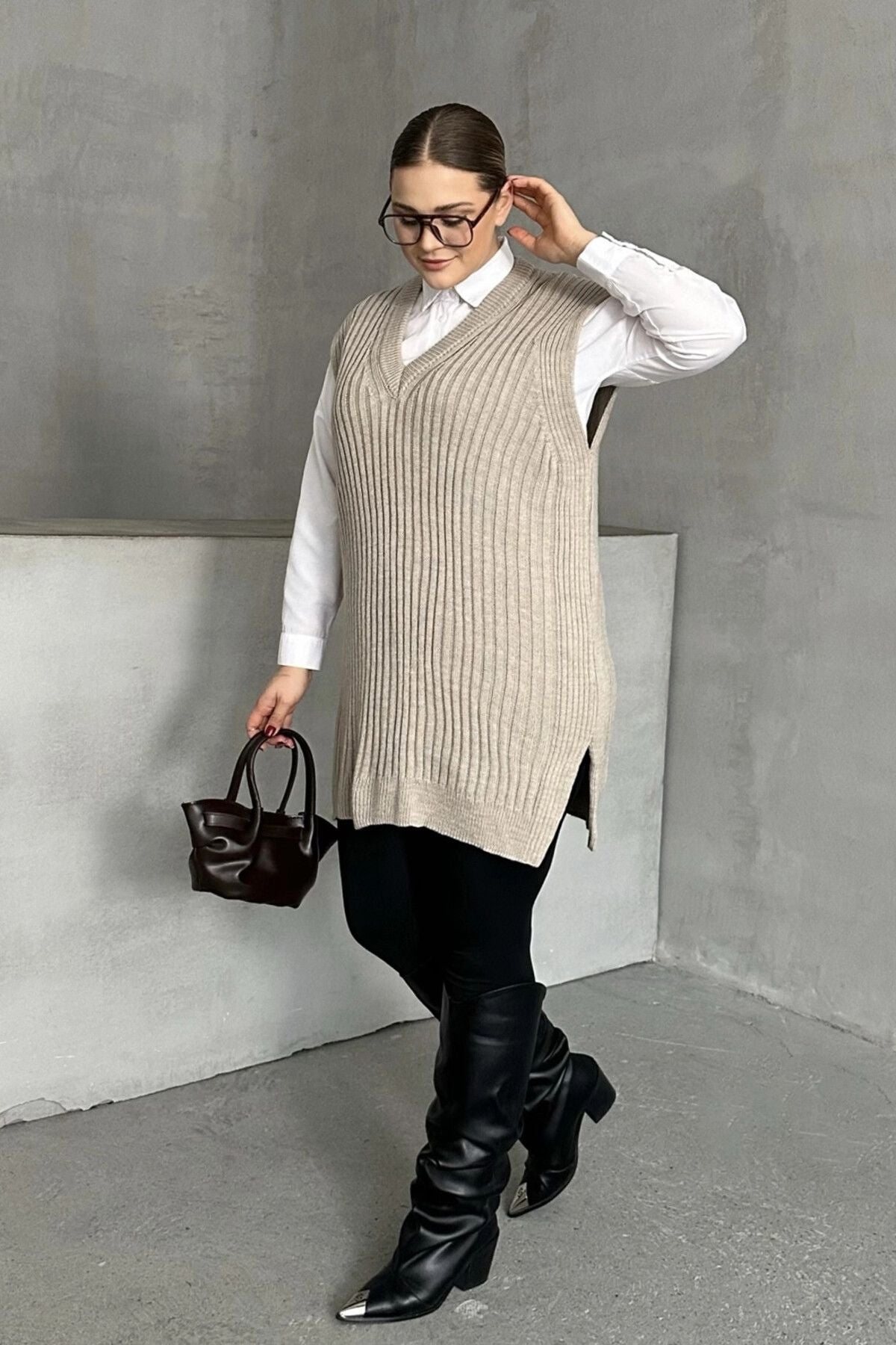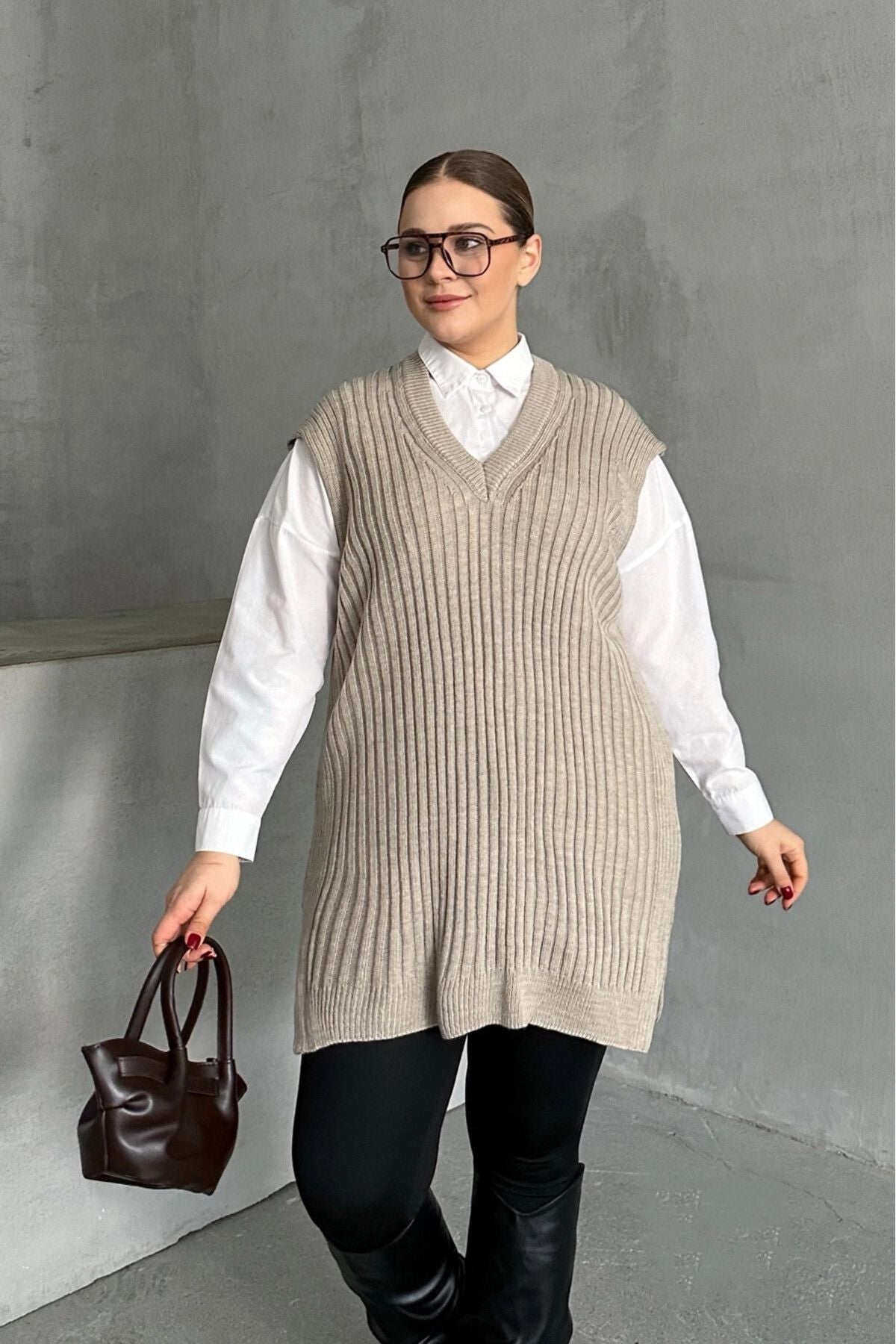 Büyük Beden V Yaka Kısa Kollu Triko Süveter 302133