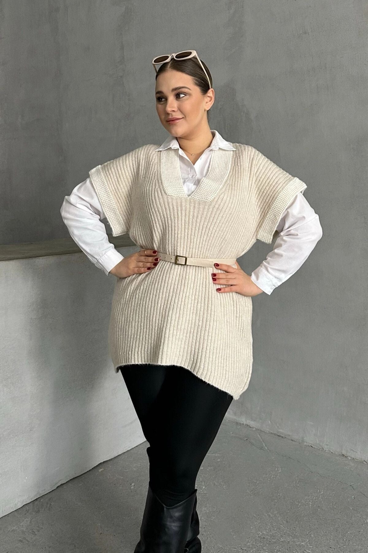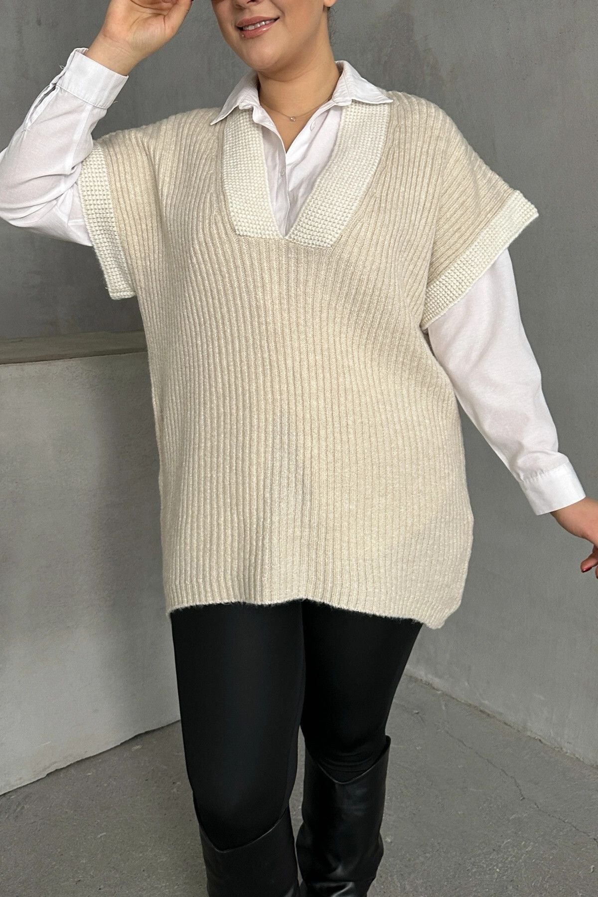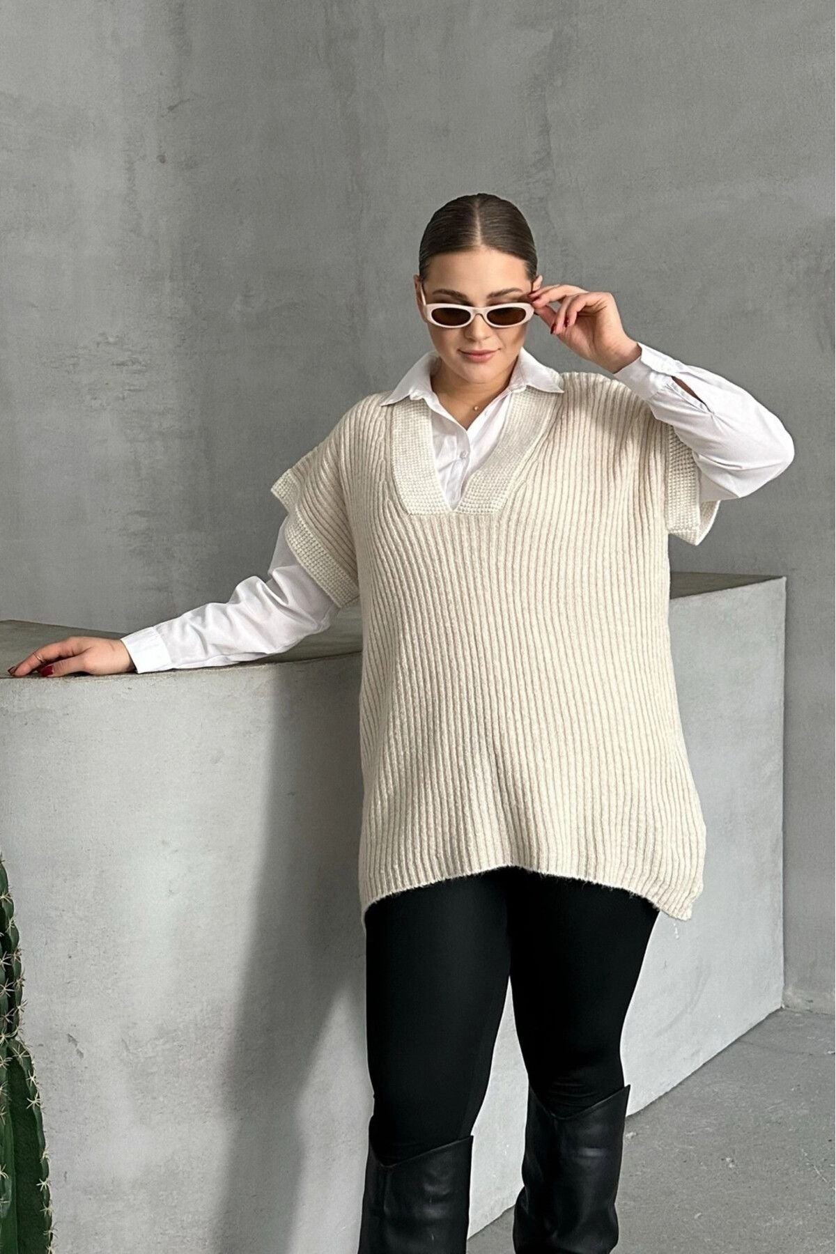 Büyük Beden V Yaka Kısa Kollu Triko Süveter 302137