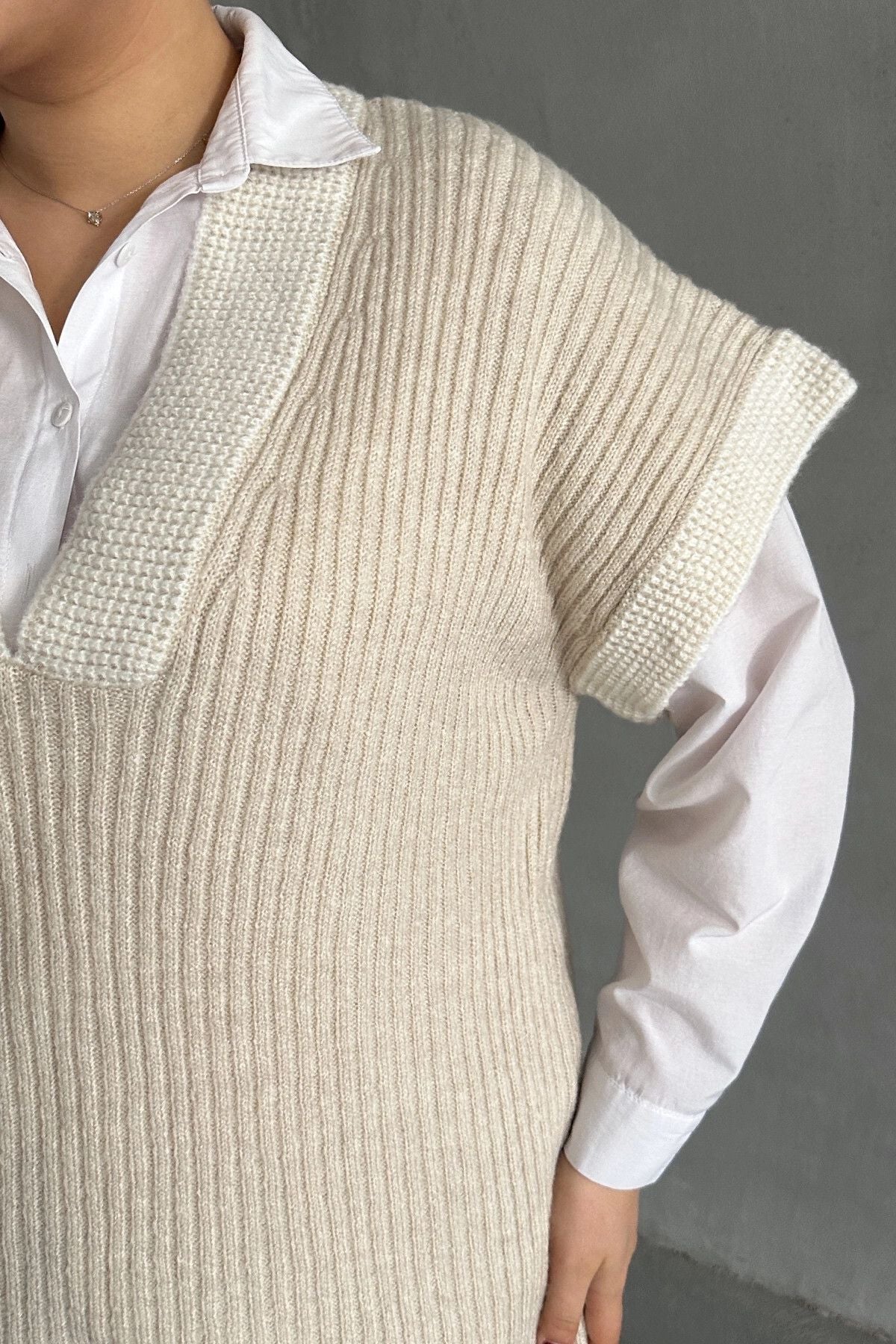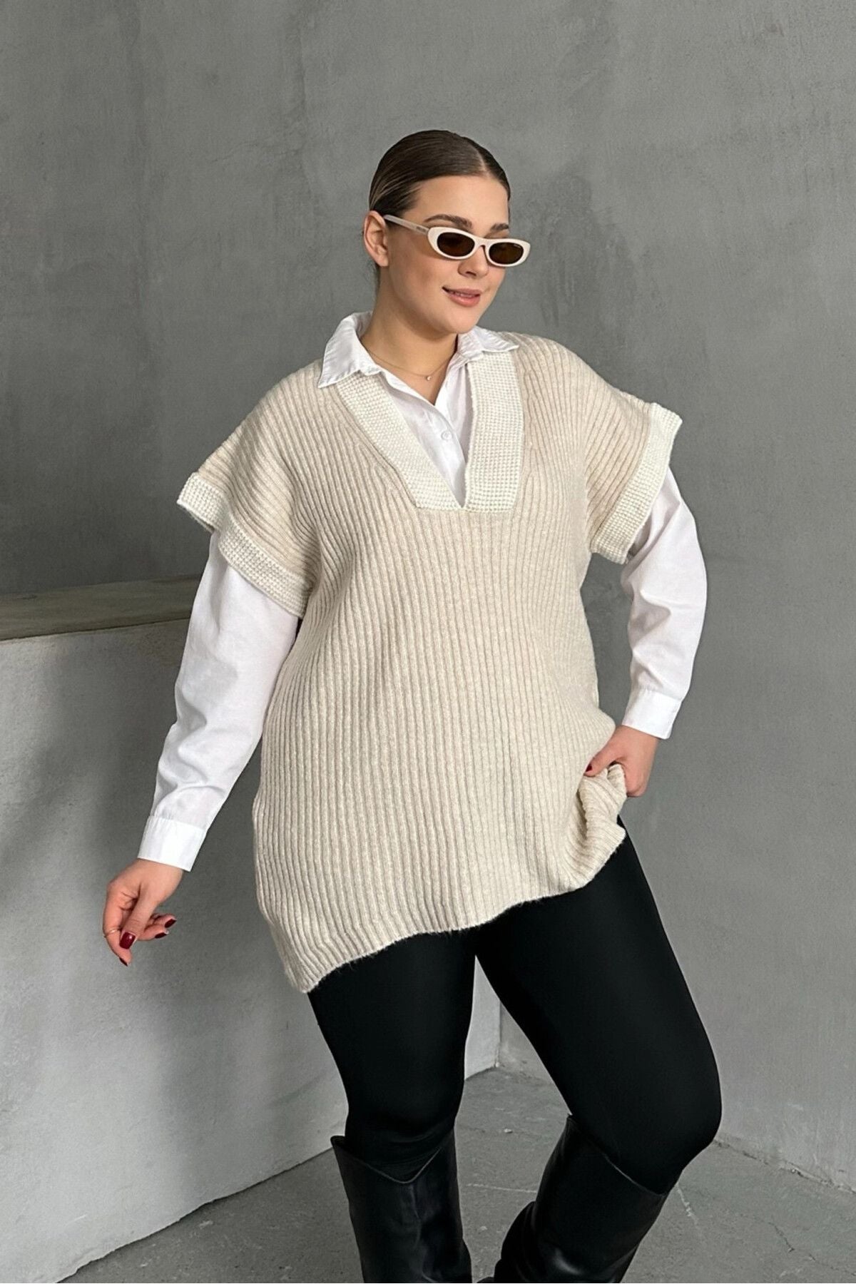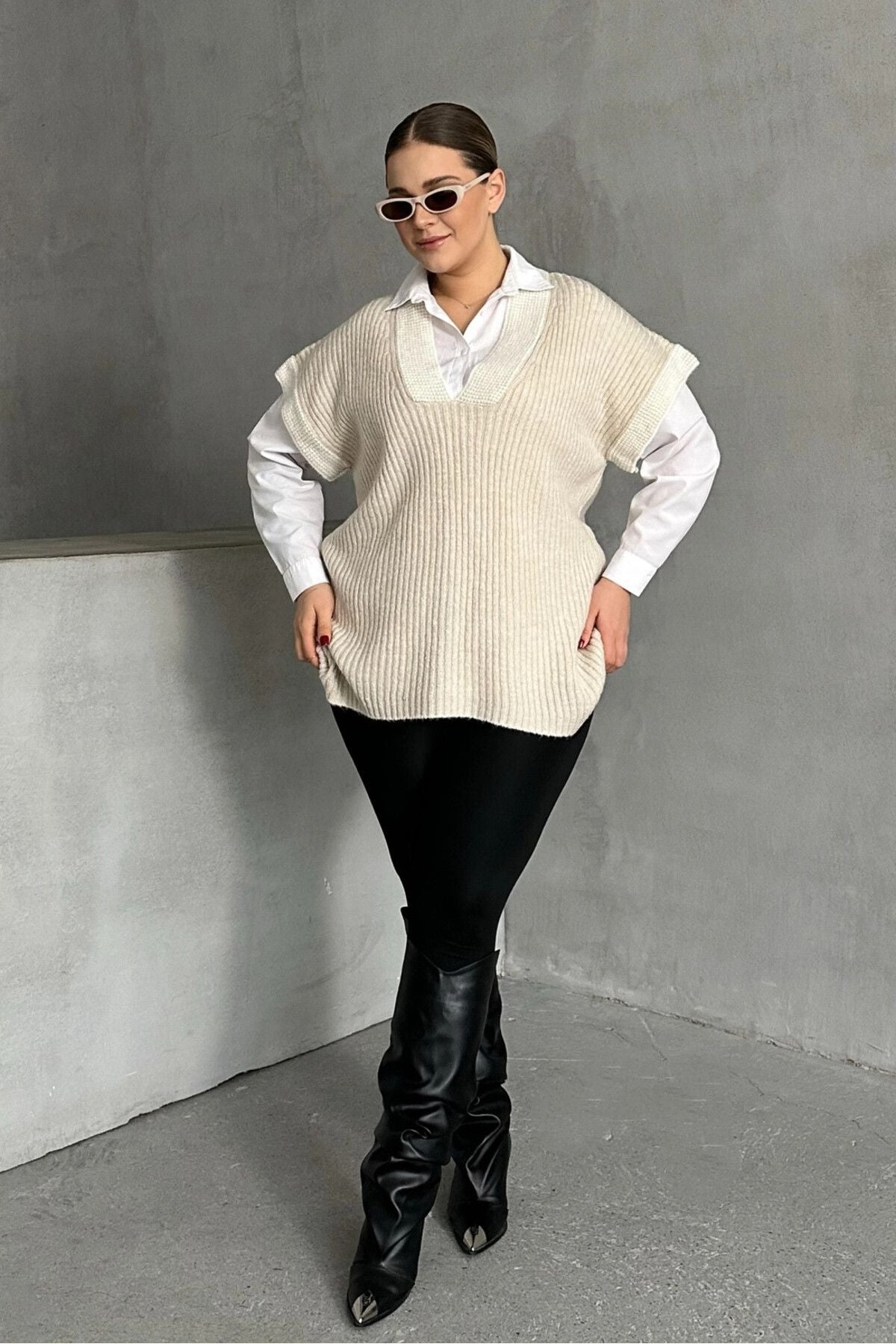 Büyük Beden V Yaka Kısa Kollu Triko Süveter 302137