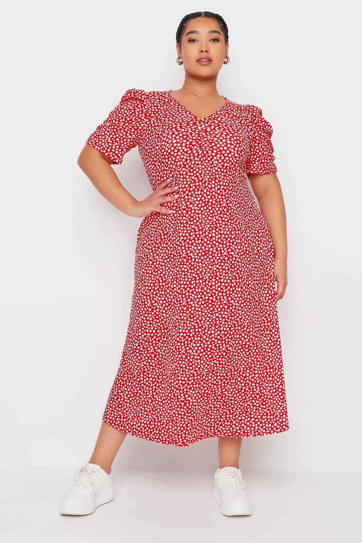Büyük Beden V Yaka Kolları Drapeli Çiçek Desenli Midi Boy Elbise 137848