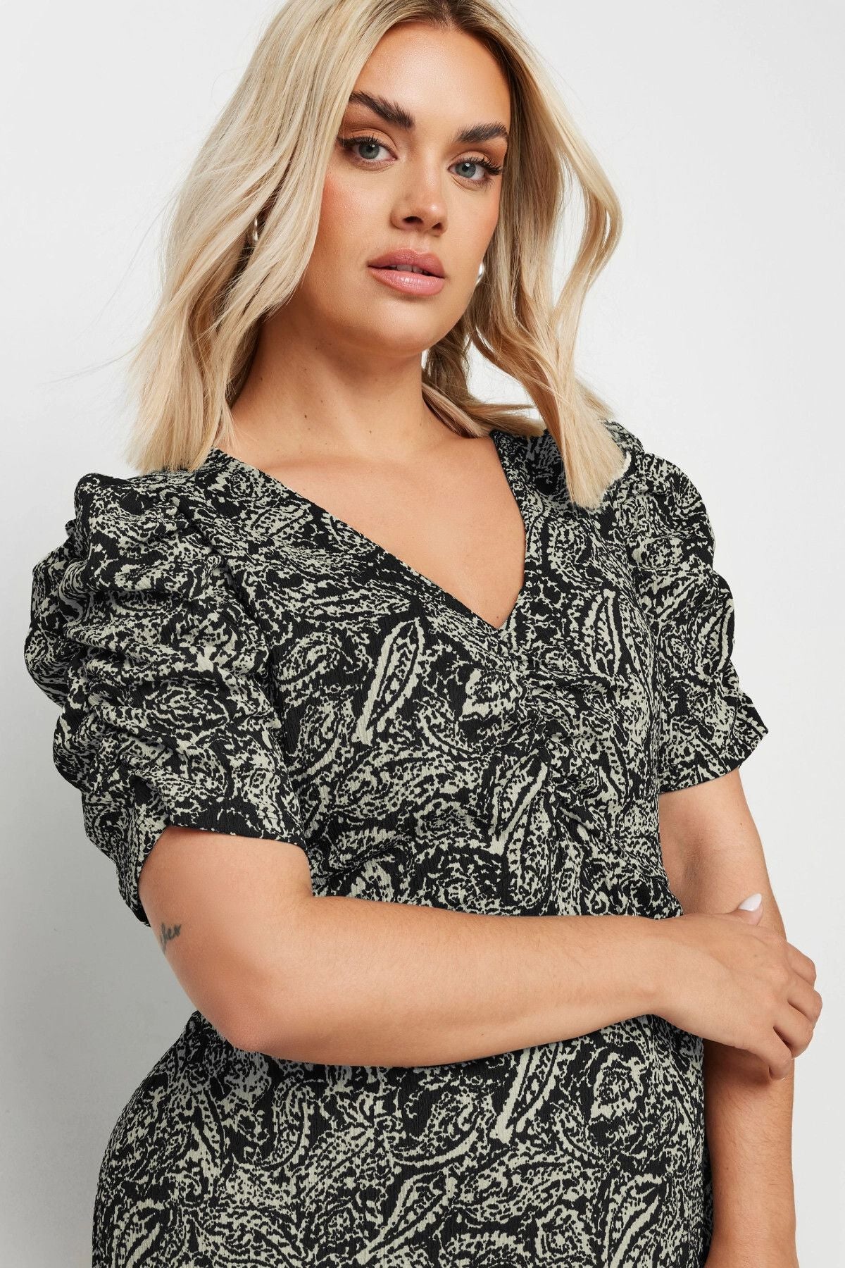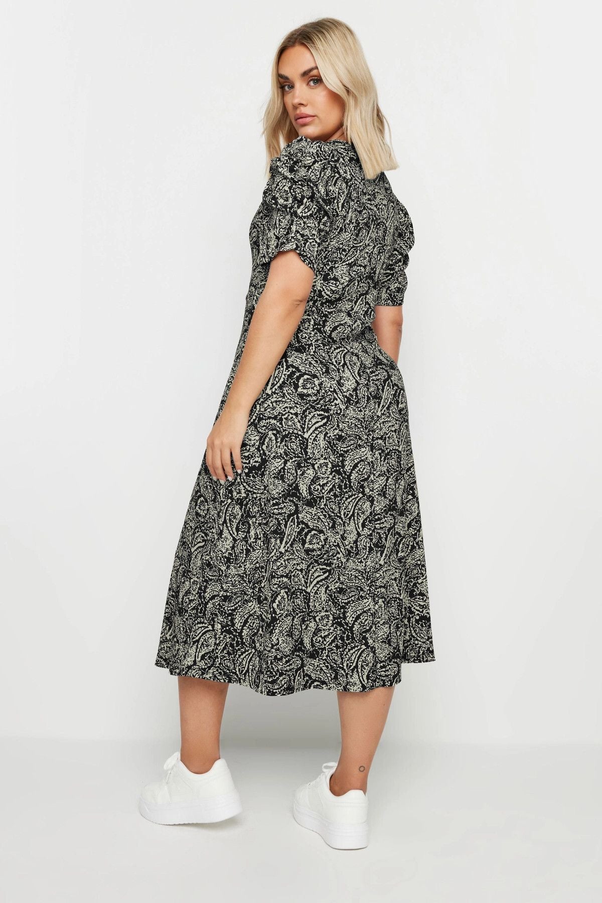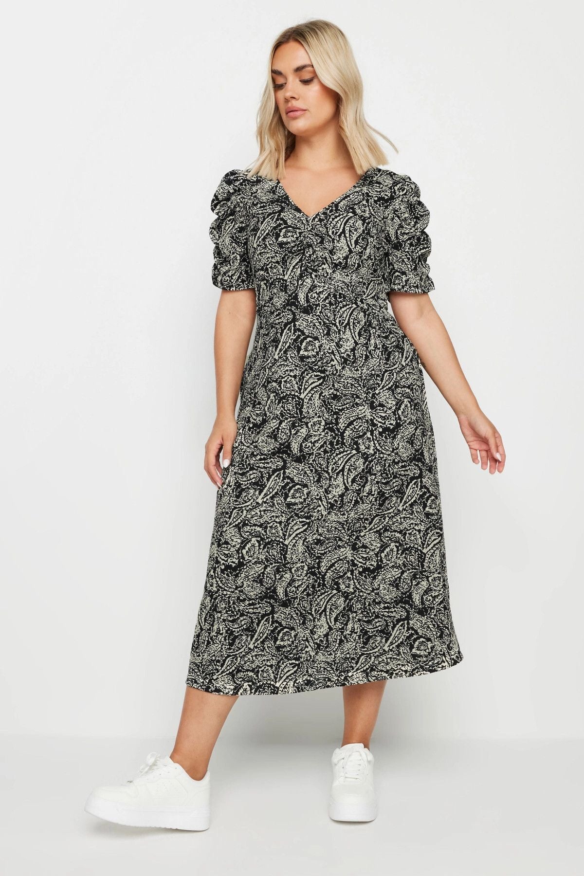 Büyük Beden V Yaka Kolları Drapeli Çiçek Desenli Midi Boy Elbise 137960