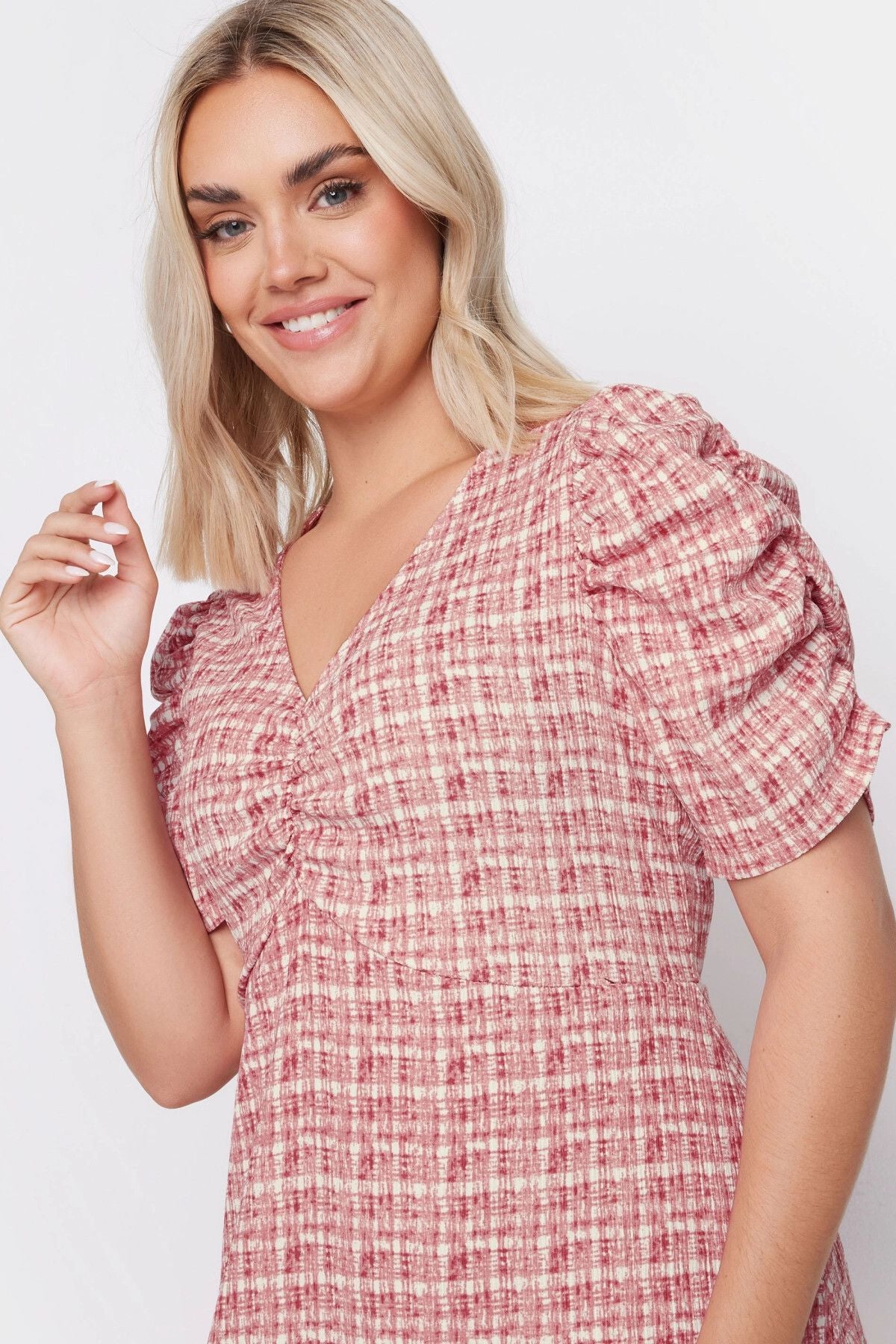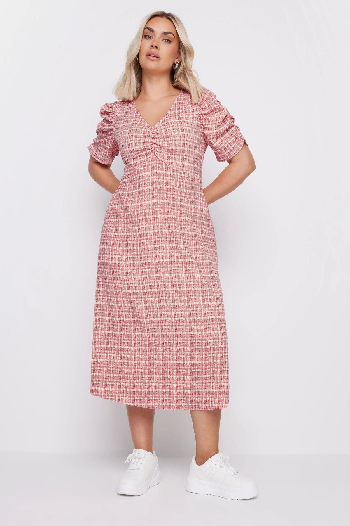 Büyük Beden V Yaka Kolları Drapeli Kare Desenli Midi Boy Elbise 137947
