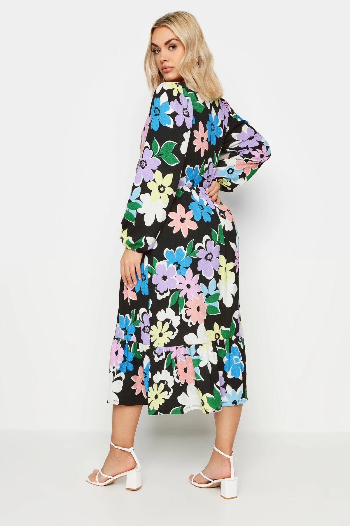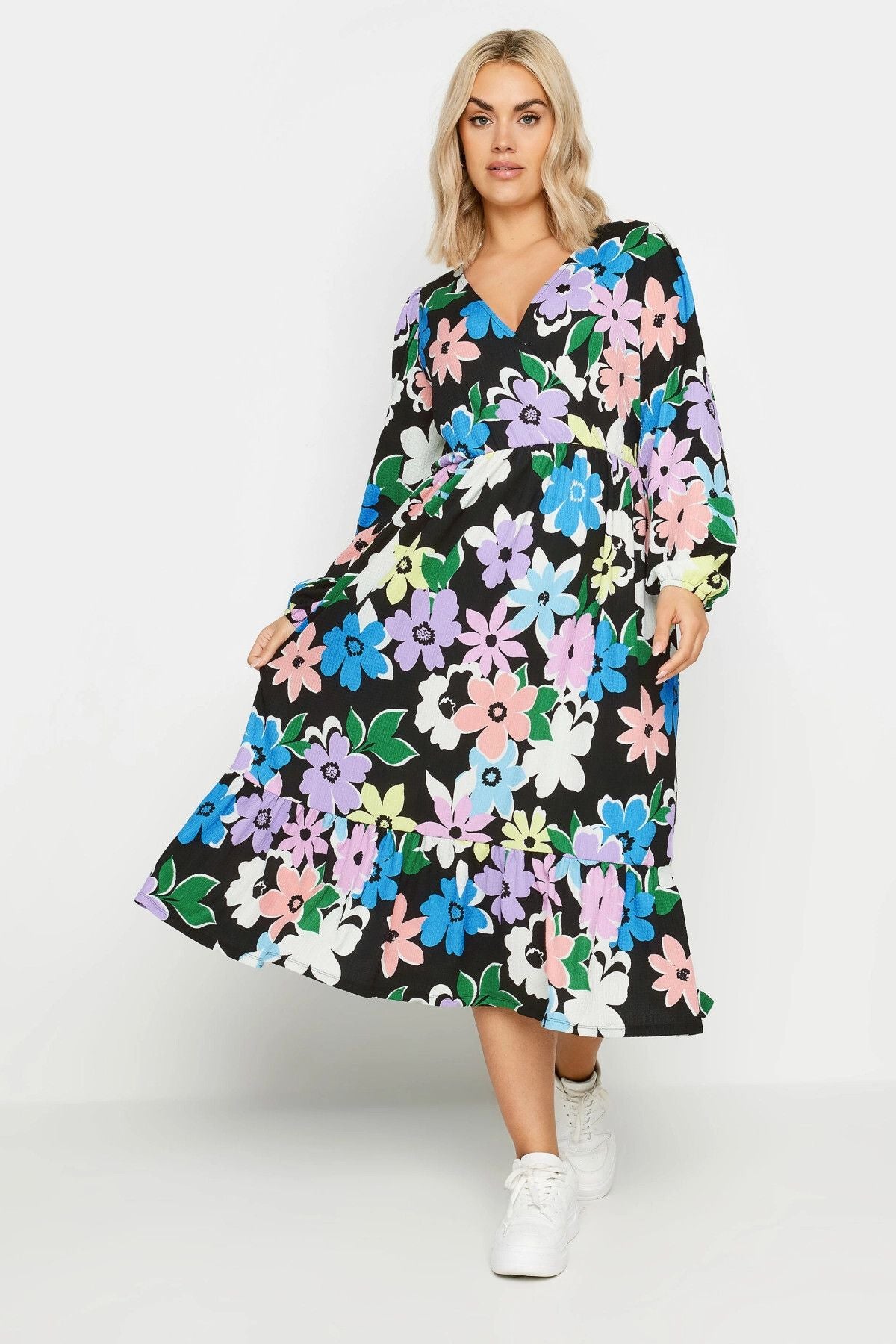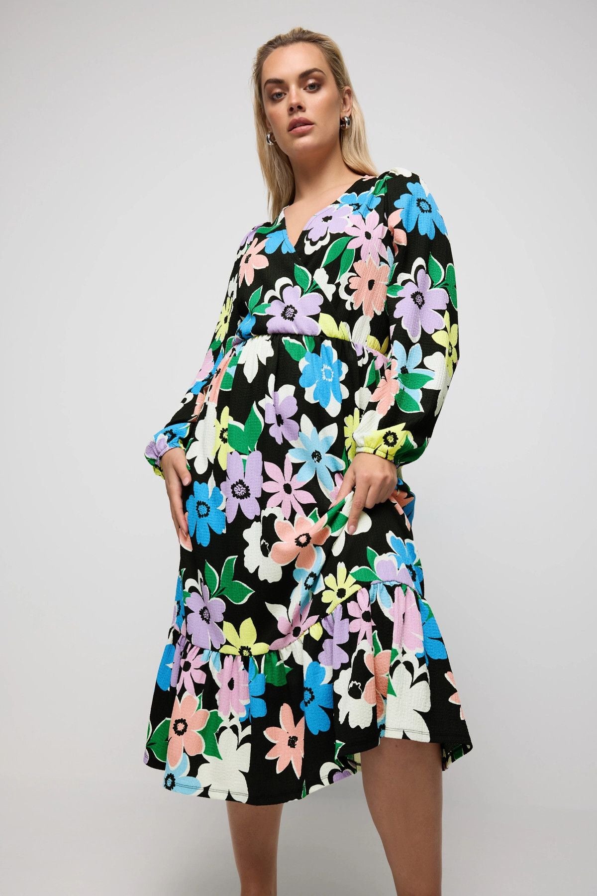 Büyük Beden V Yaka Kolları Lastikli Desenli Midi Boy Anvelop Elbise 137788
