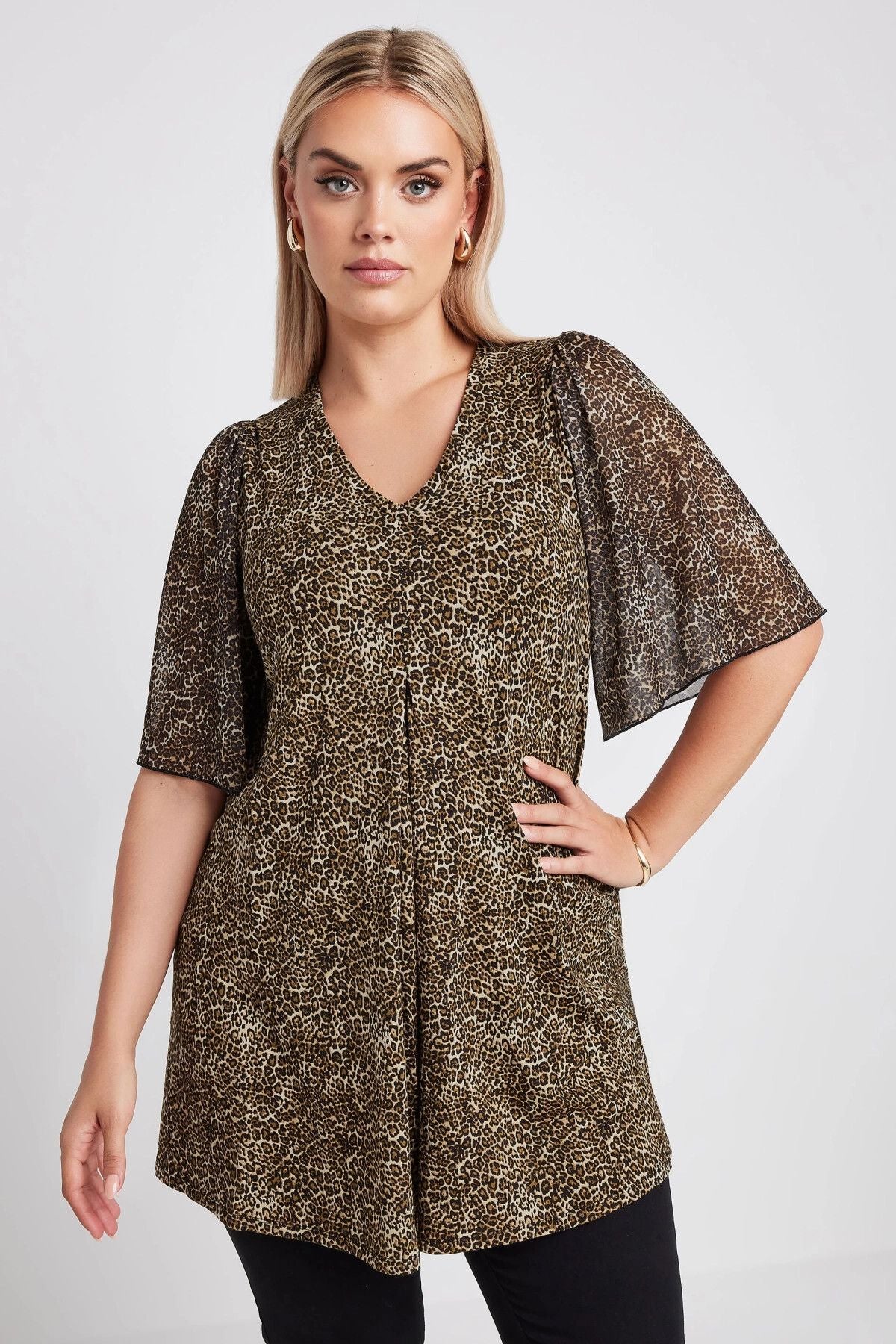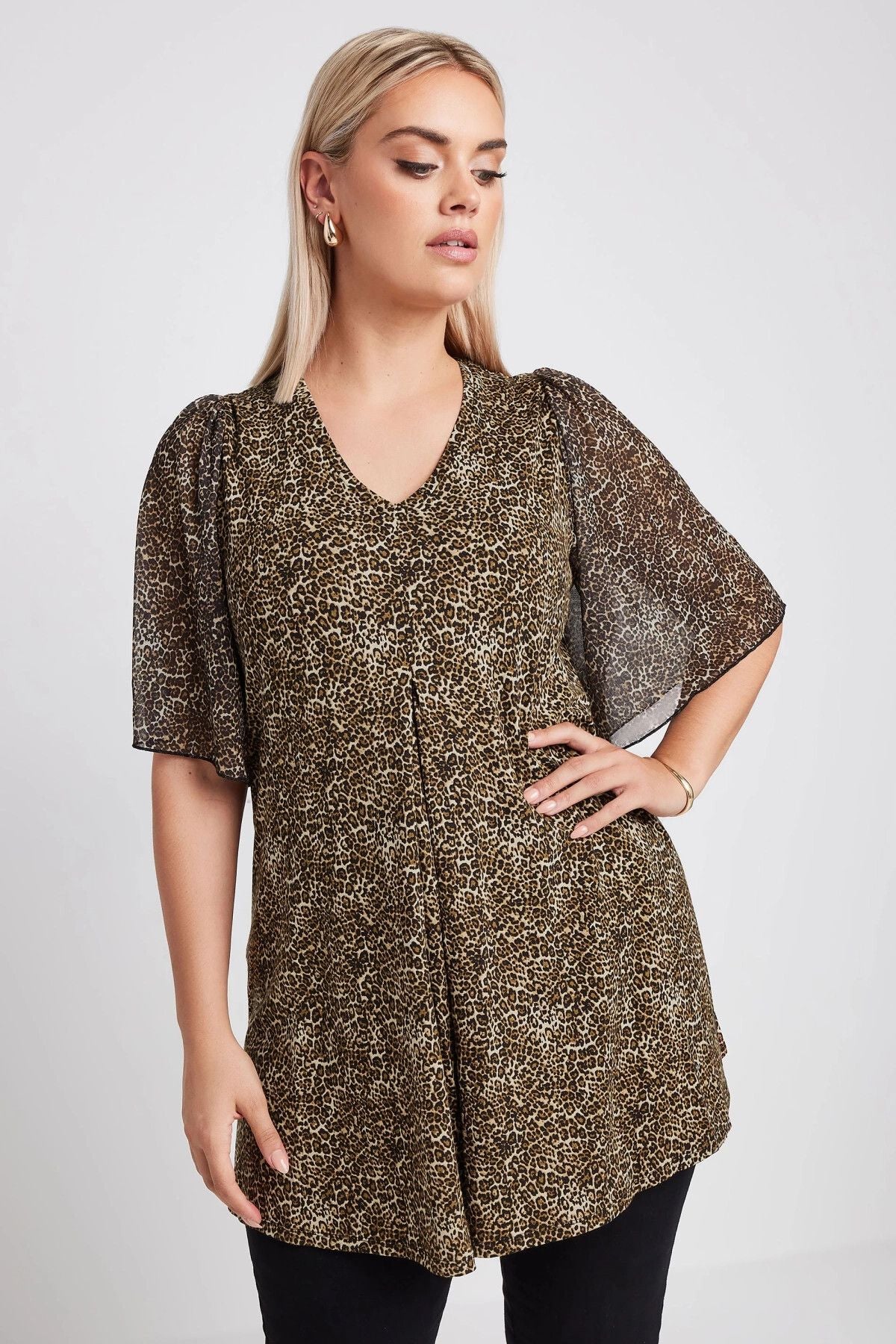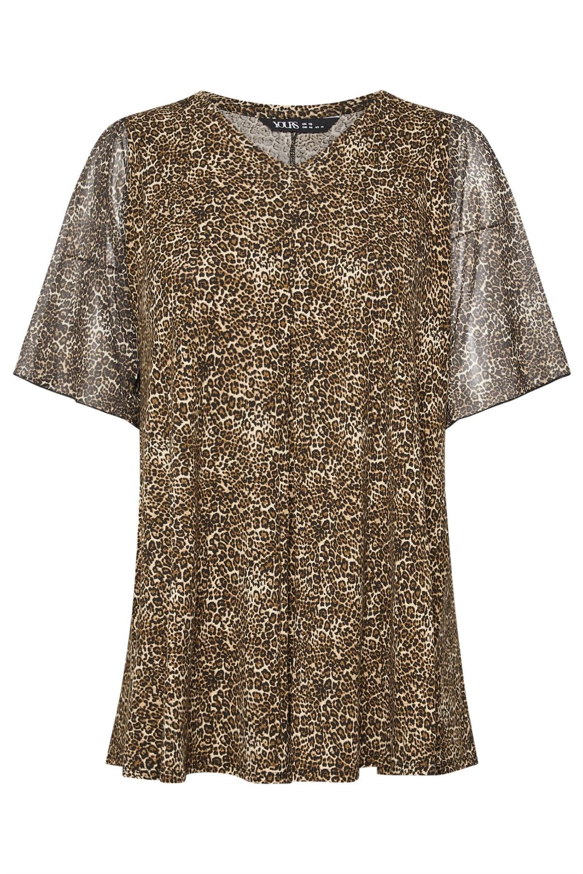 Büyük Beden V Yaka Kolları Tül Detaylı Leopar Desenli Bluz 321823