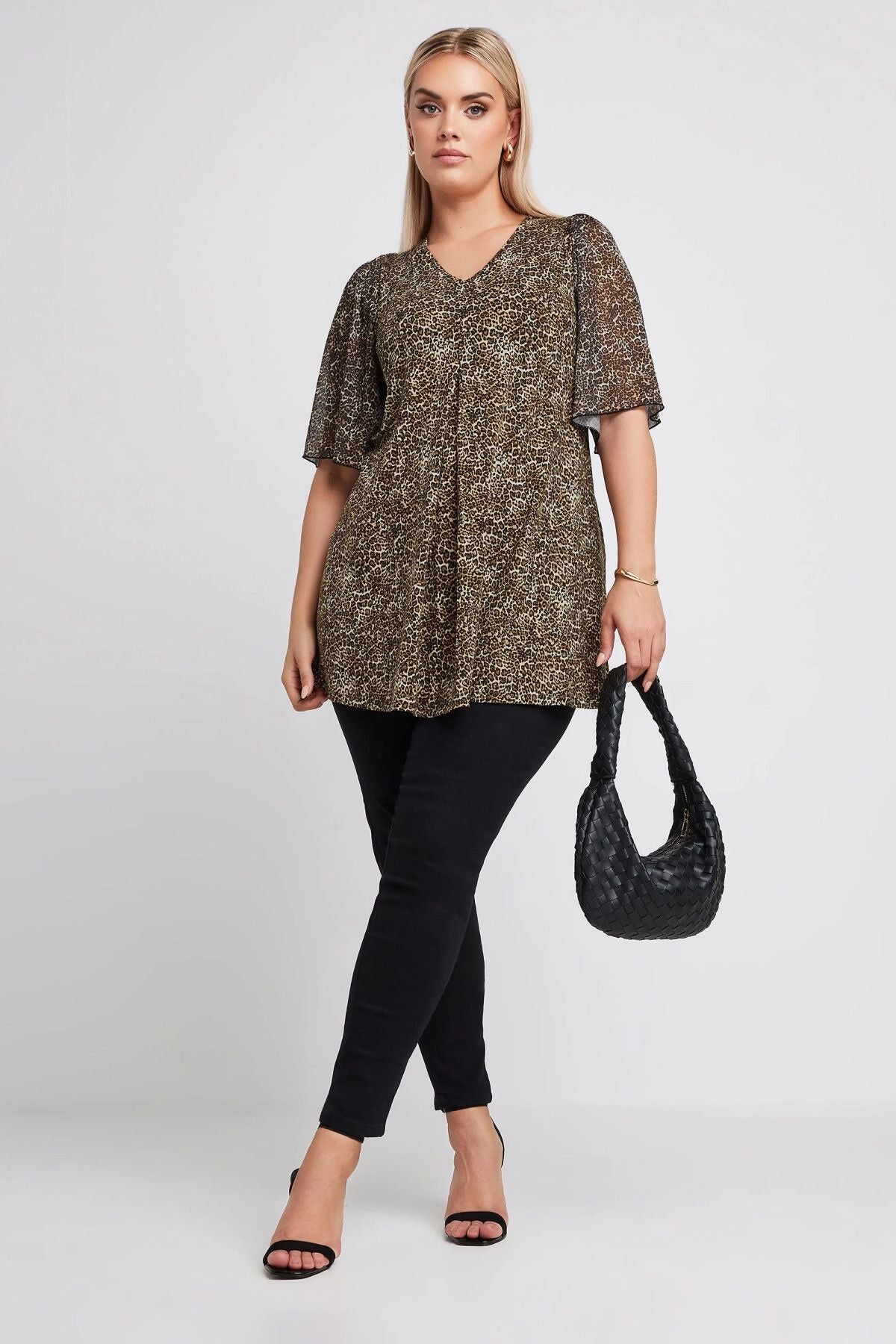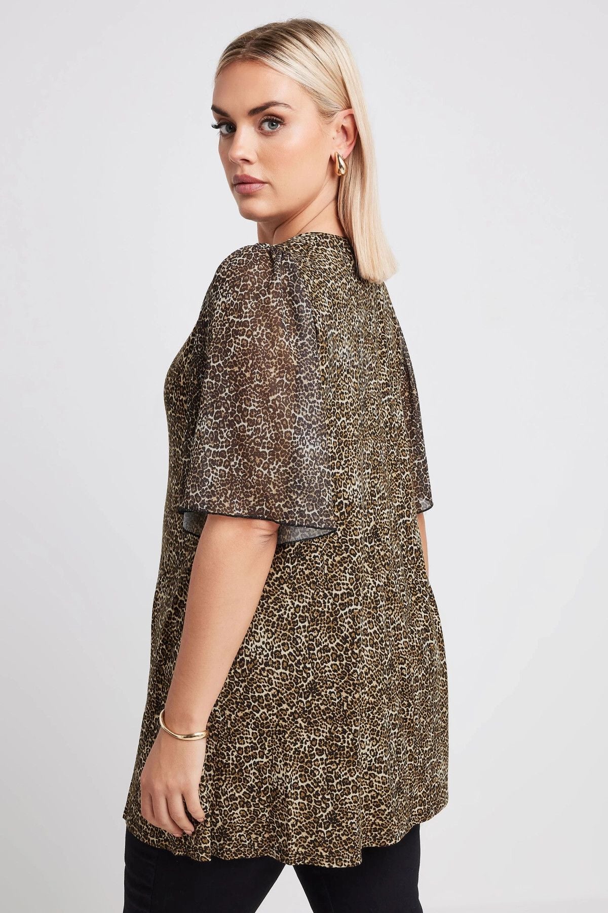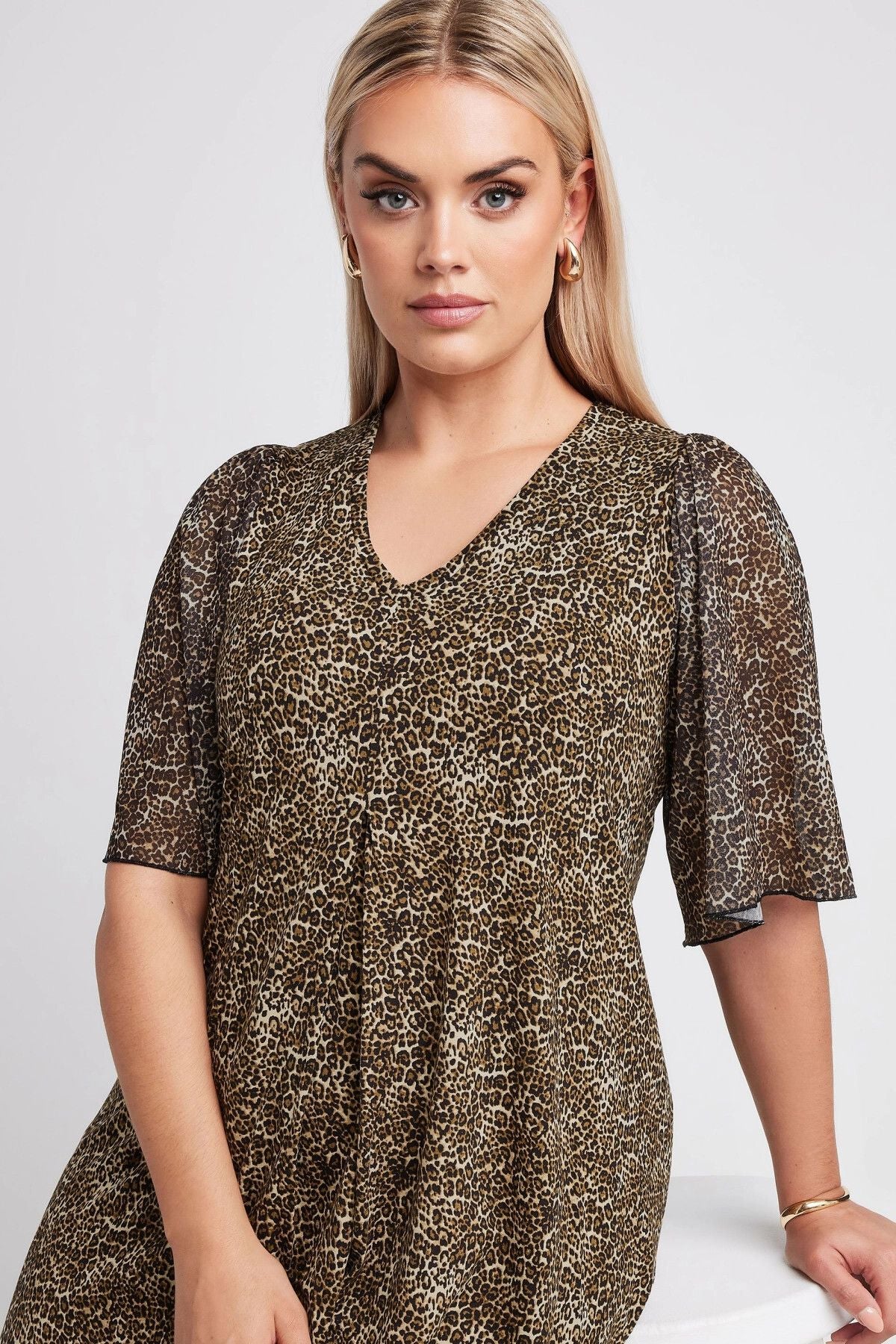 Büyük Beden V Yaka Kolları Tül Detaylı Leopar Desenli Bluz 321823