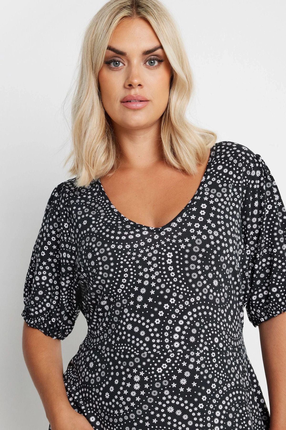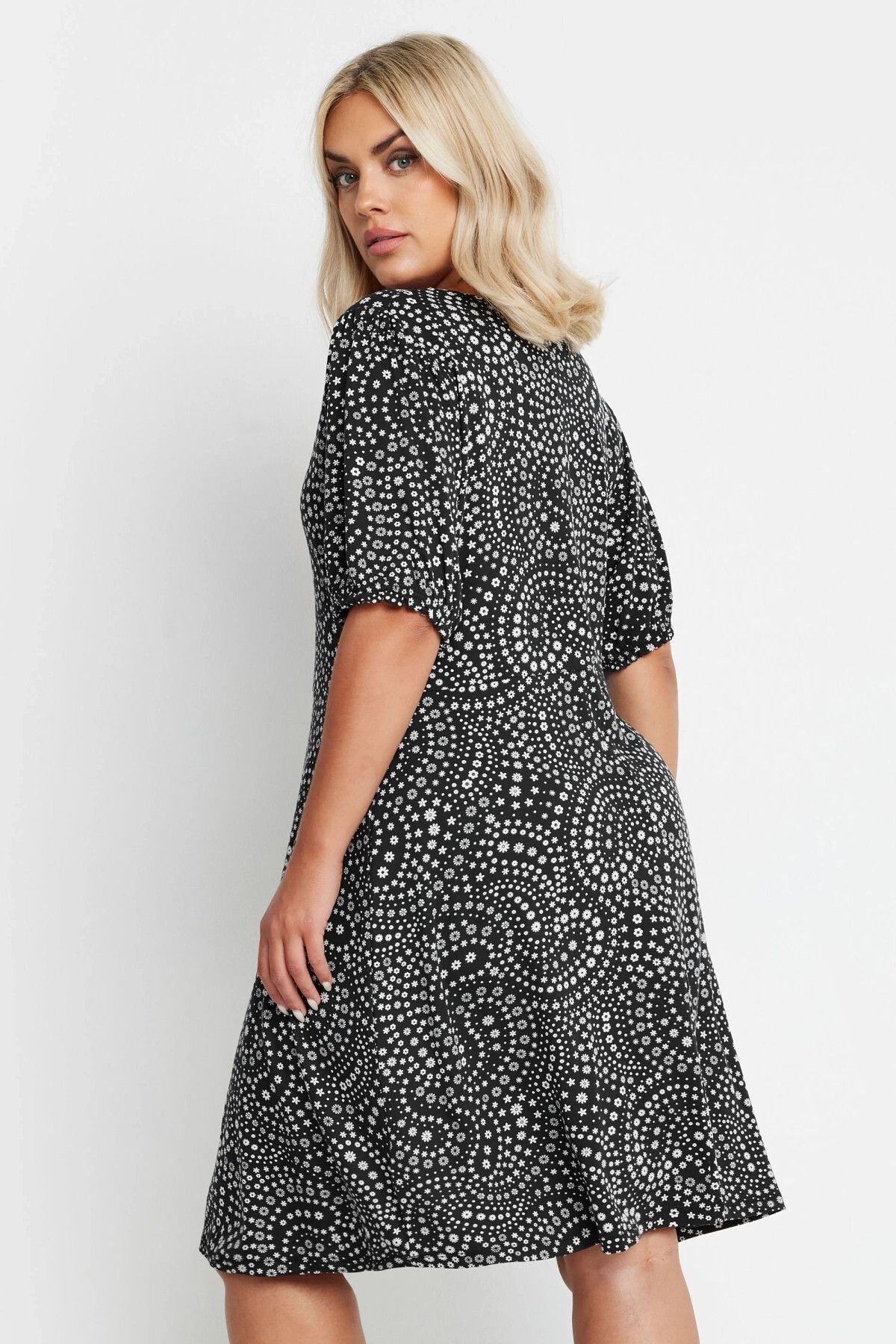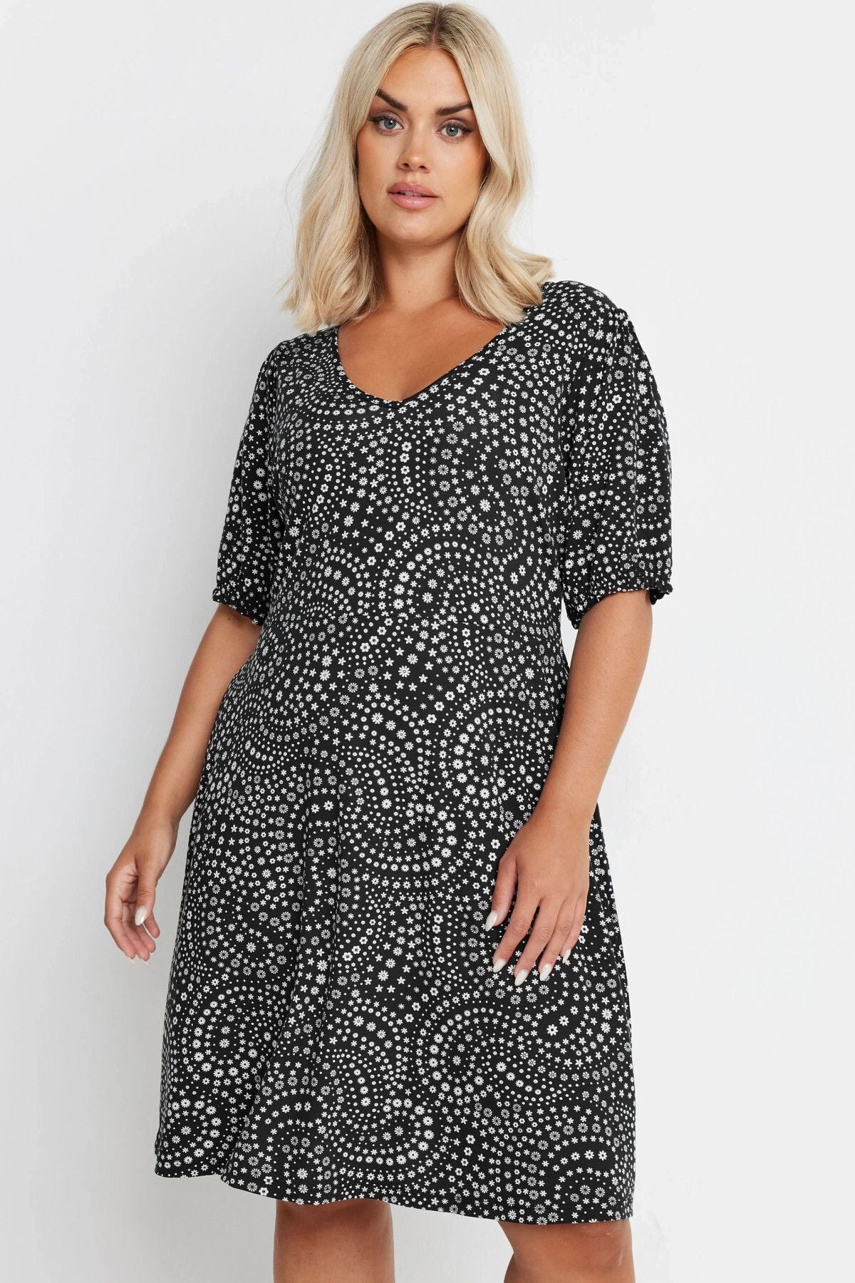 Büyük Beden V Yaka Kolu Lastikli Desenli Kısa Elbise 137992