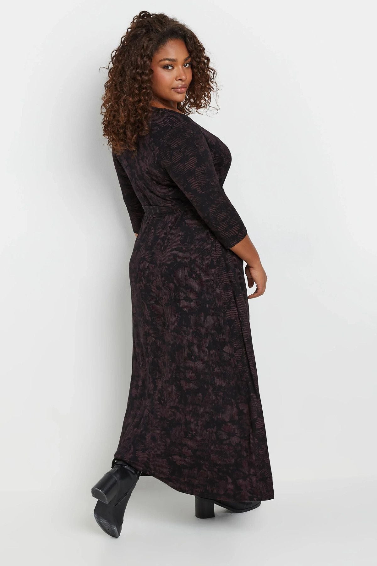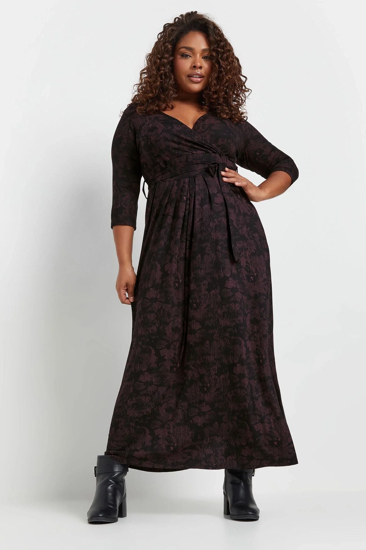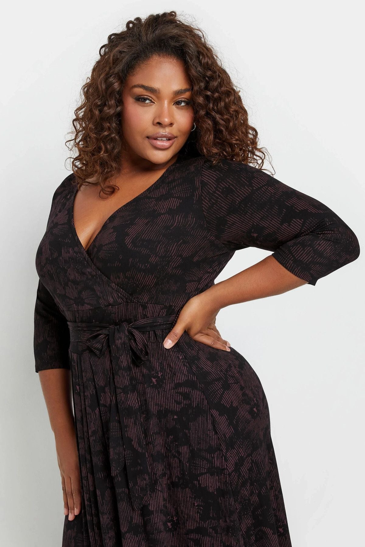 Büyük Beden V Yaka Kuşaklı Truvakar Kol Uzun Kesim Desenli Elbise 303649