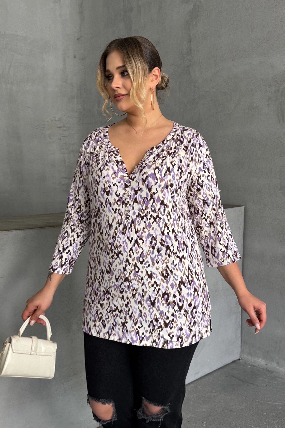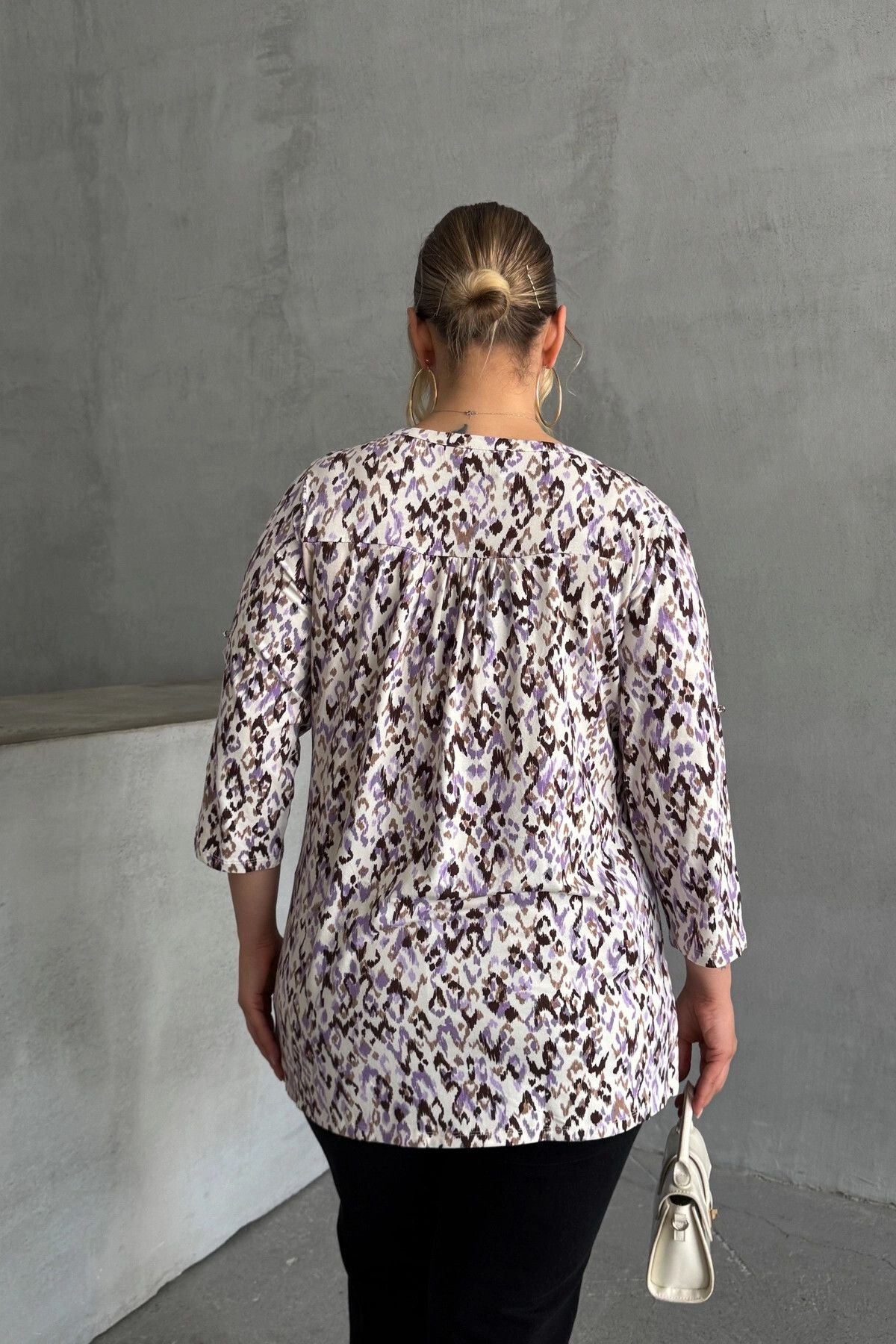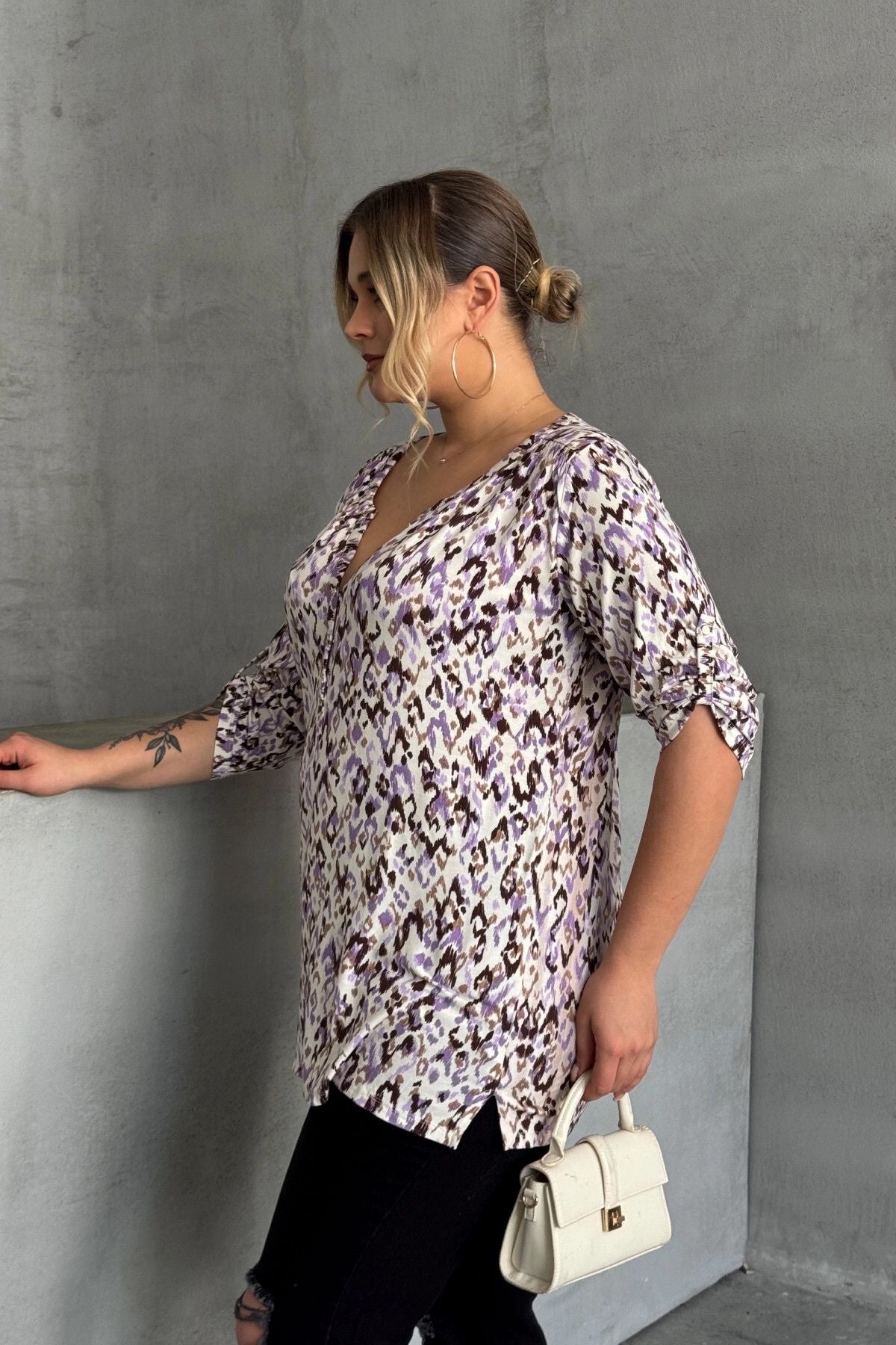 Büyük Beden V Yaka Önü Düğmeli Kolları Katlama Detaylı Likralı Bluz 1017