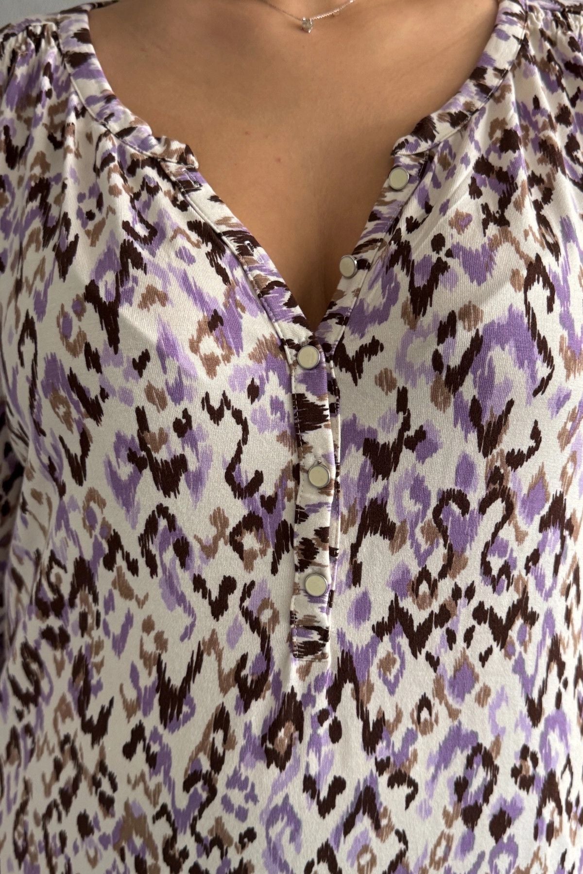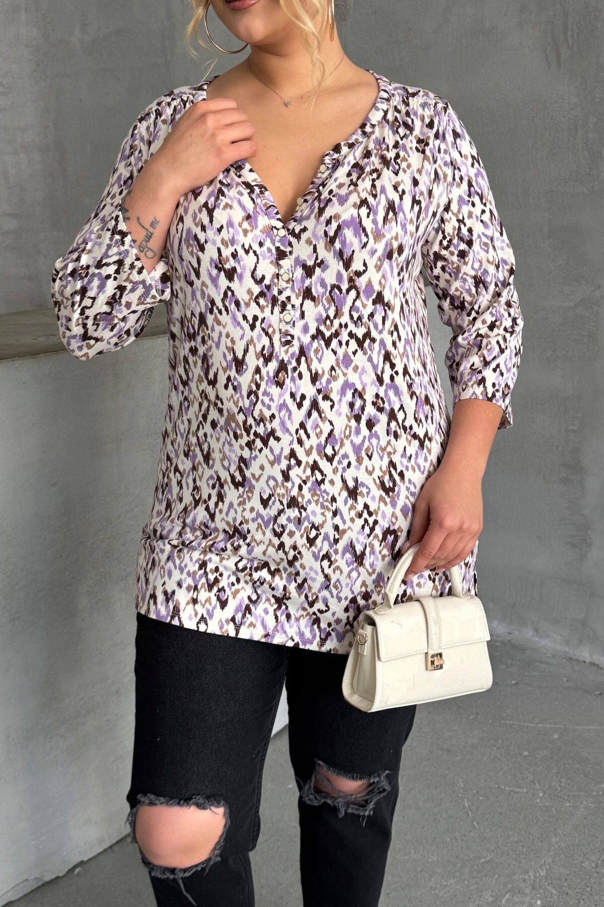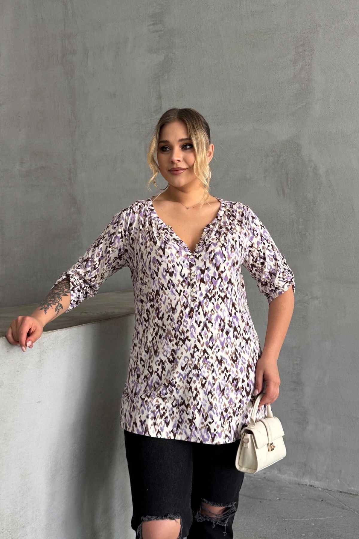 Büyük Beden V Yaka Önü Düğmeli Kolları Katlama Detaylı Likralı Bluz 1017