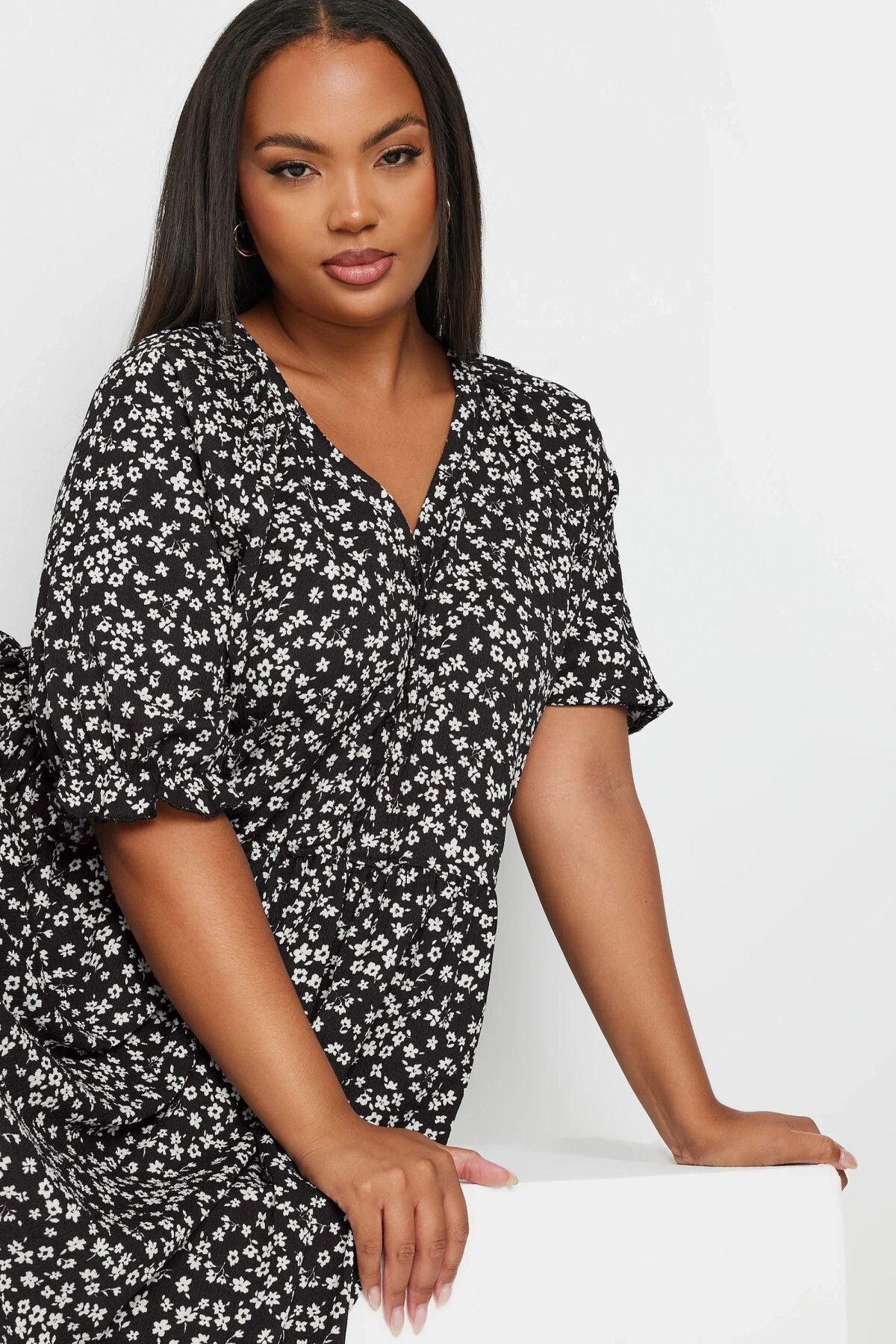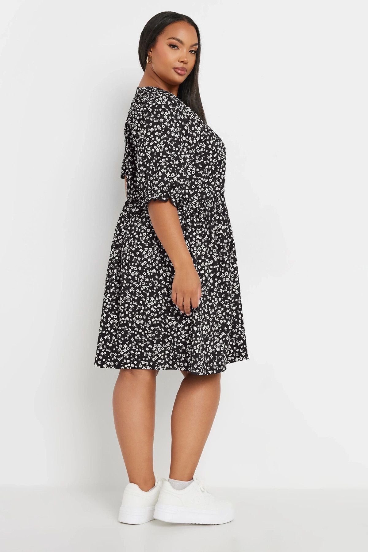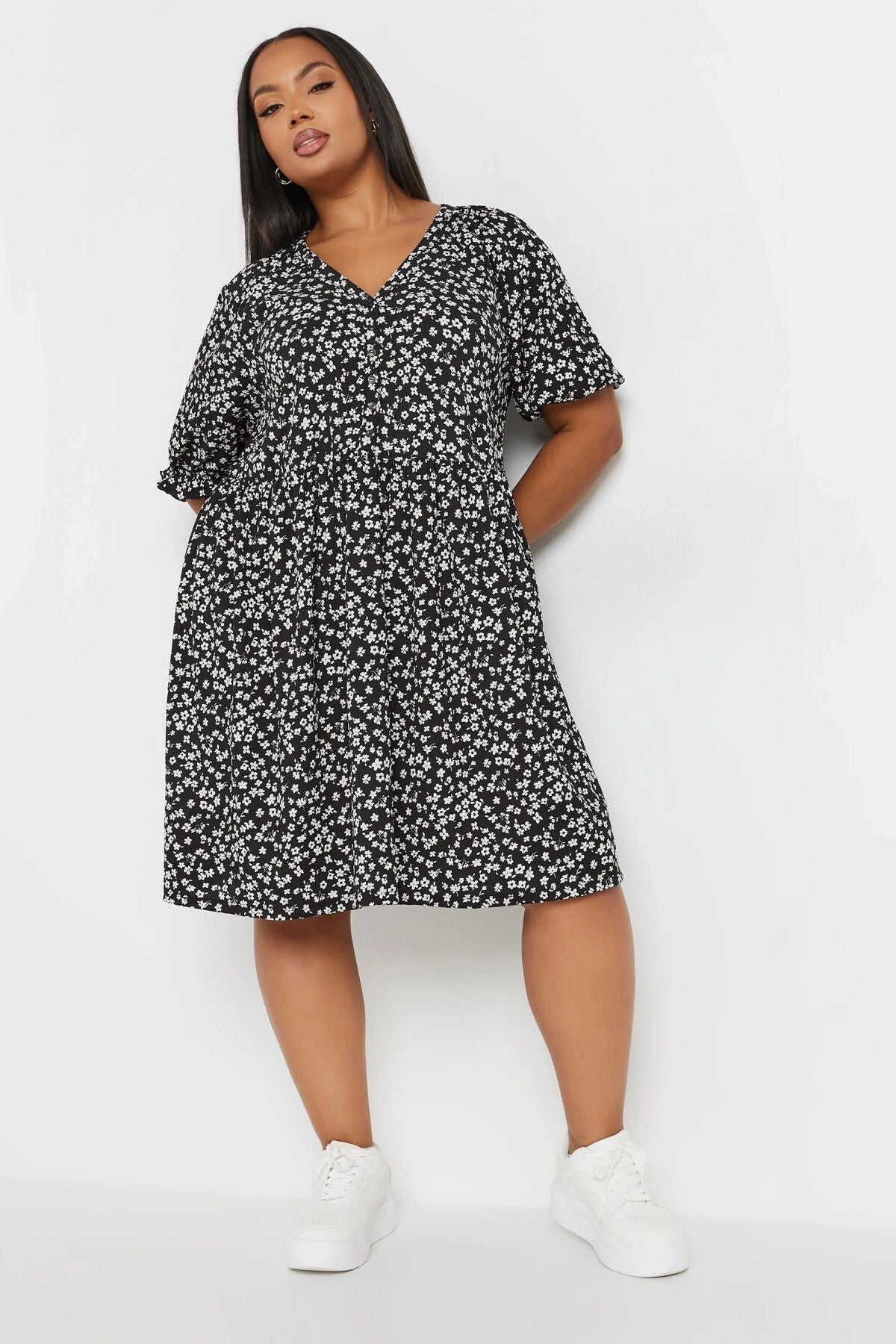 Büyük Beden V Yaka Önü Düğmeli Kolları Lastikli Kısa Elbise 137950