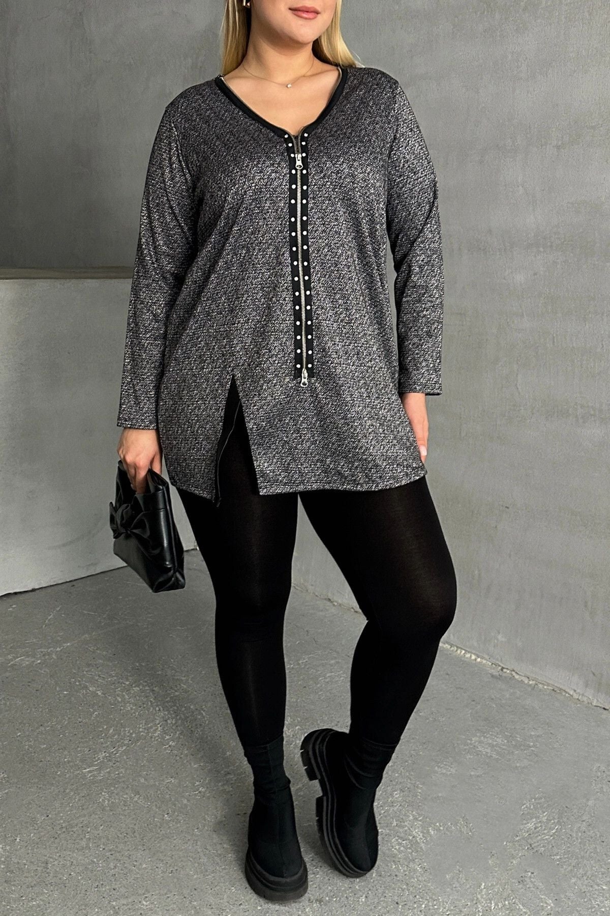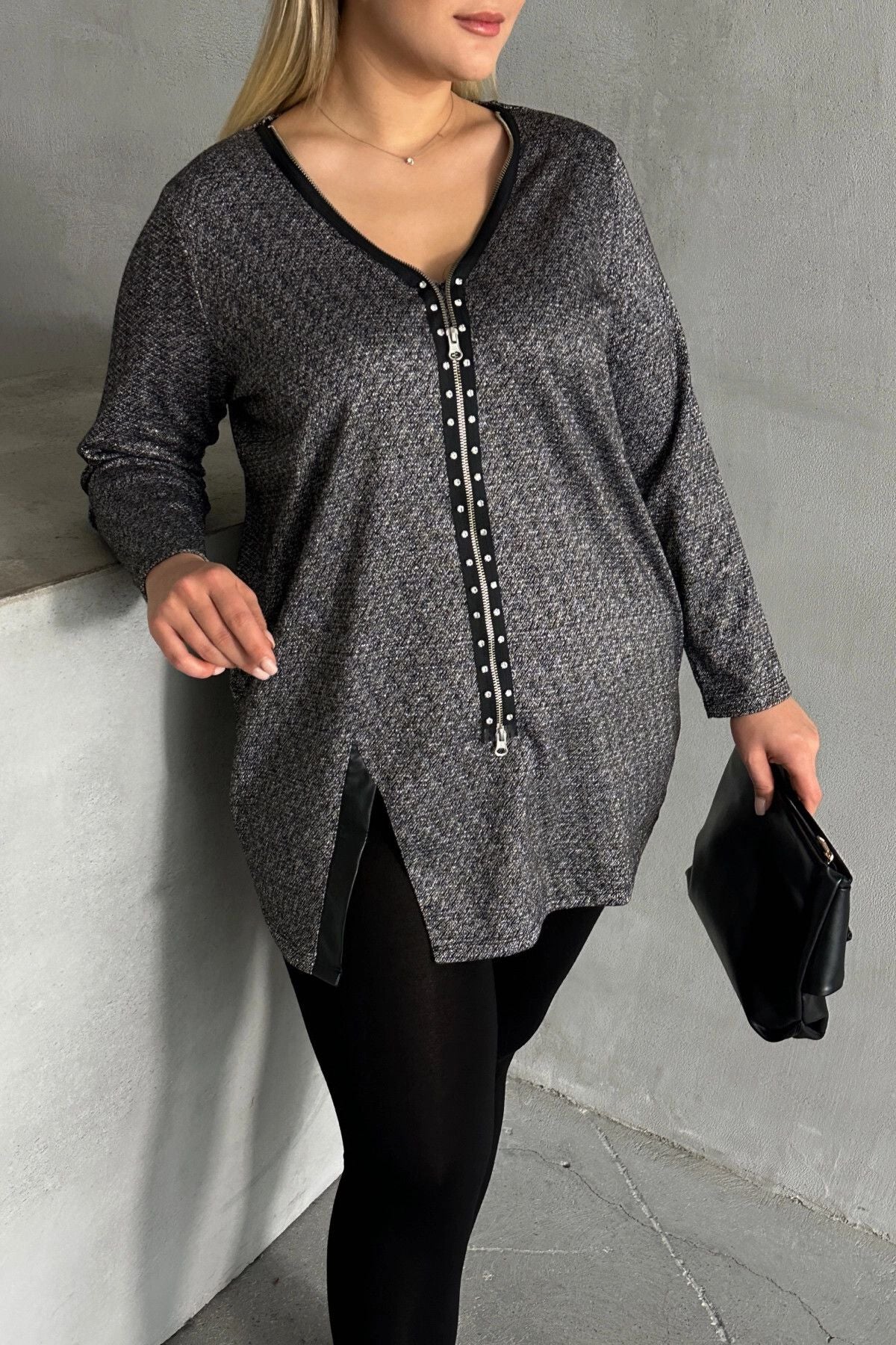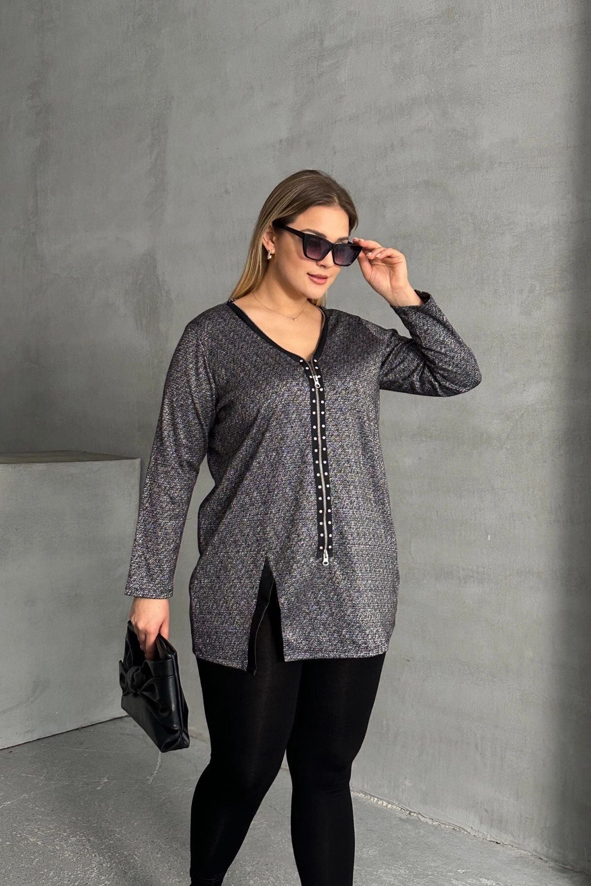 Büyük Beden V Yaka Önü Fermuarlı Yırtmaç Detaylı Bluz 173670