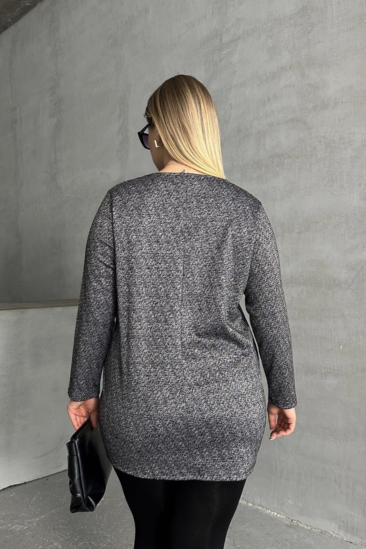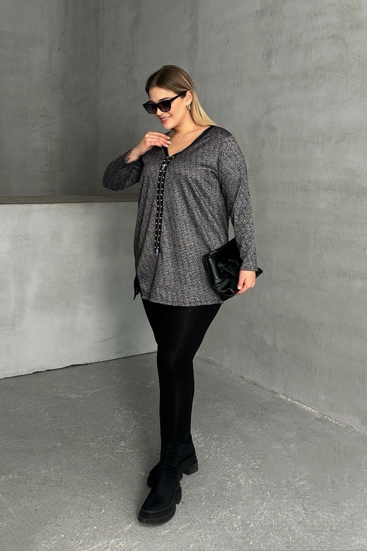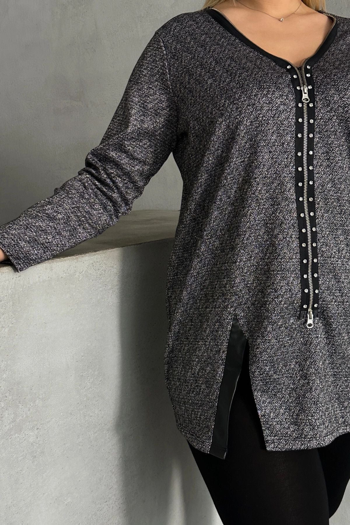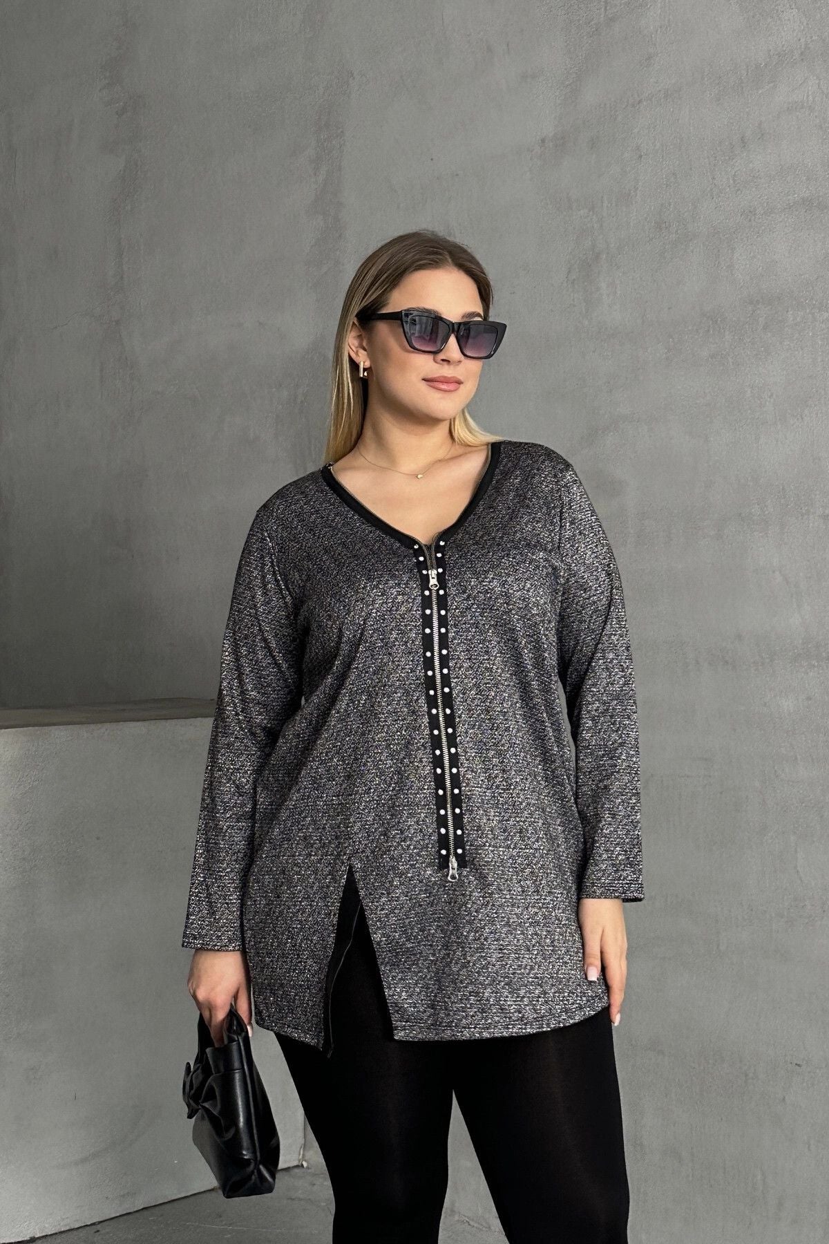 Büyük Beden V Yaka Önü Fermuarlı Yırtmaç Detaylı Bluz 173670