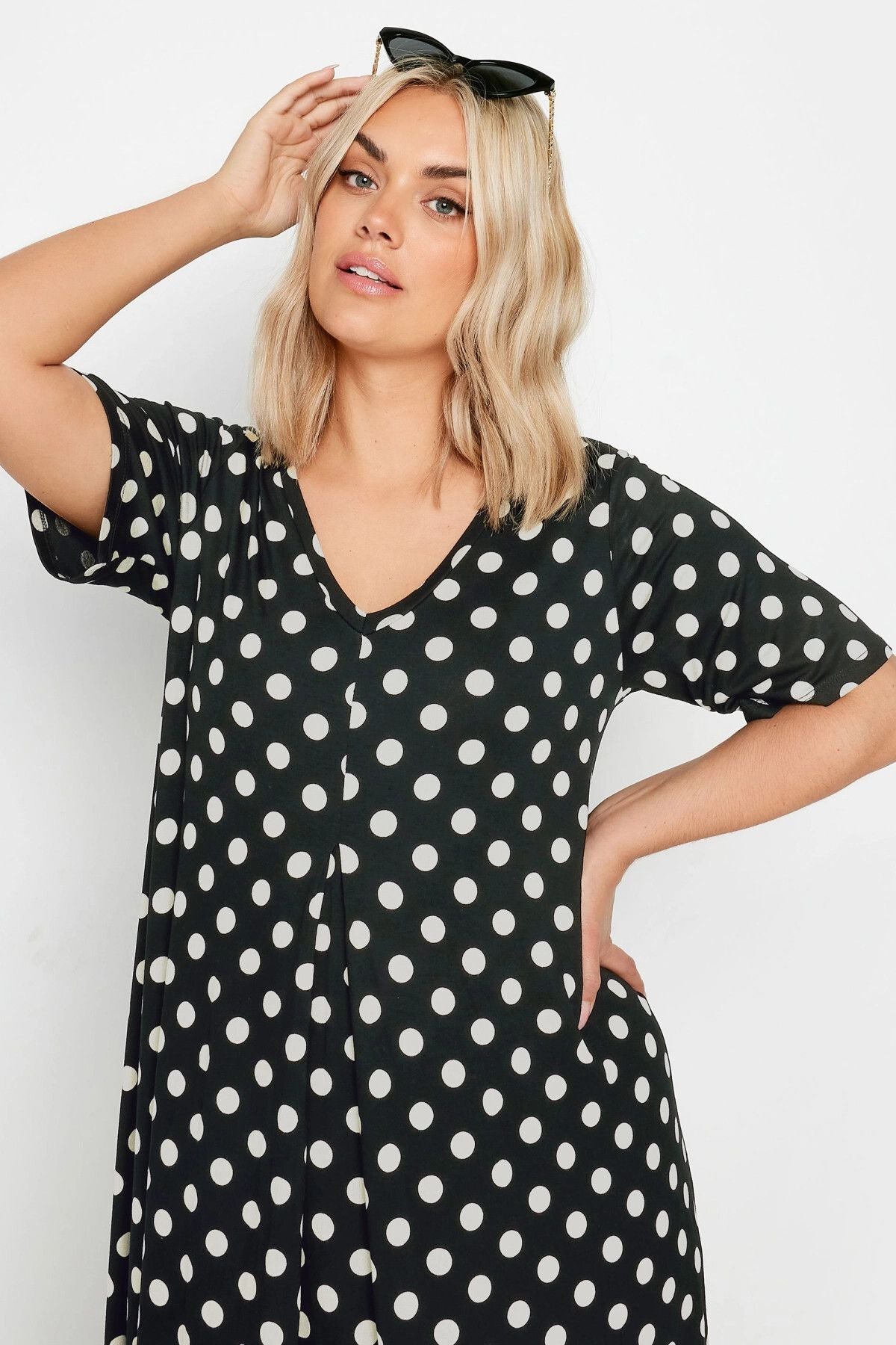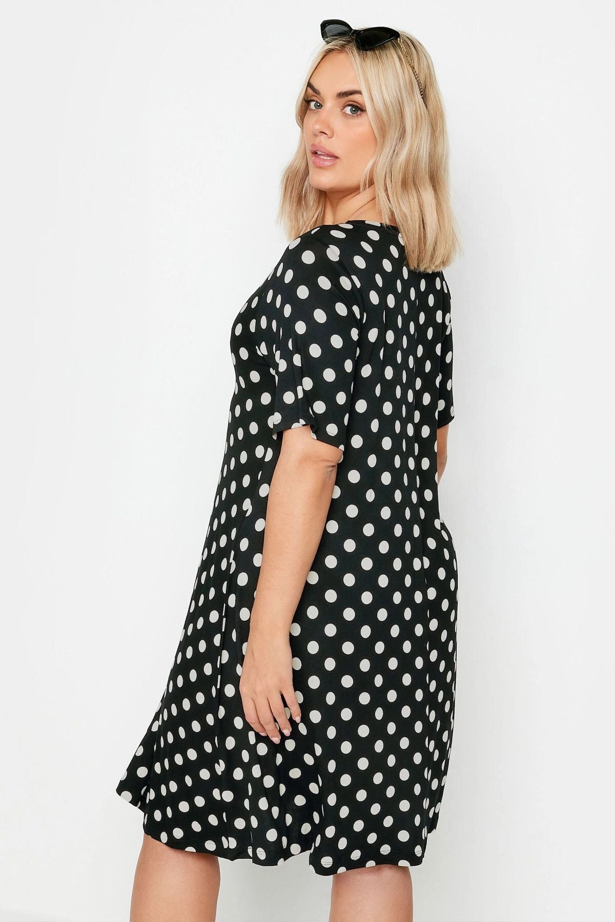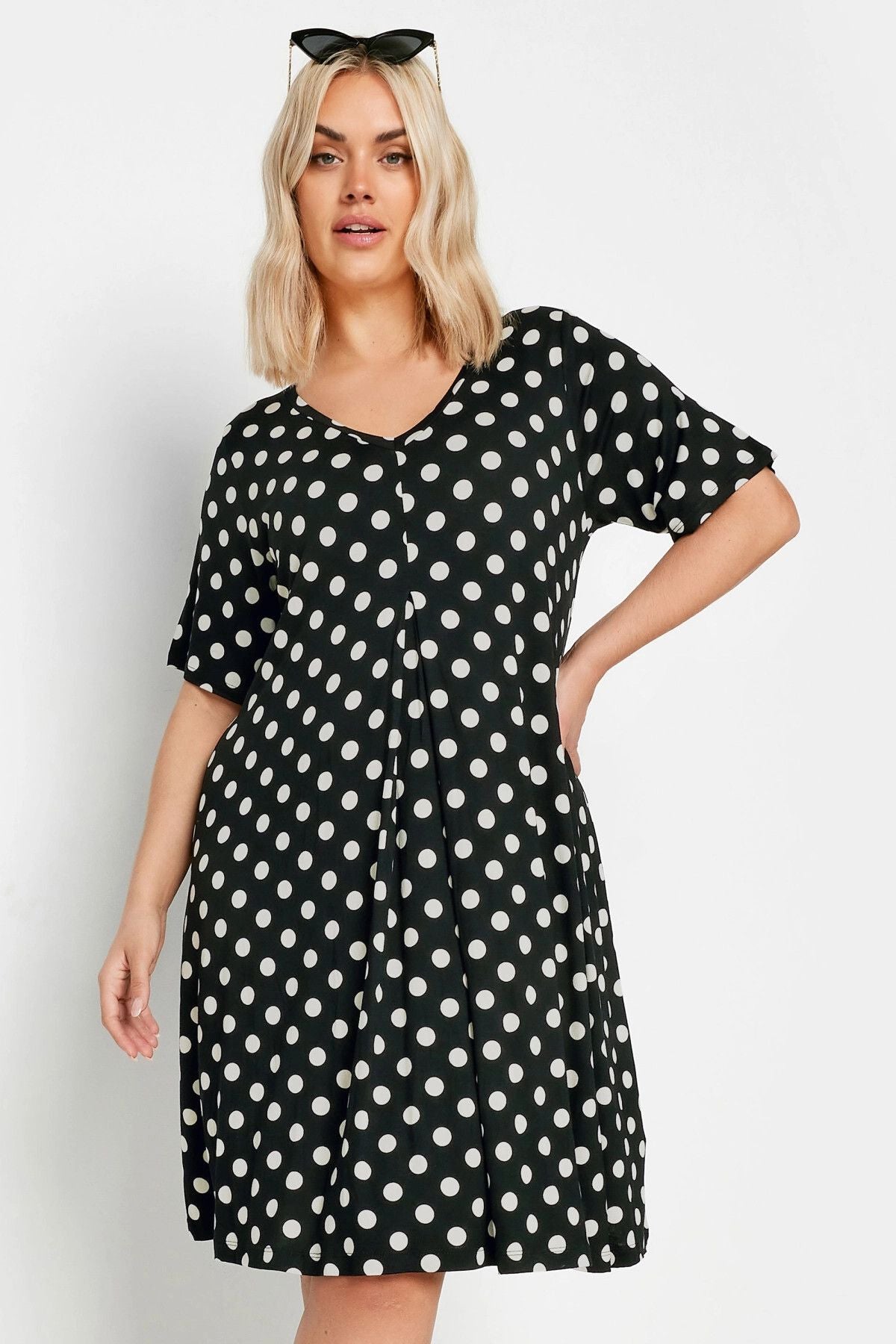 Büyük Beden V Yaka Önü Pliseli Puantiye Desenli Kısa Elbise 303167