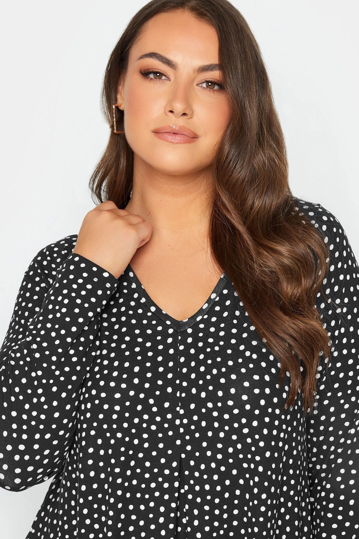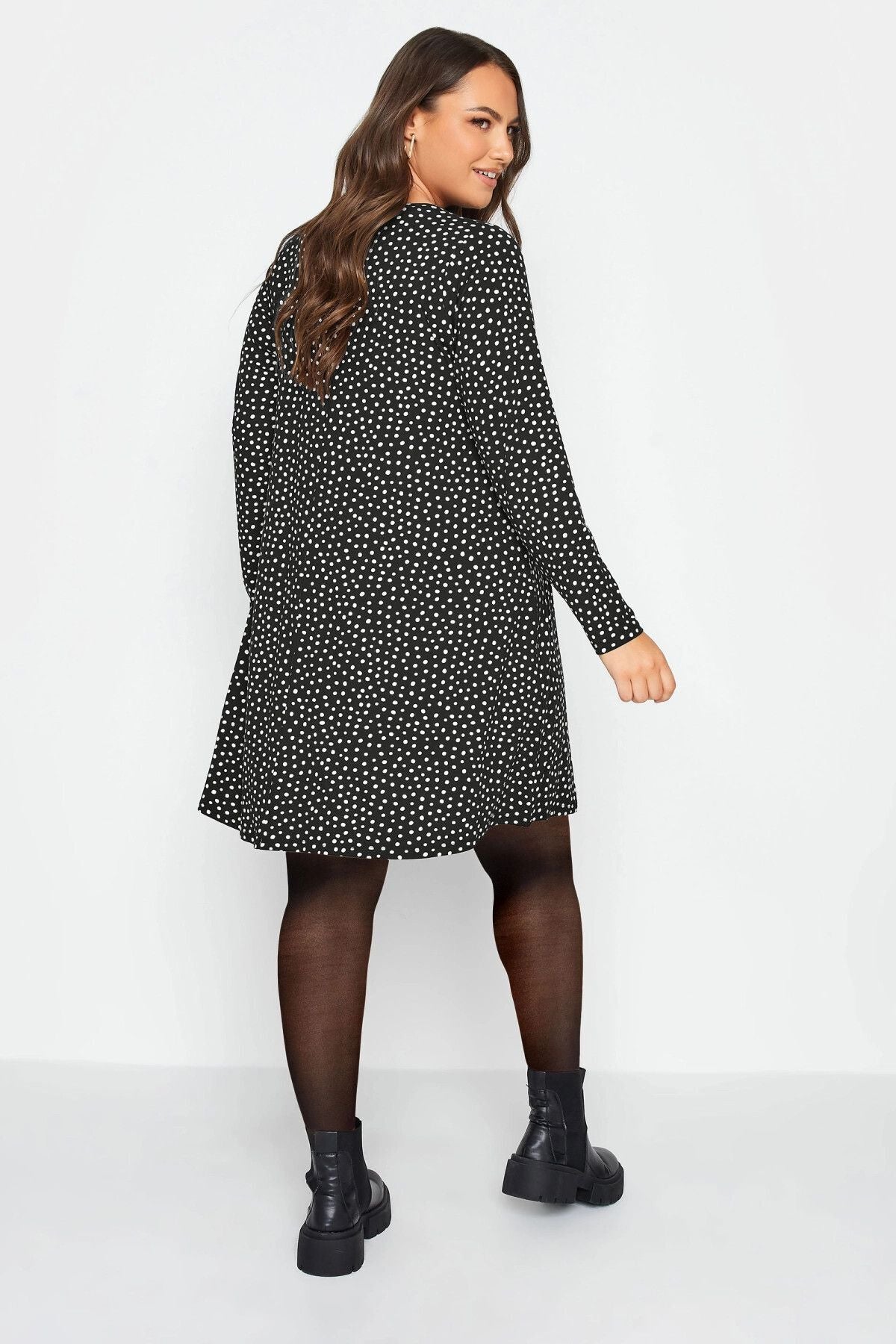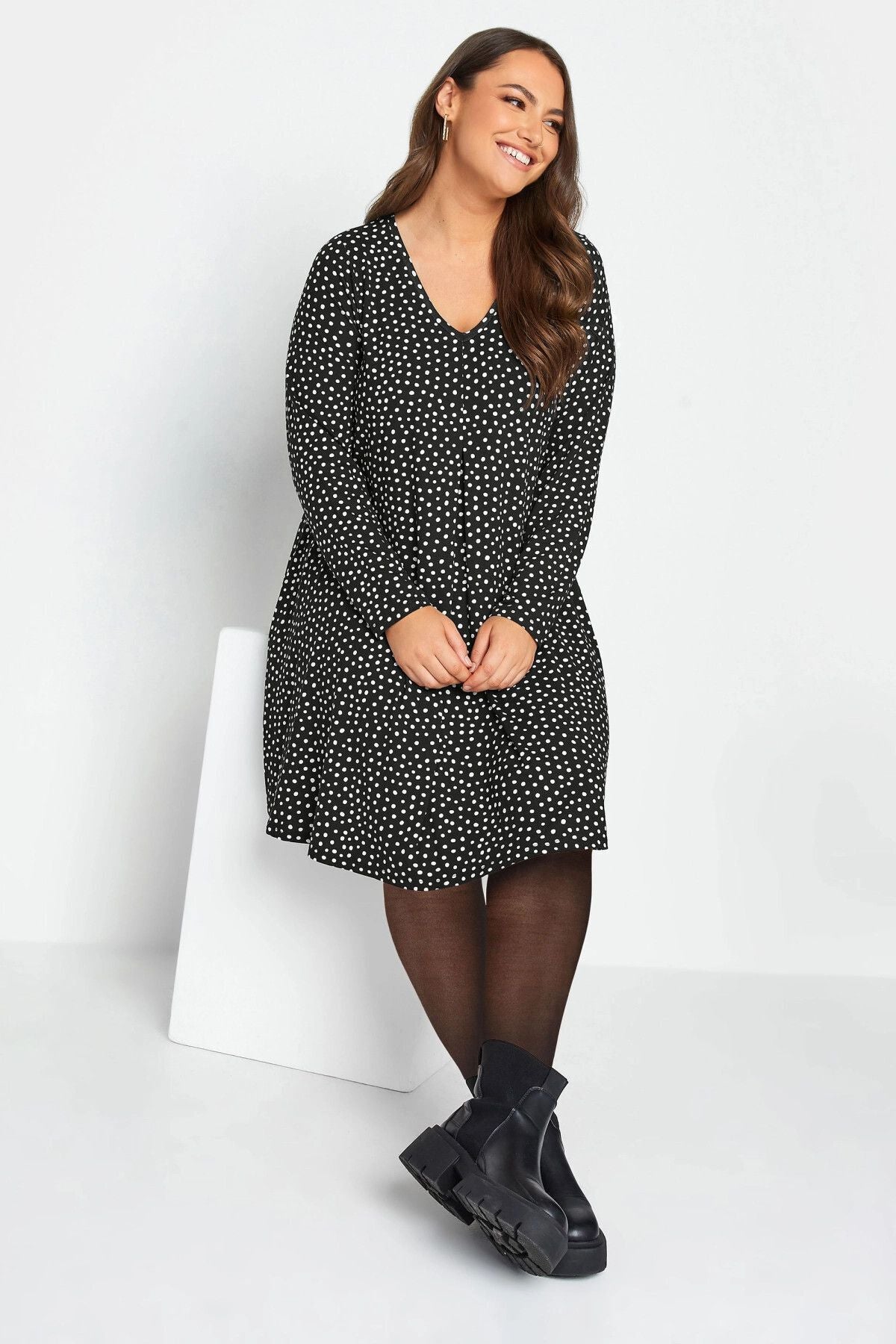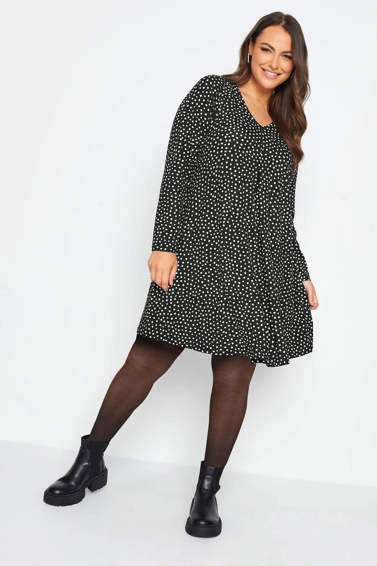 Büyük Beden V Yaka Puantiye Desenli Uzun Kollu Kısa Elbise 137621