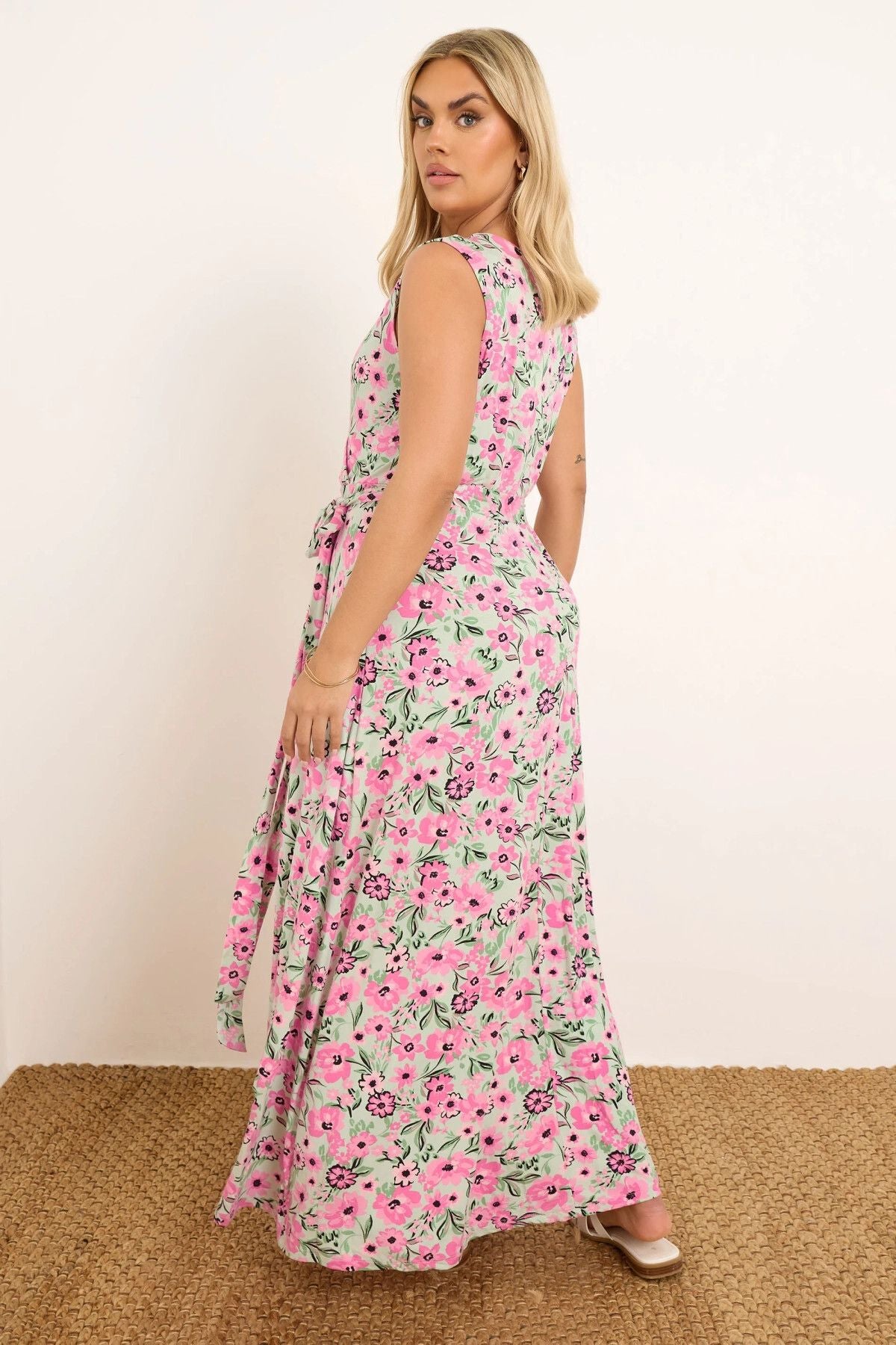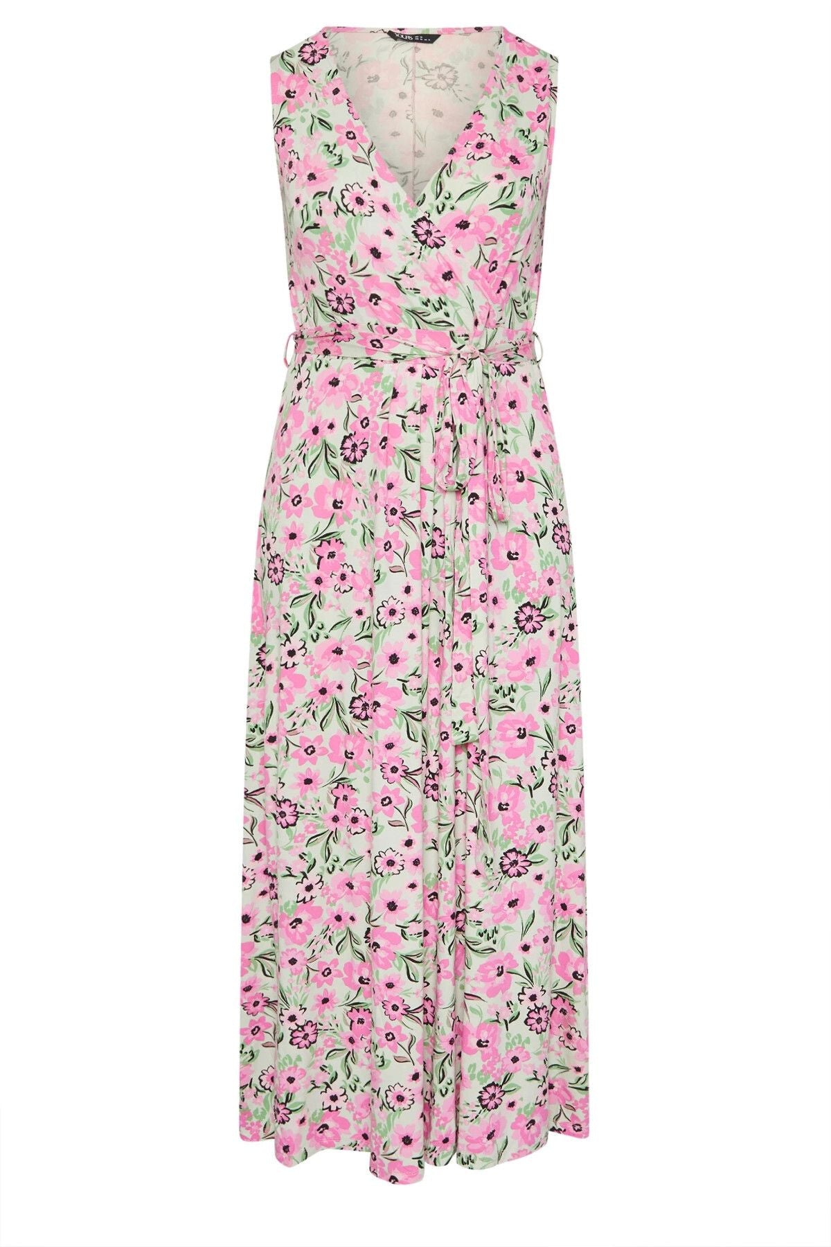 Büyük Beden V Yaka Sıfır Kol Beli Kuşaklı Desenli Maxi Elbise 303990