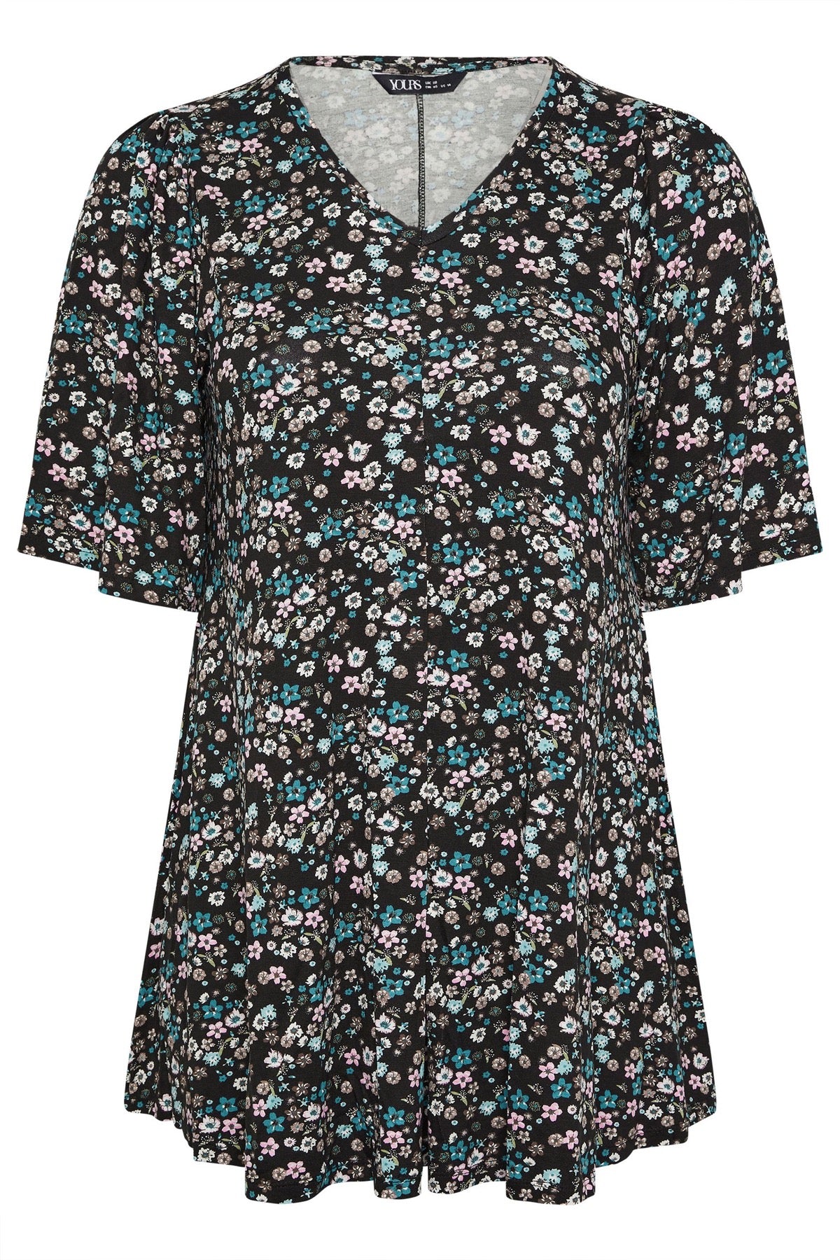 Büyük Beden V Yaka Sıfır Kol Çiçek Desenli Asimetrik Kesim T-shirt 304084