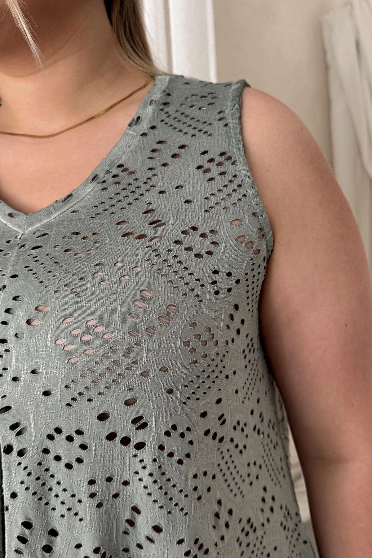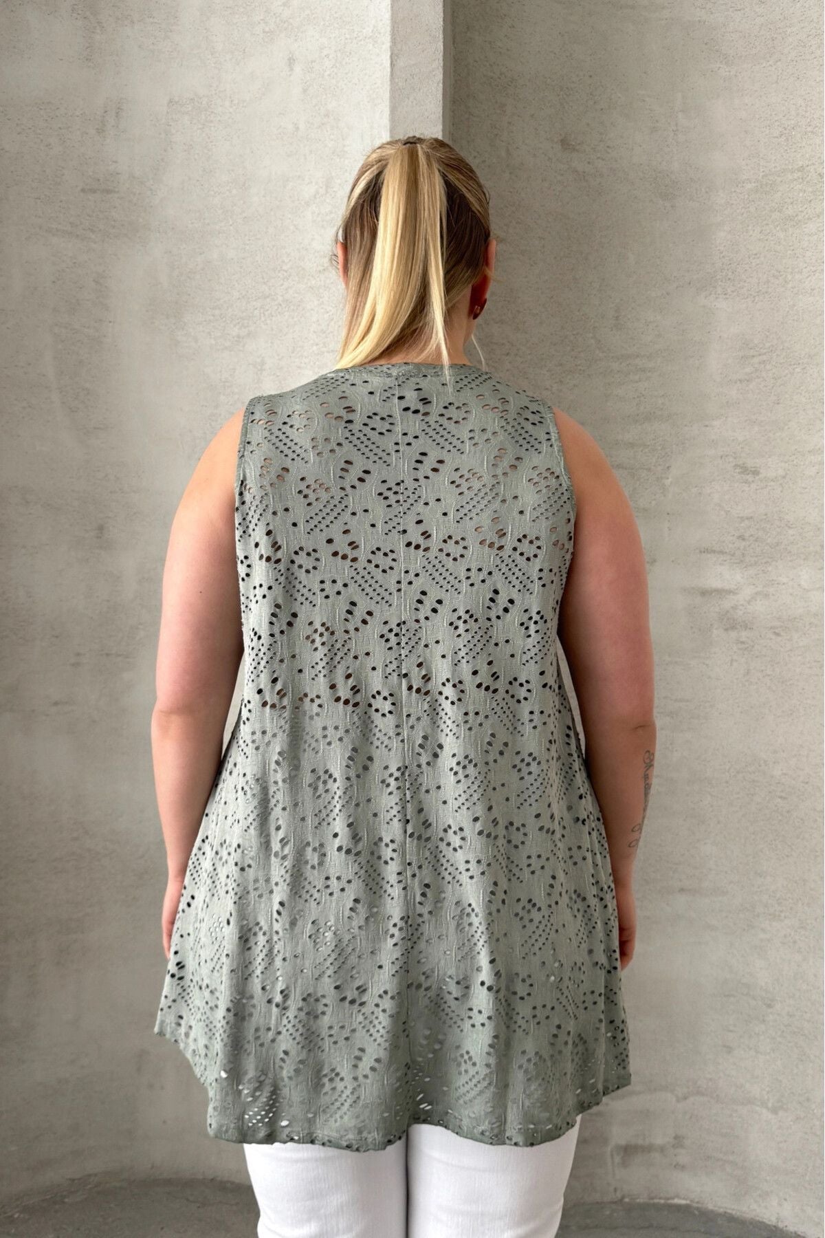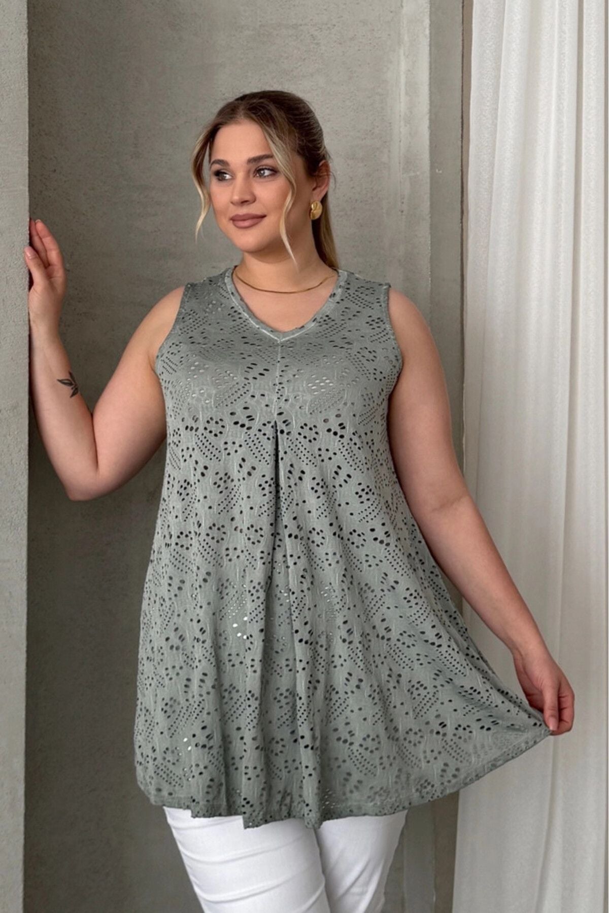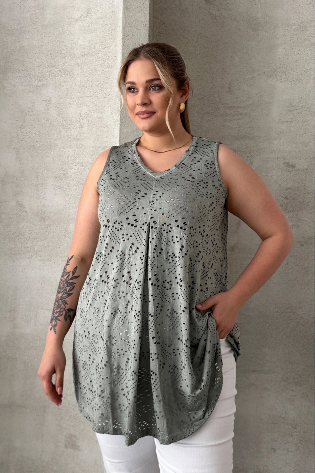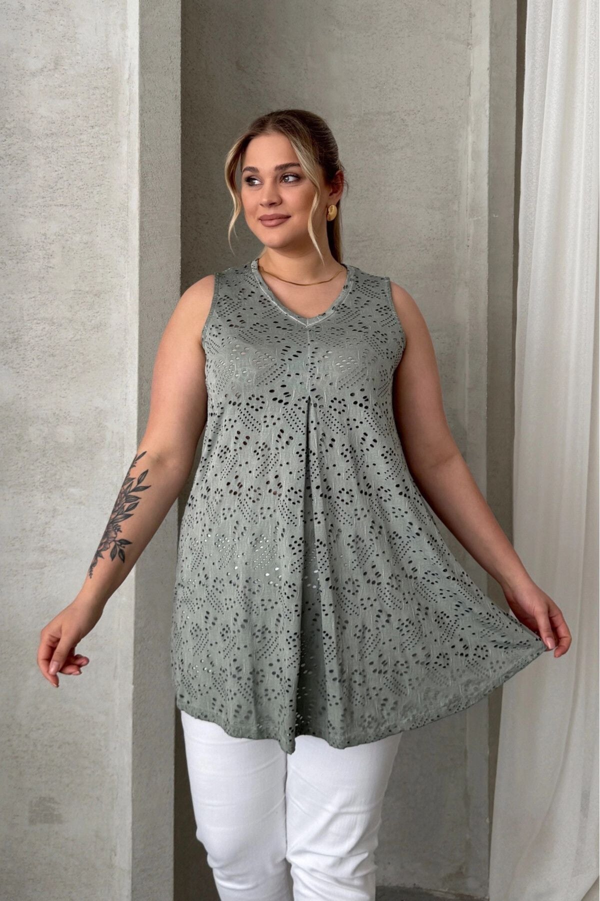 Büyük Beden V Yaka Sıfır Kol Dantel Detaylı Astarsız Bluz 302964