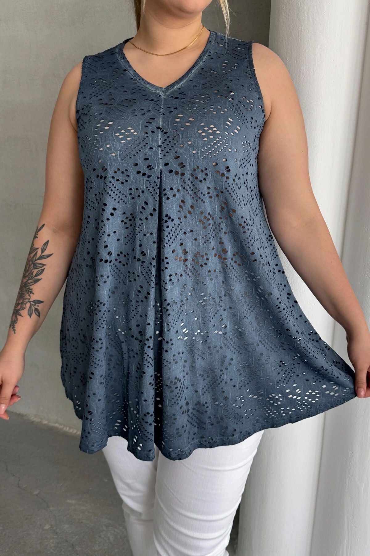 Büyük Beden V Yaka Sıfır Kol Dantel Detaylı Astarsız Bluz 302966