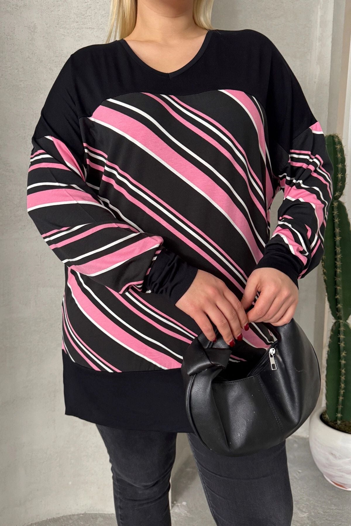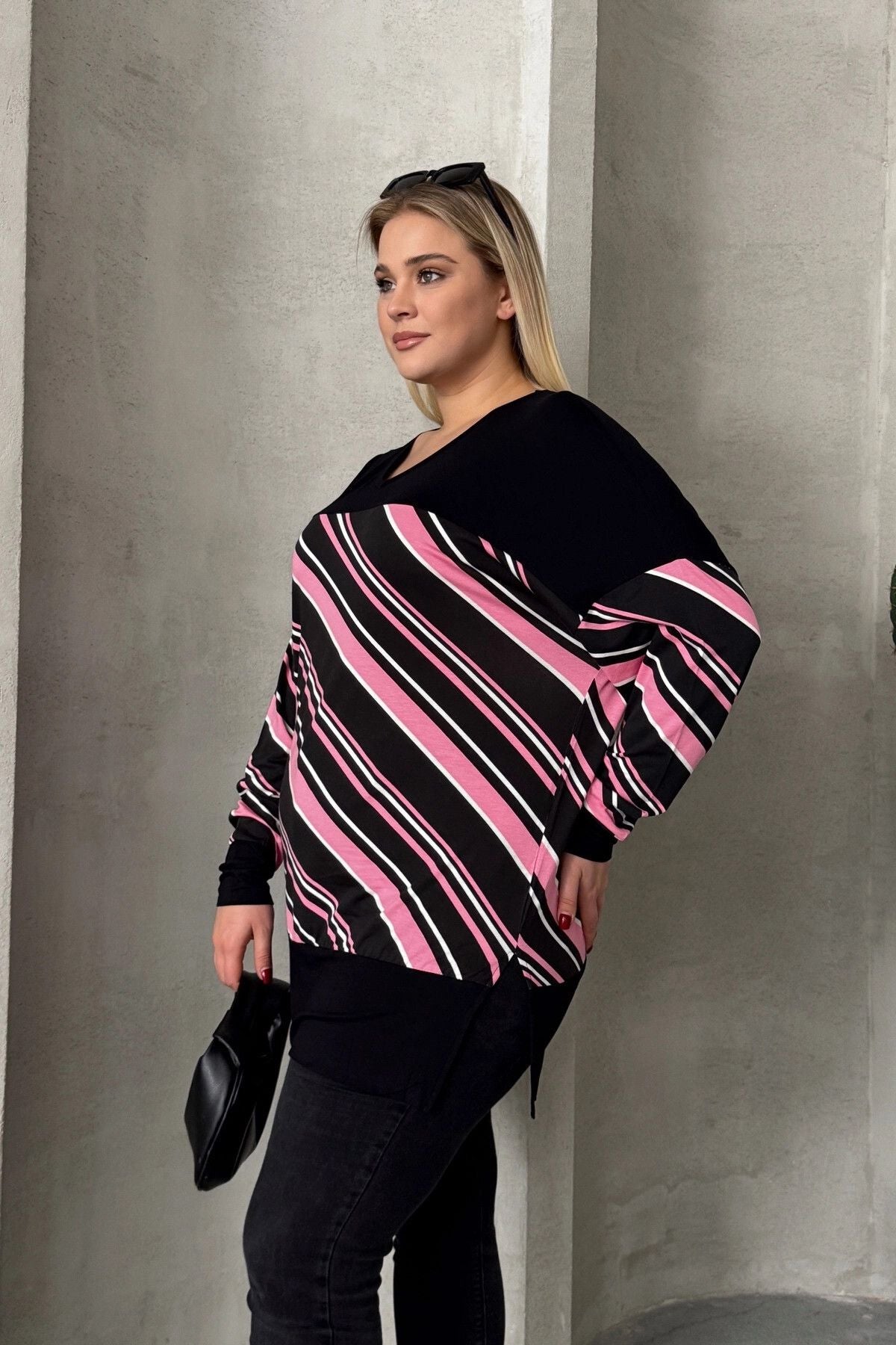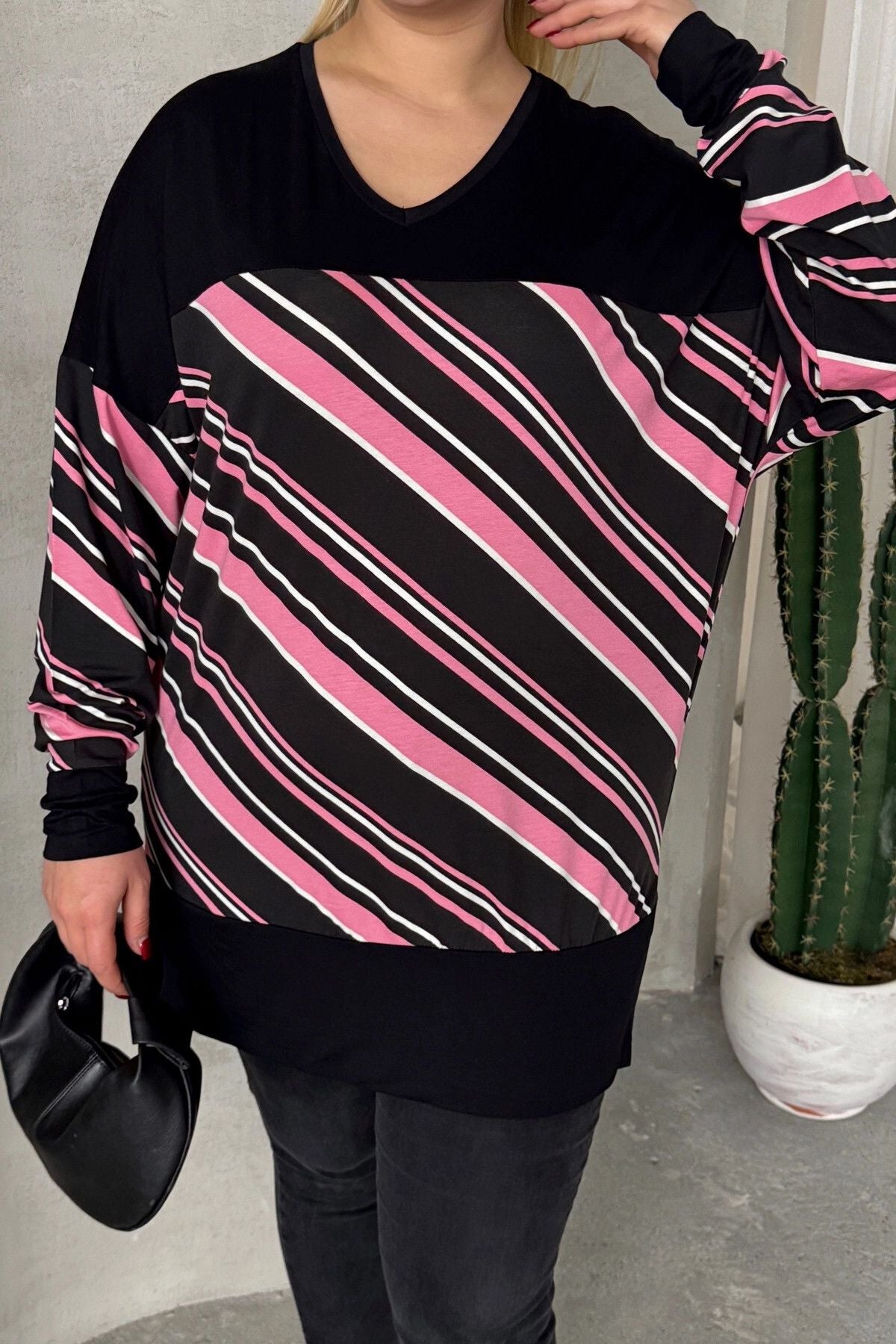 Büyük Beden V Yaka Uzun Kollu Bileği Lastikli Yırtmaçlı Bluz 303086