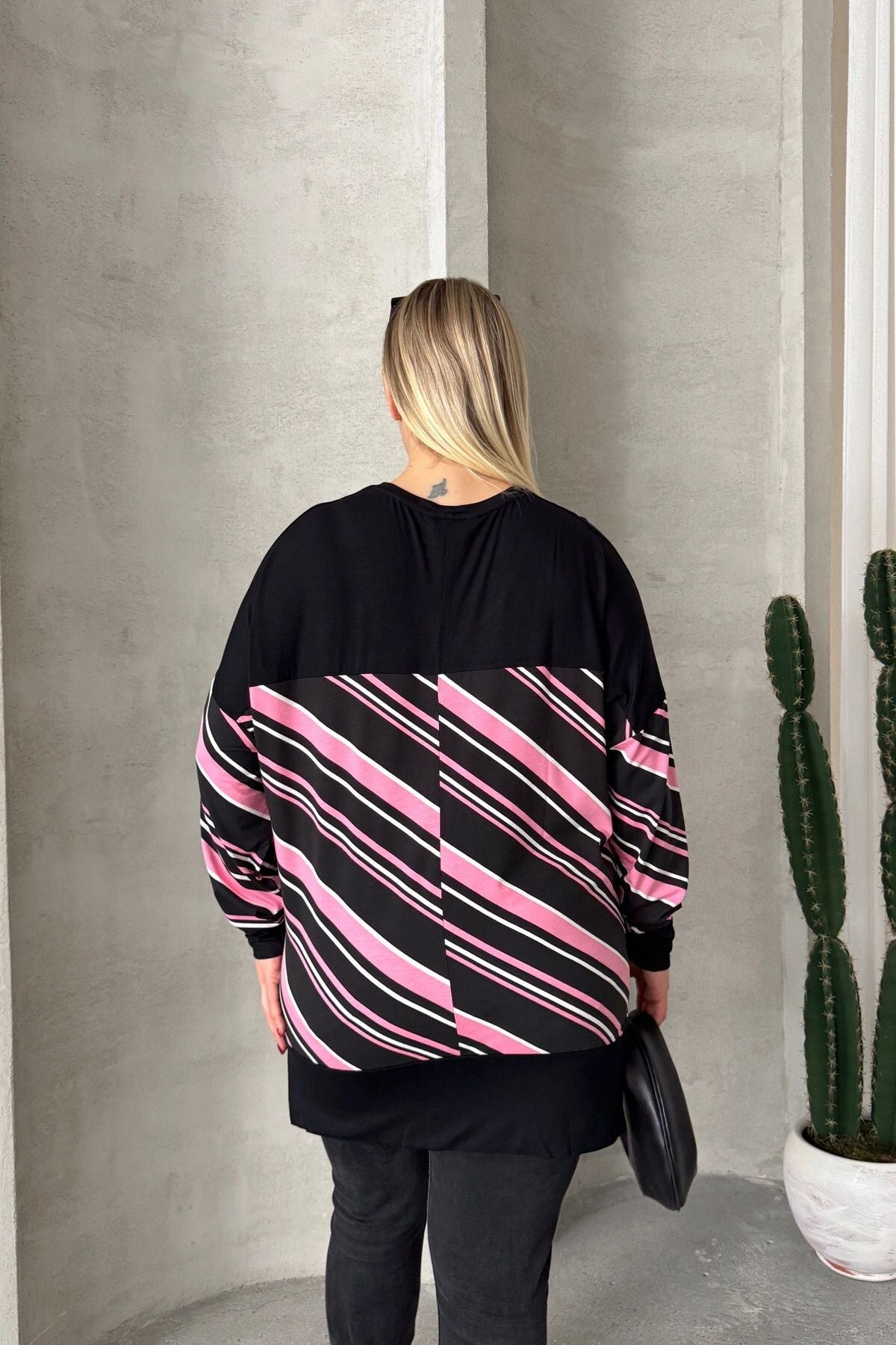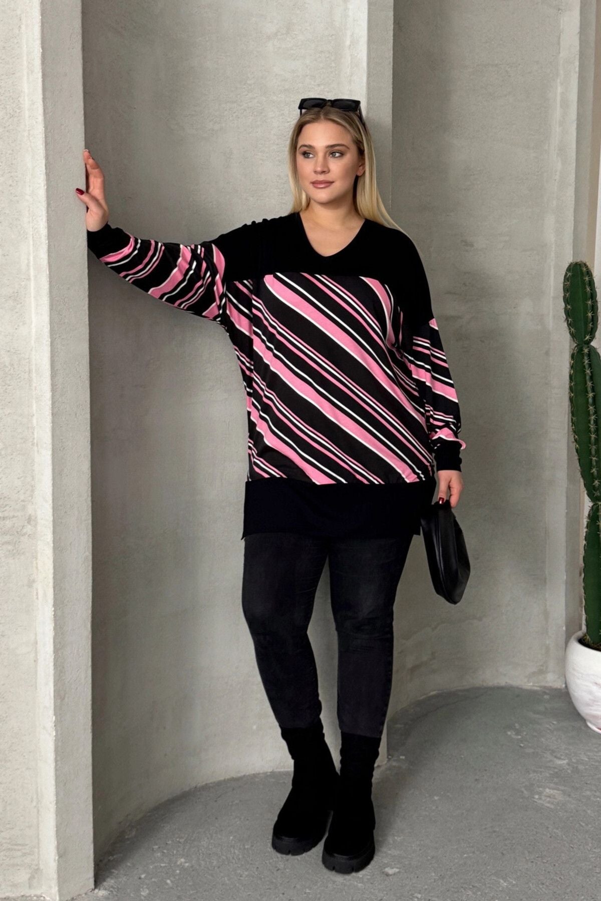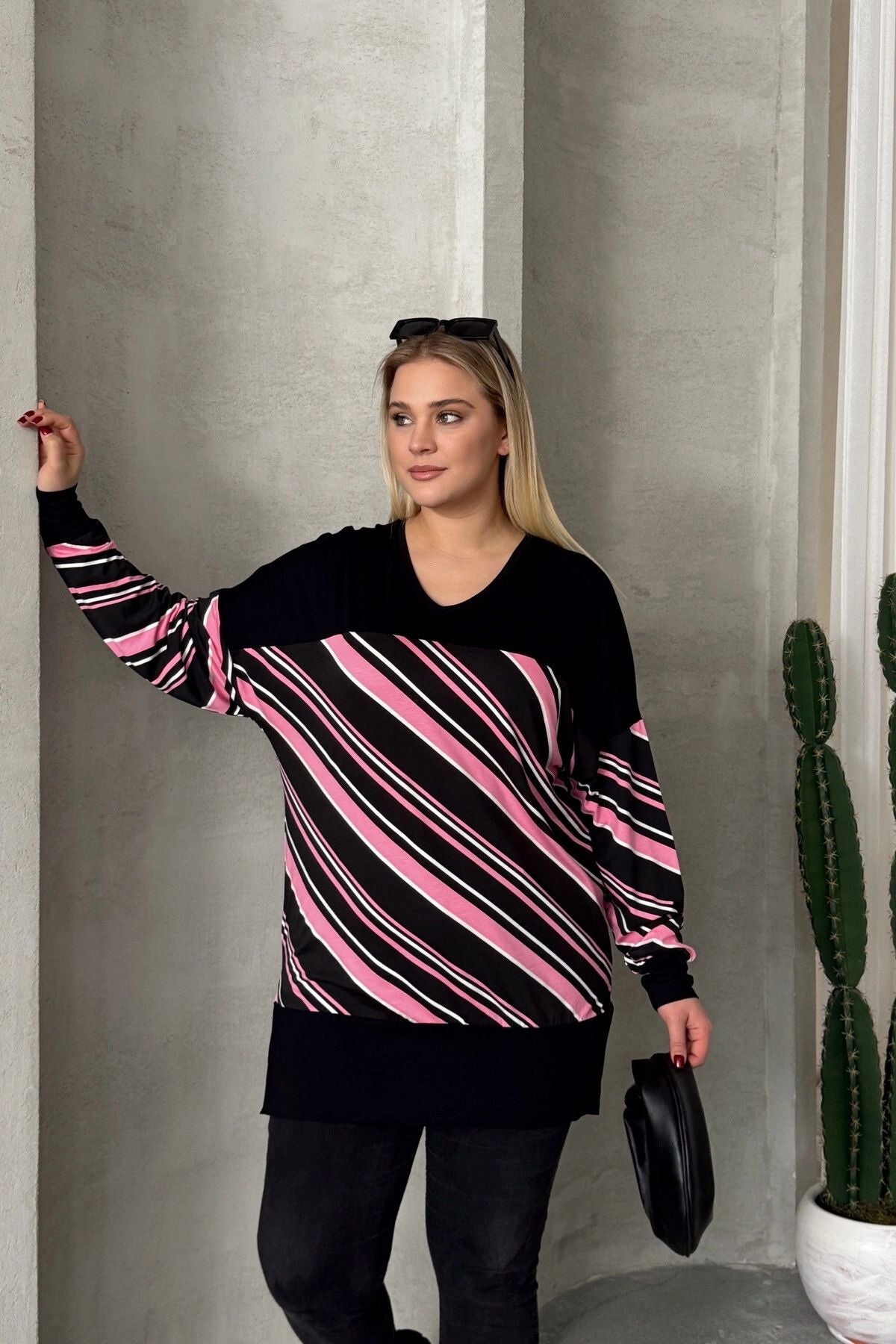 Büyük Beden V Yaka Uzun Kollu Bileği Lastikli Yırtmaçlı Bluz 303086