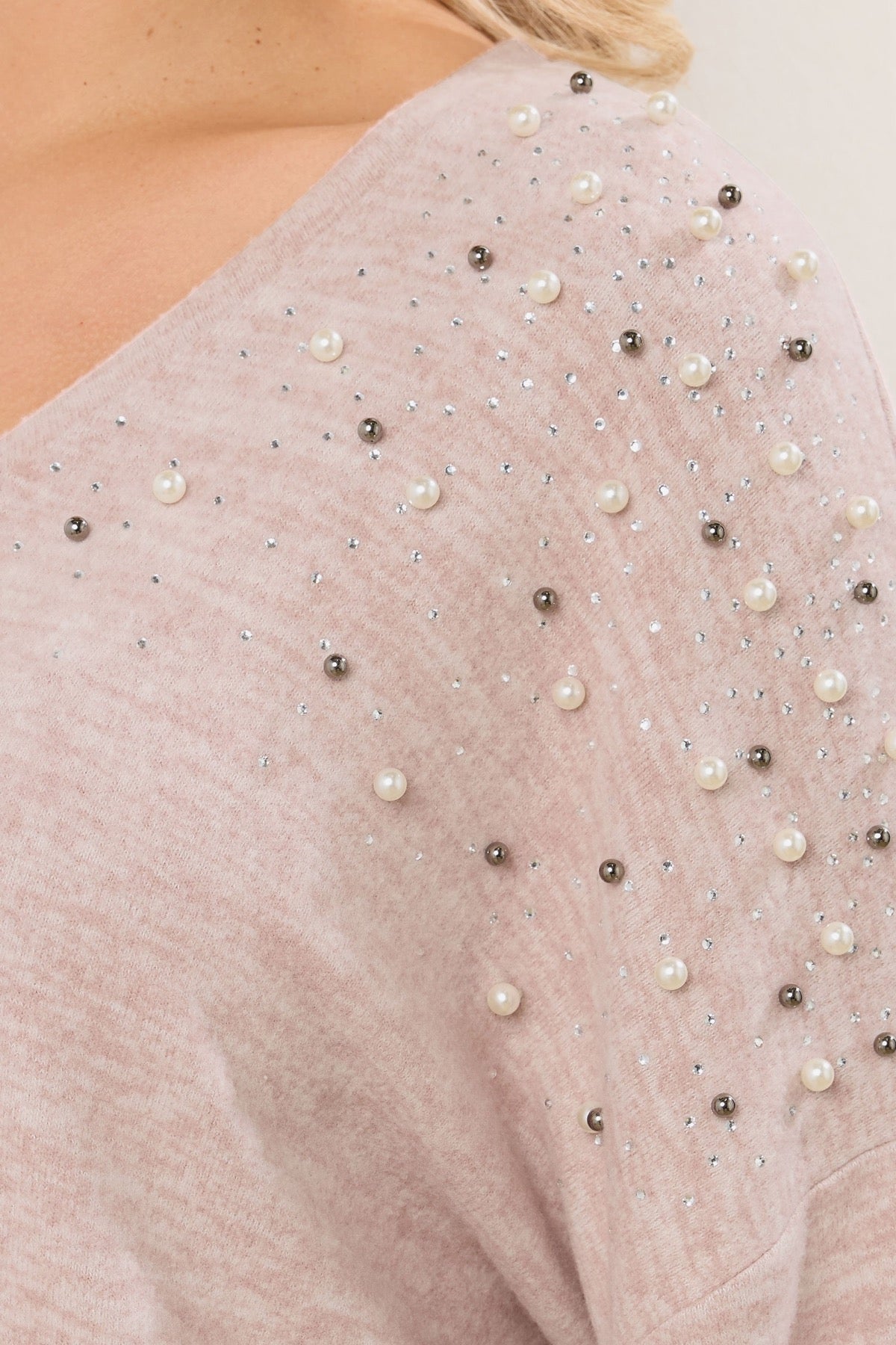Büyük Beden V Yaka Uzun Kollu Boncuklu Peluş Sweatshirt 285055