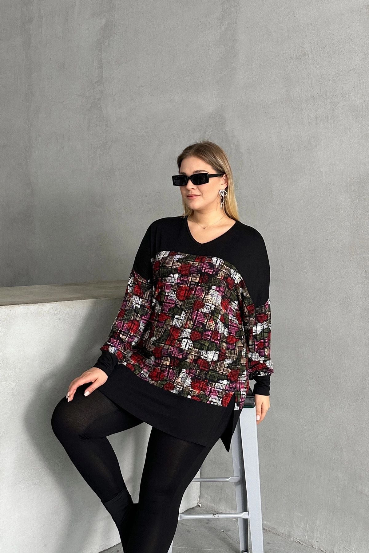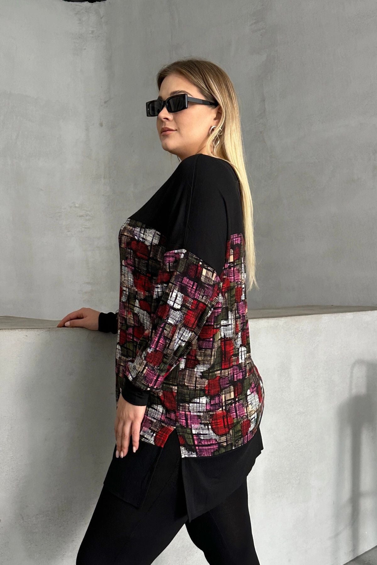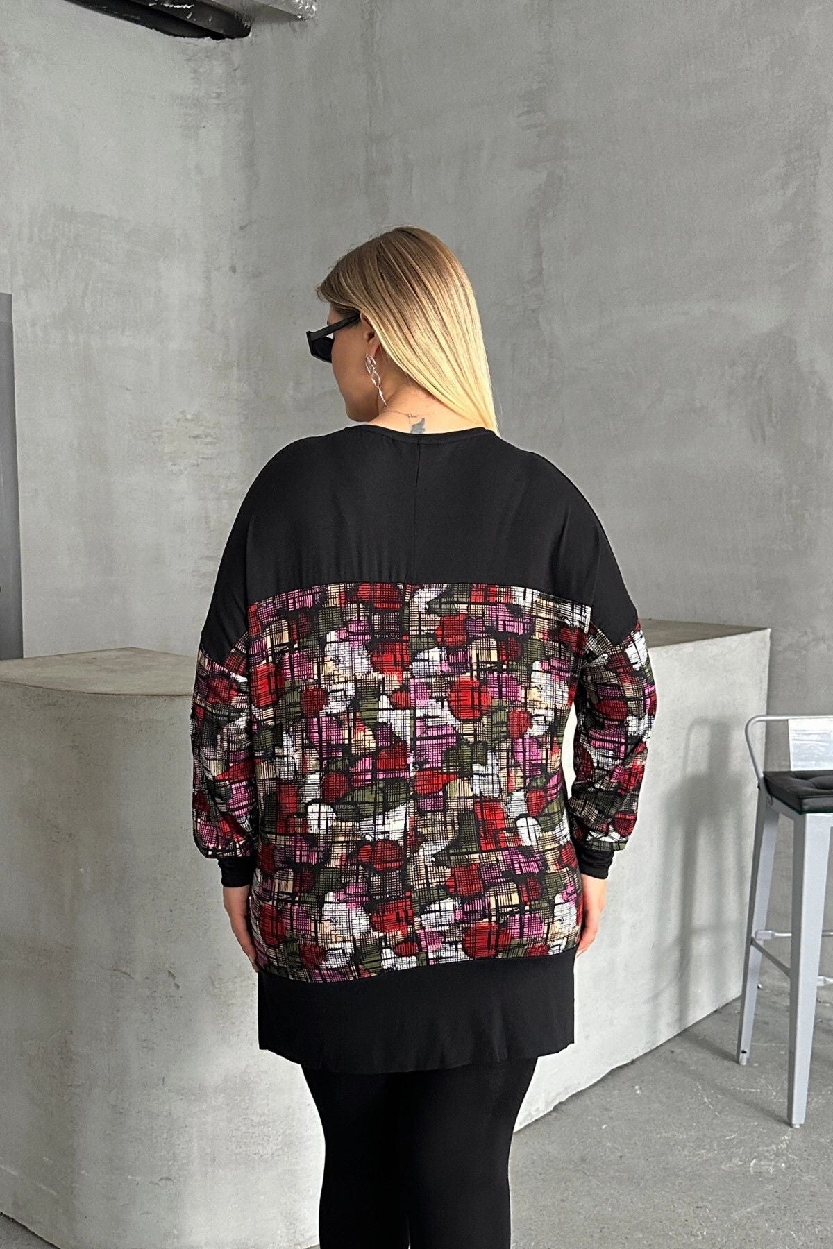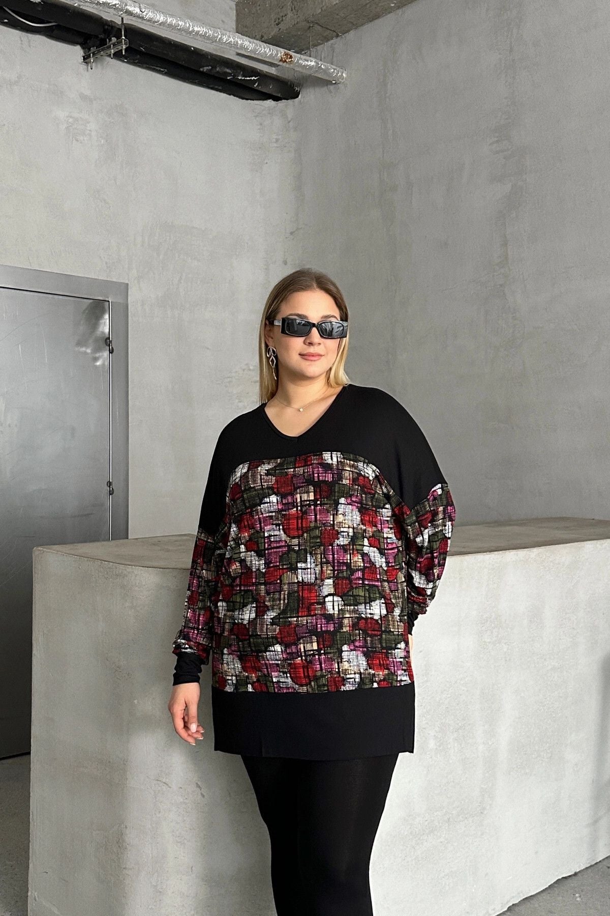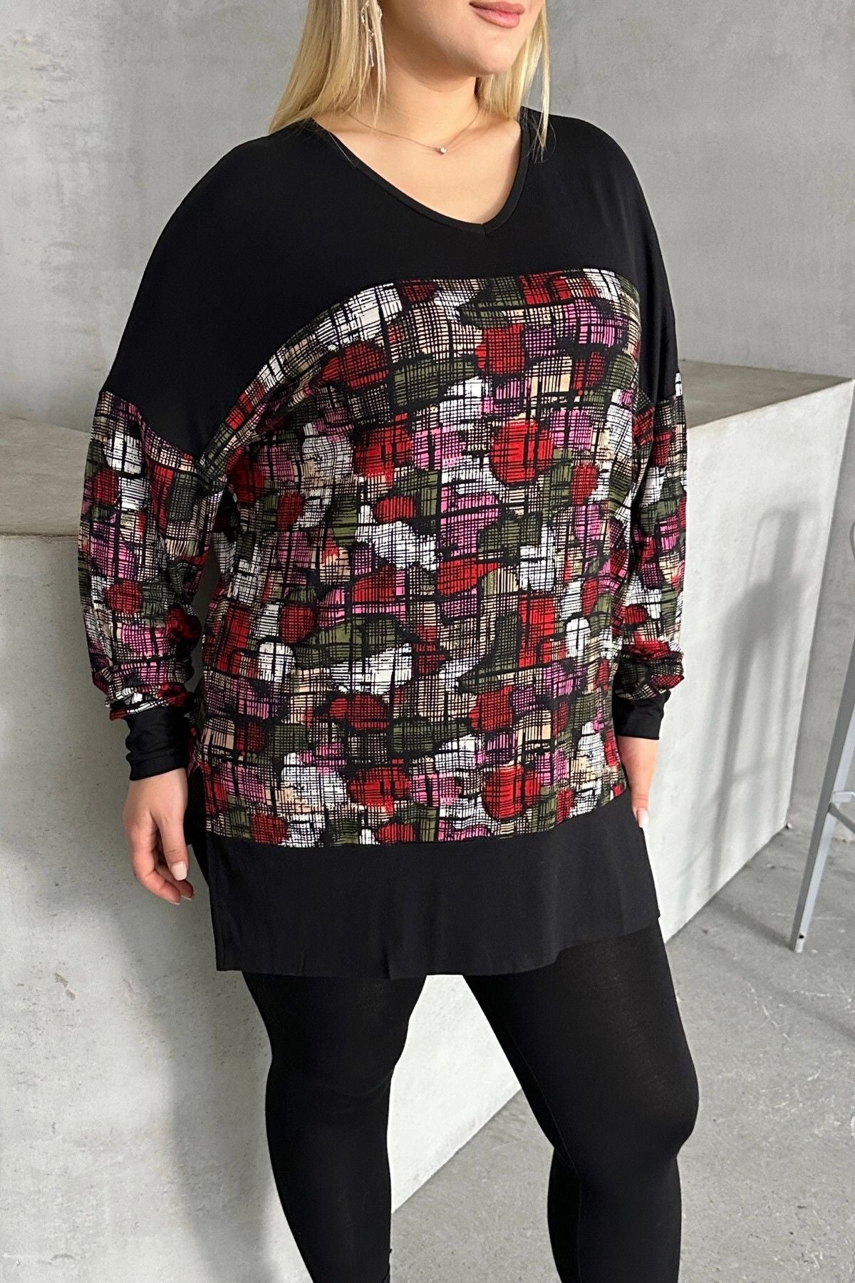 Büyük Beden V Yaka Uzun Kollu Desenli Likralı Bluz 303363