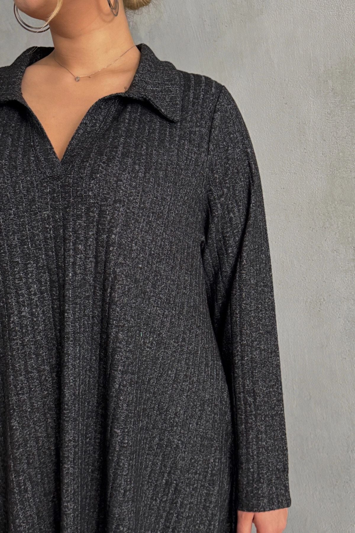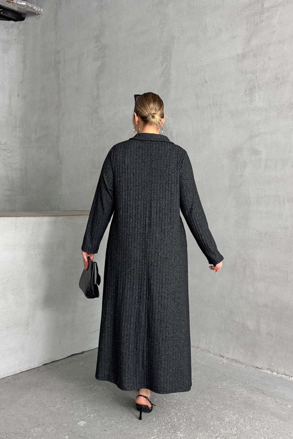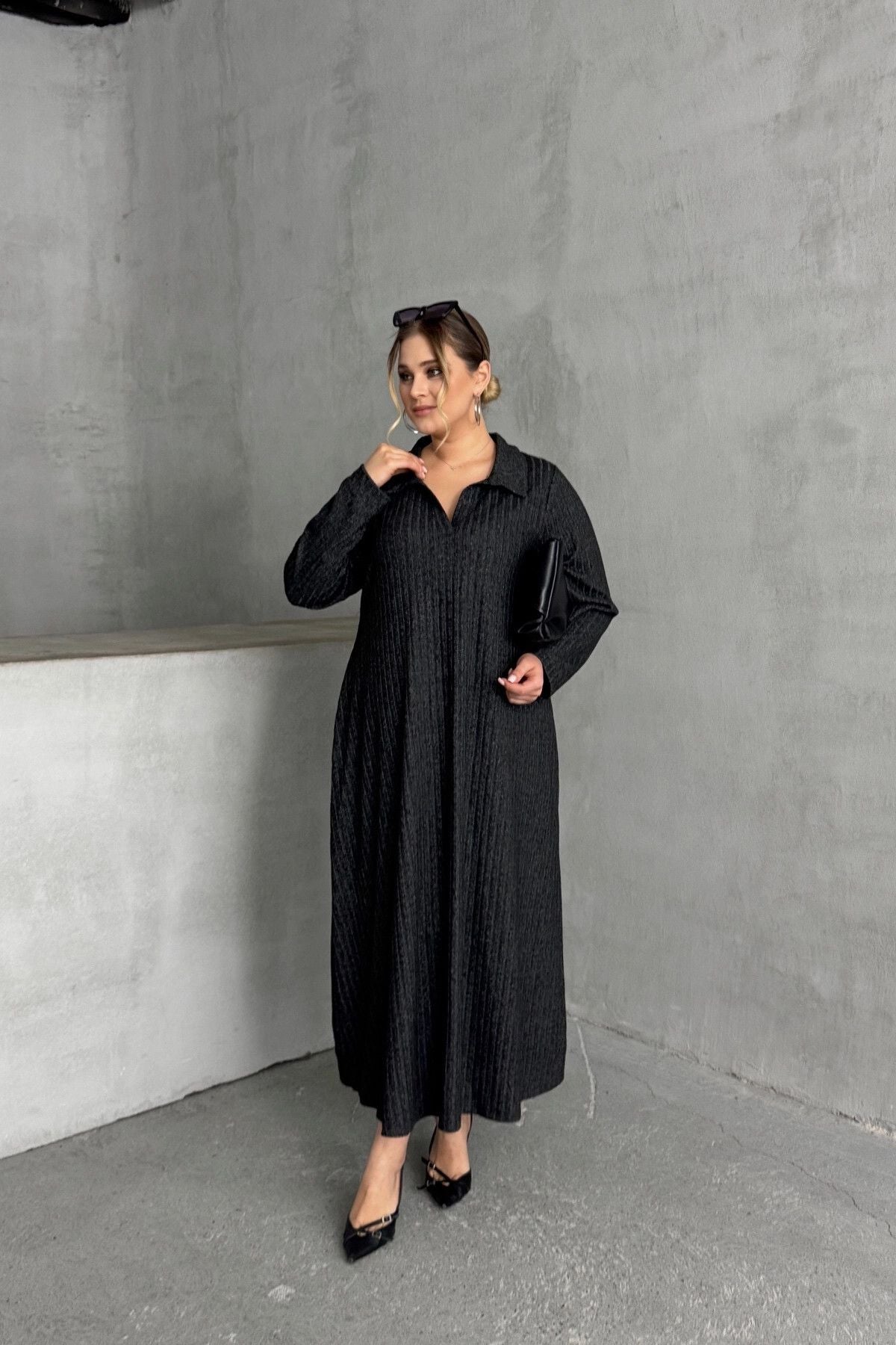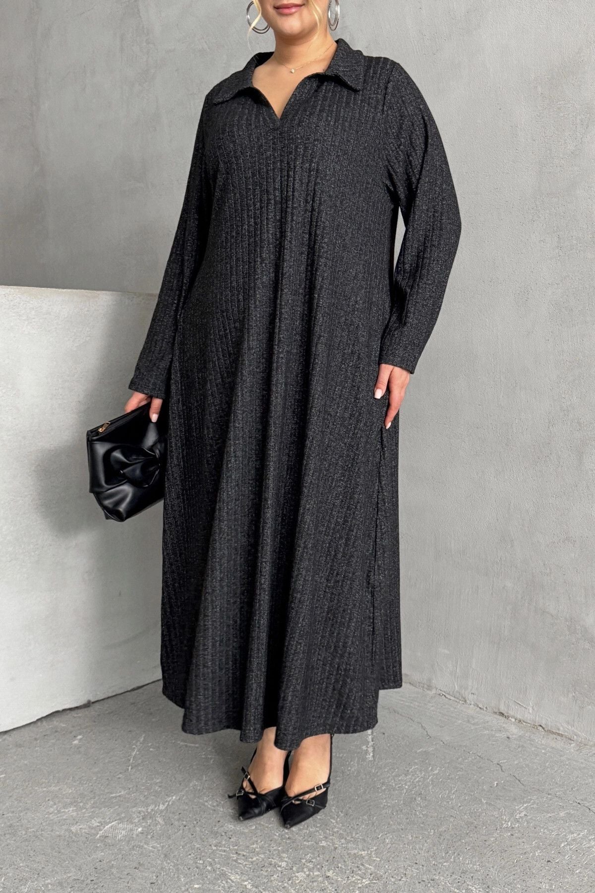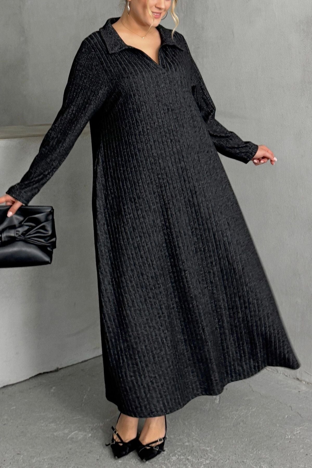 Büyük Beden V Yaka Uzun Kollu Fitilli Eteği Bollaşan Uzun Elbise 322181