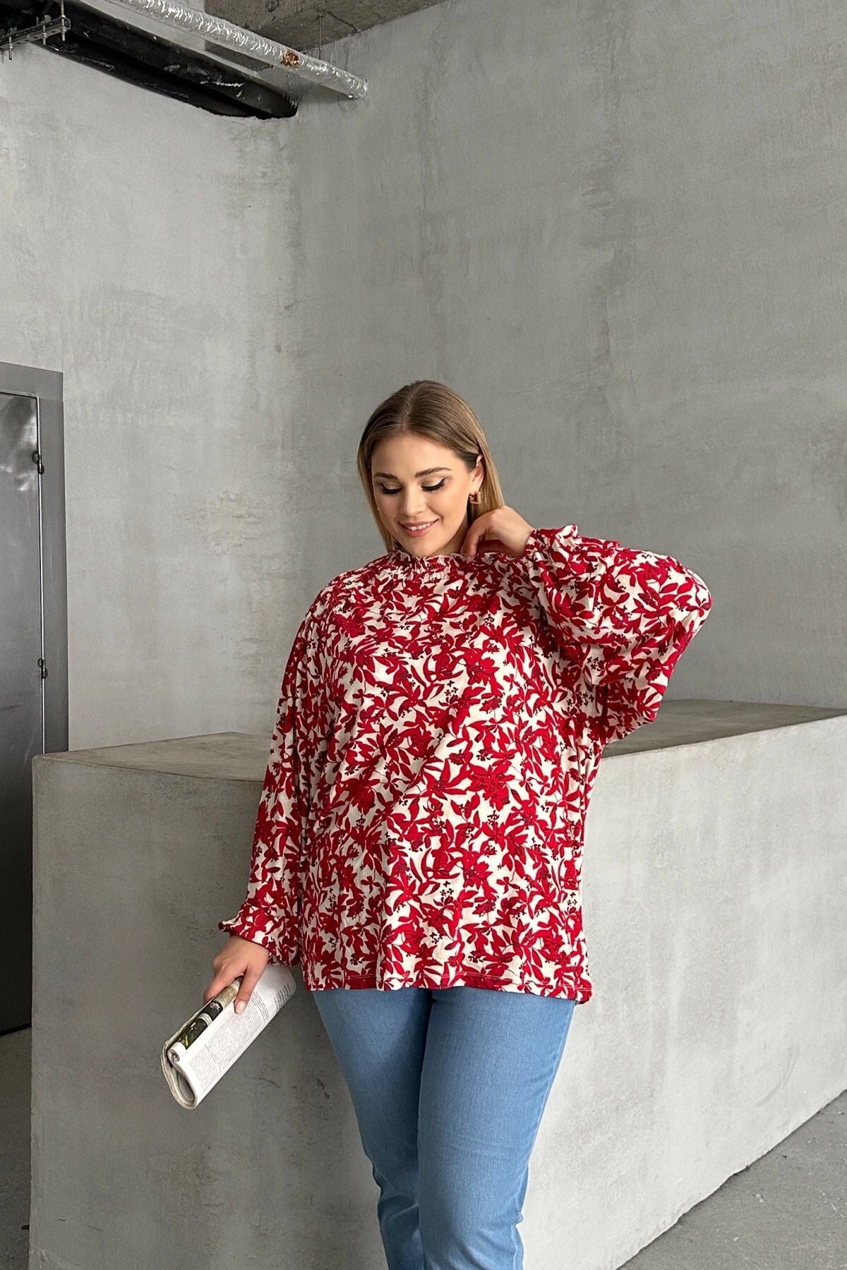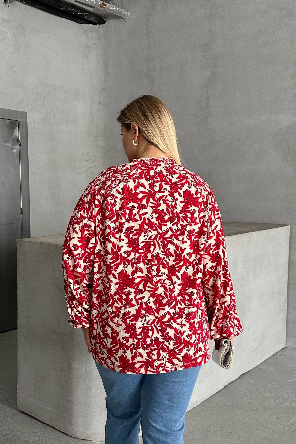 Büyük Beden Yakası Büzgülü Uzun Kollu Desenli Bluz E15233