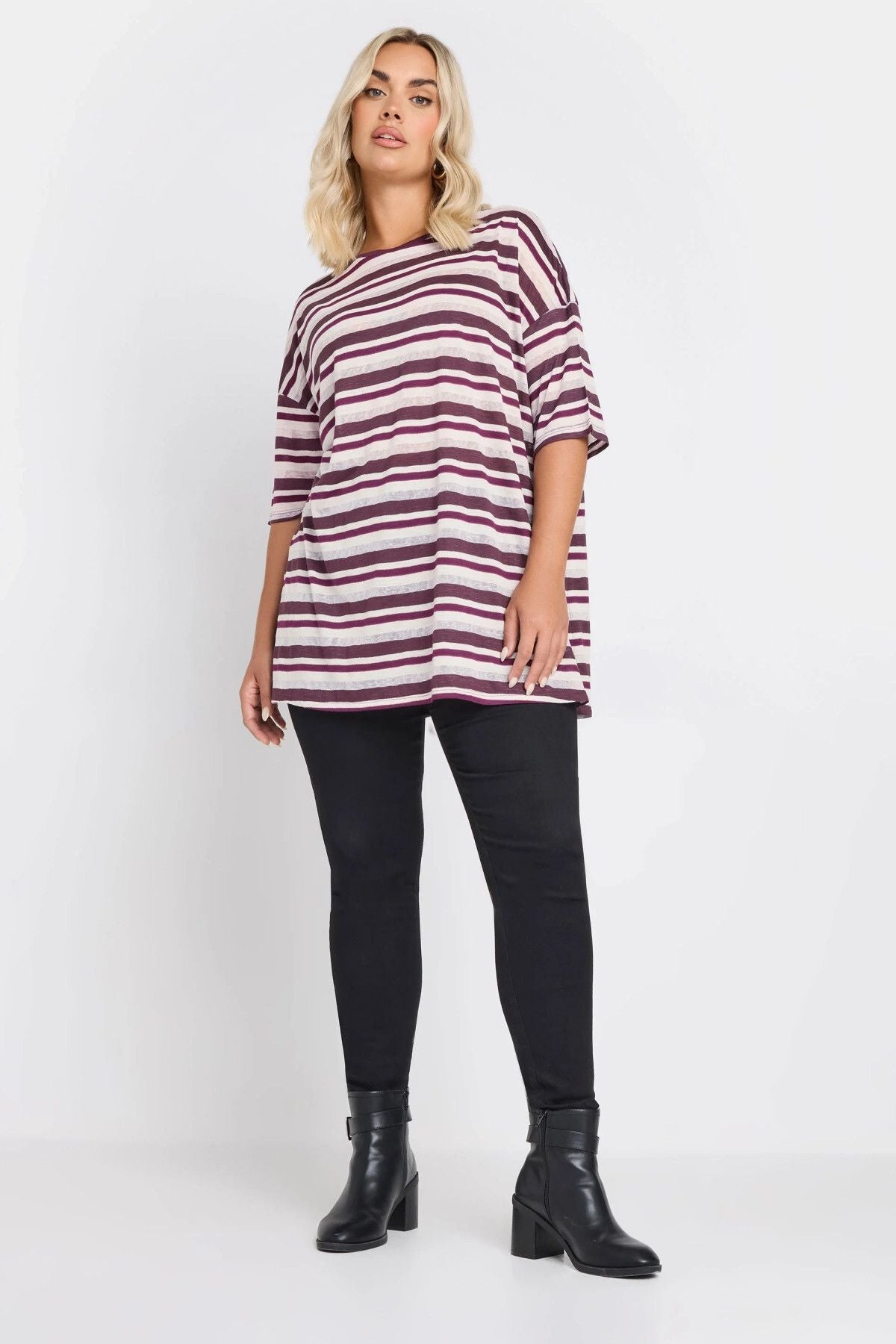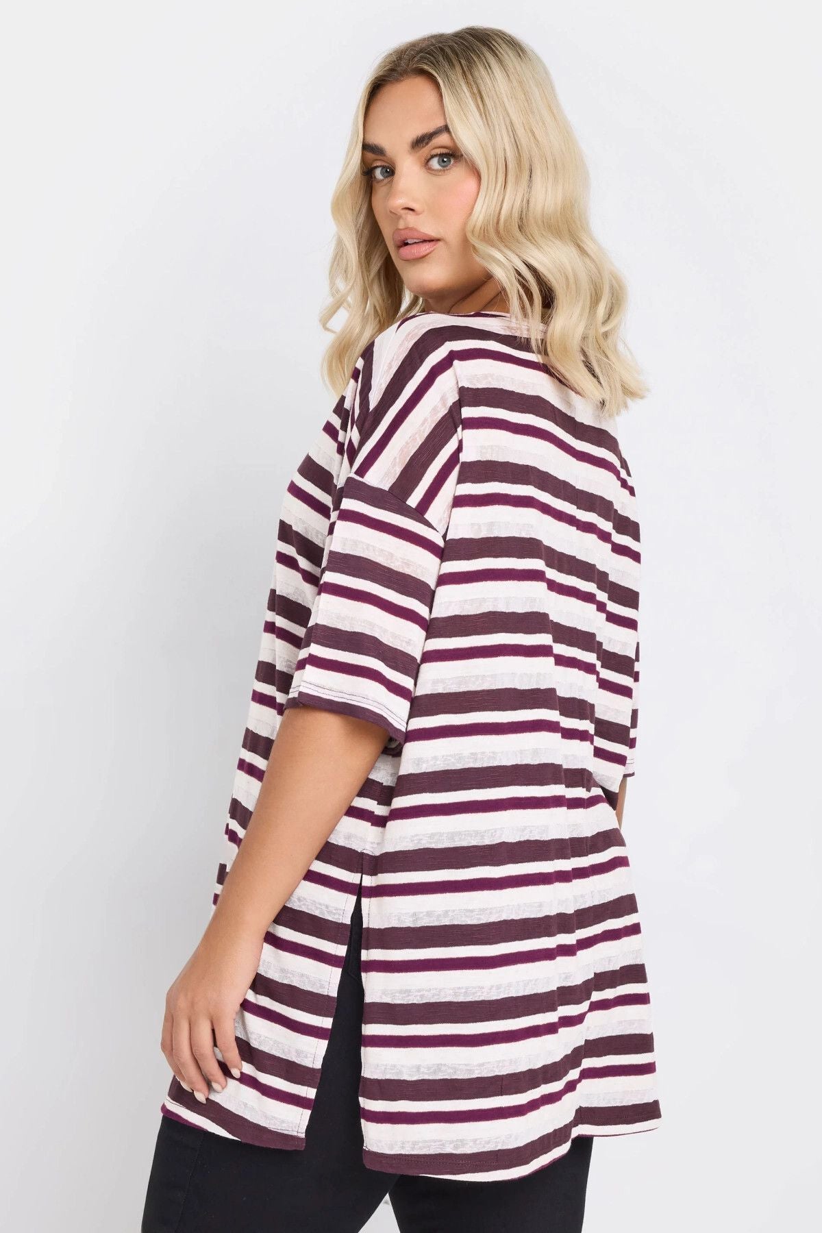 Büyük Beden Yanları Yırtmaçlı Kısa Kollu Bisiklet Yaka Çizgili T-shirt 303668