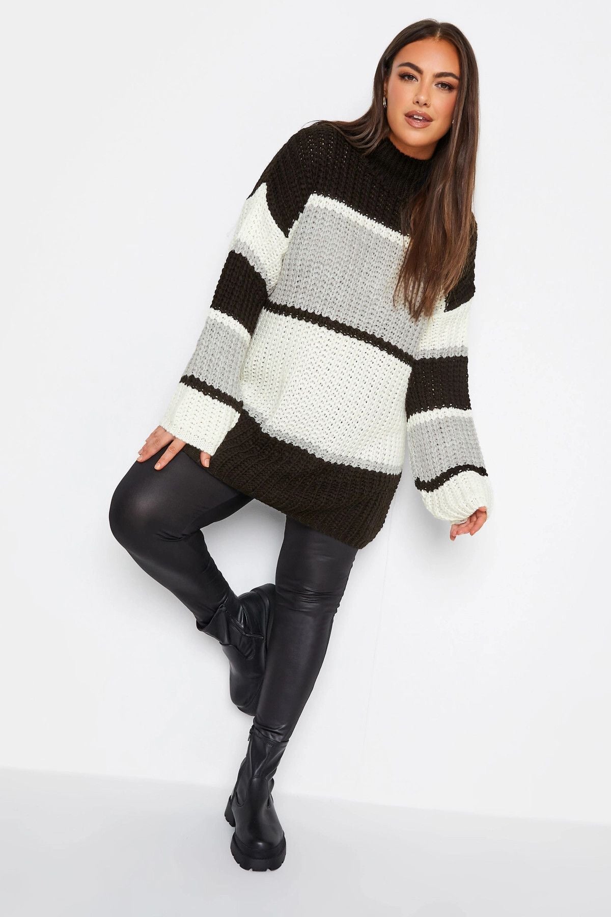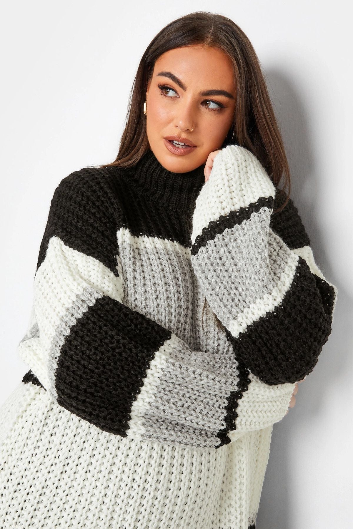 Büyük Beden Yarım Balıkçı Yaka Renk Bloklu Triko Örme Kazak 302329