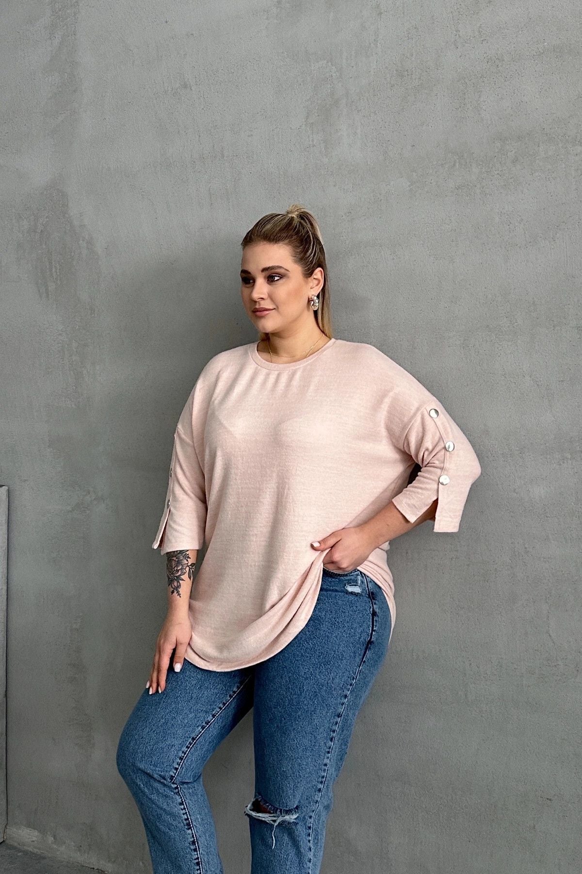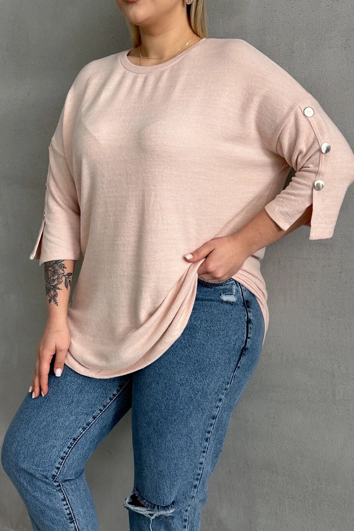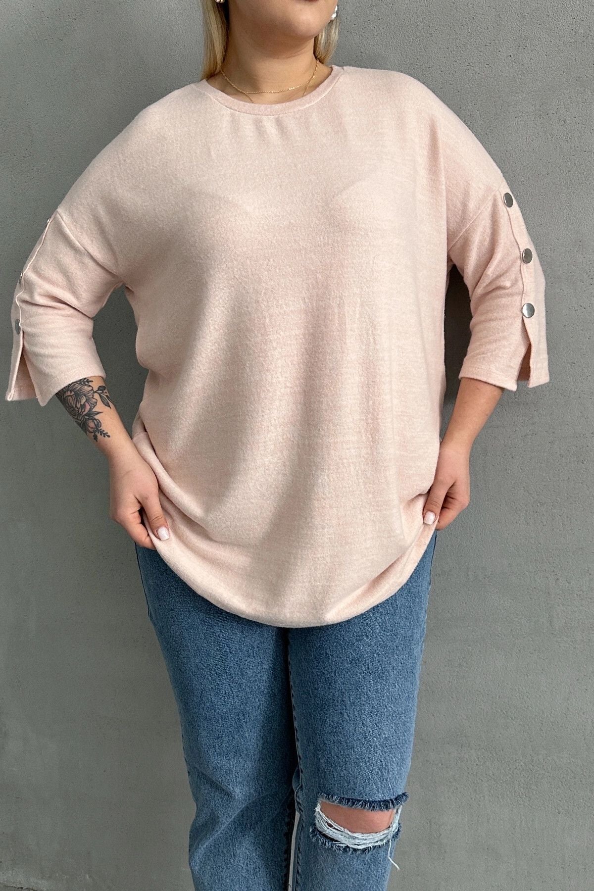 Büyük Beden Yarım Kollu Bisiklet Yaka Düğme Detaylı Kazak 303072