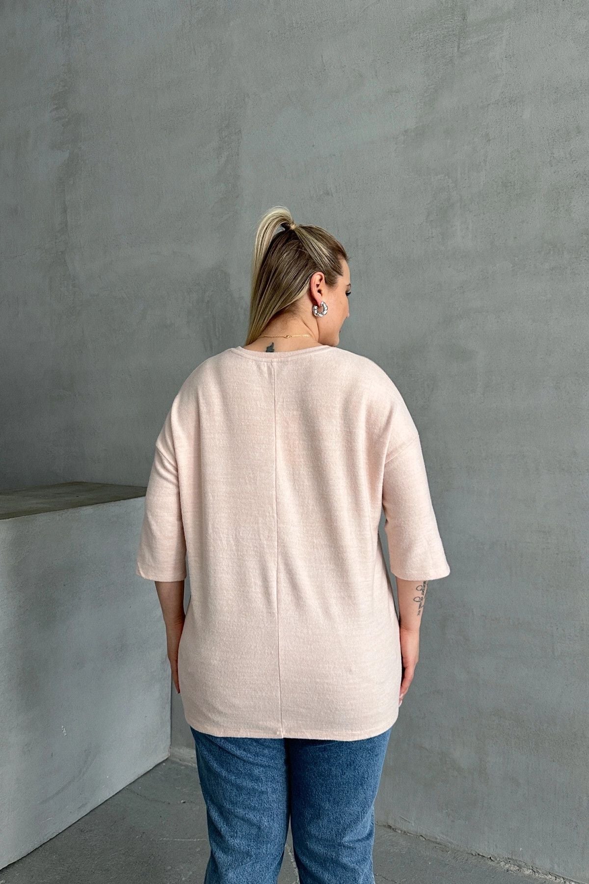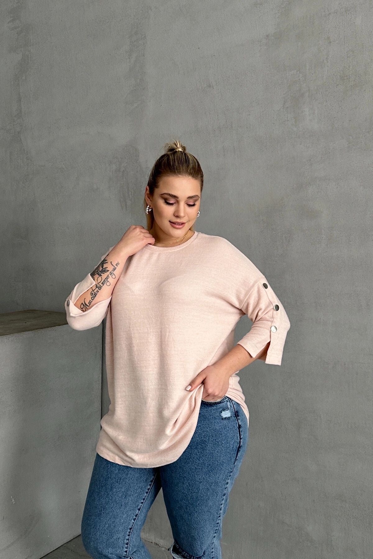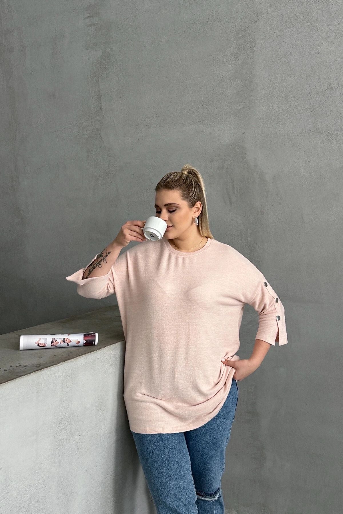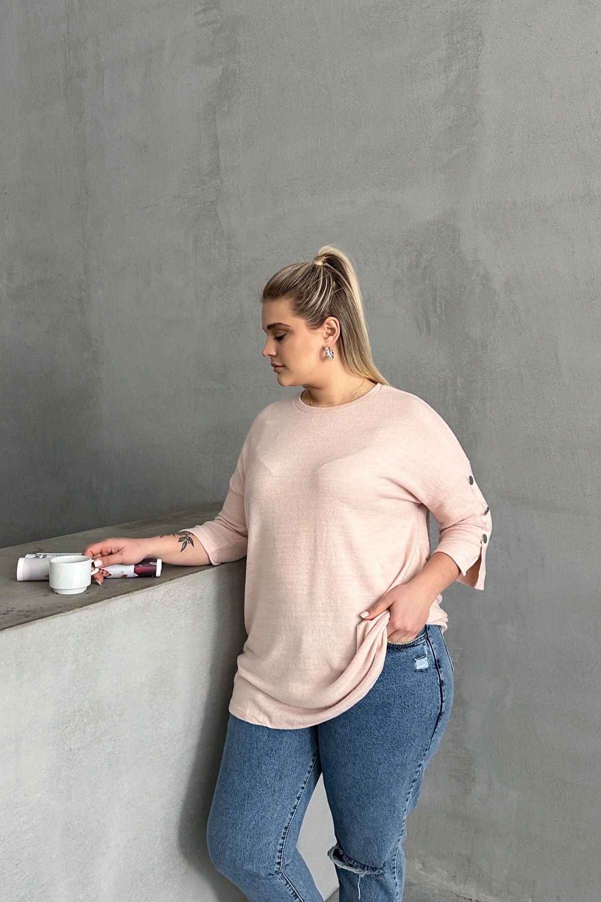 Büyük Beden Yarım Kollu Bisiklet Yaka Düğme Detaylı Kazak 303072