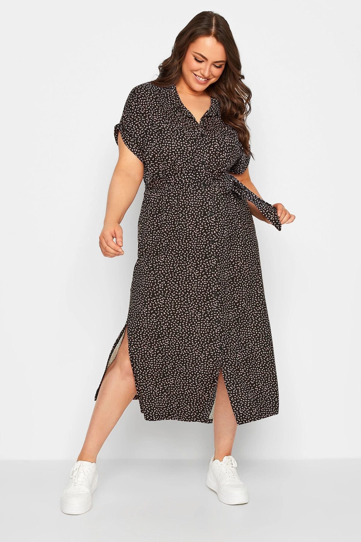 Büyük Beden Yırtmaç Detaylı Beli Kuşaklı Likralı Düğmeli Elbise 137433