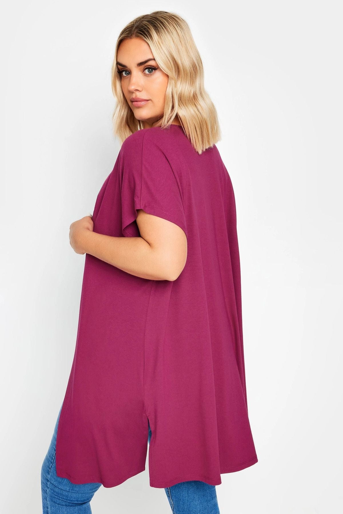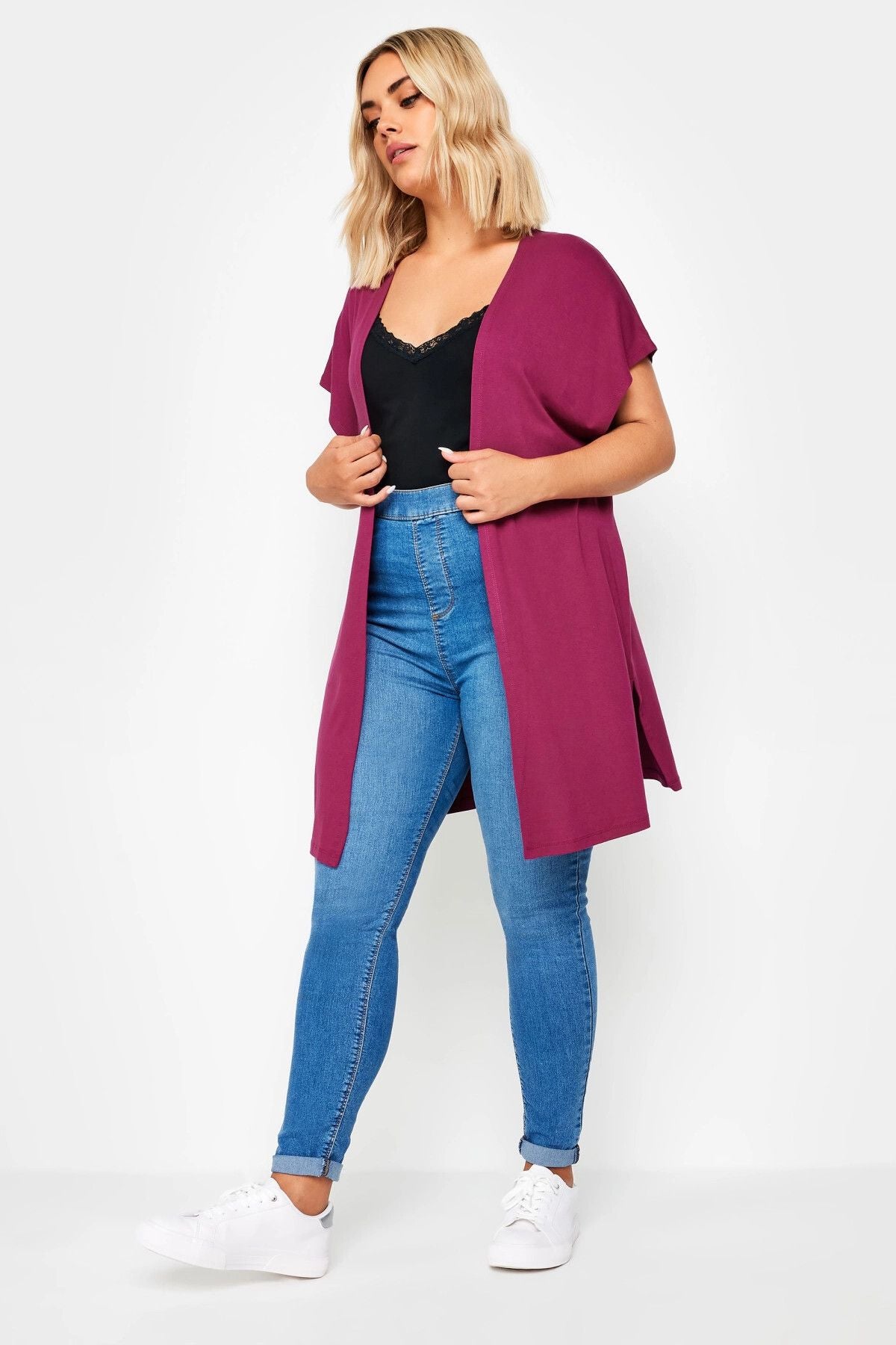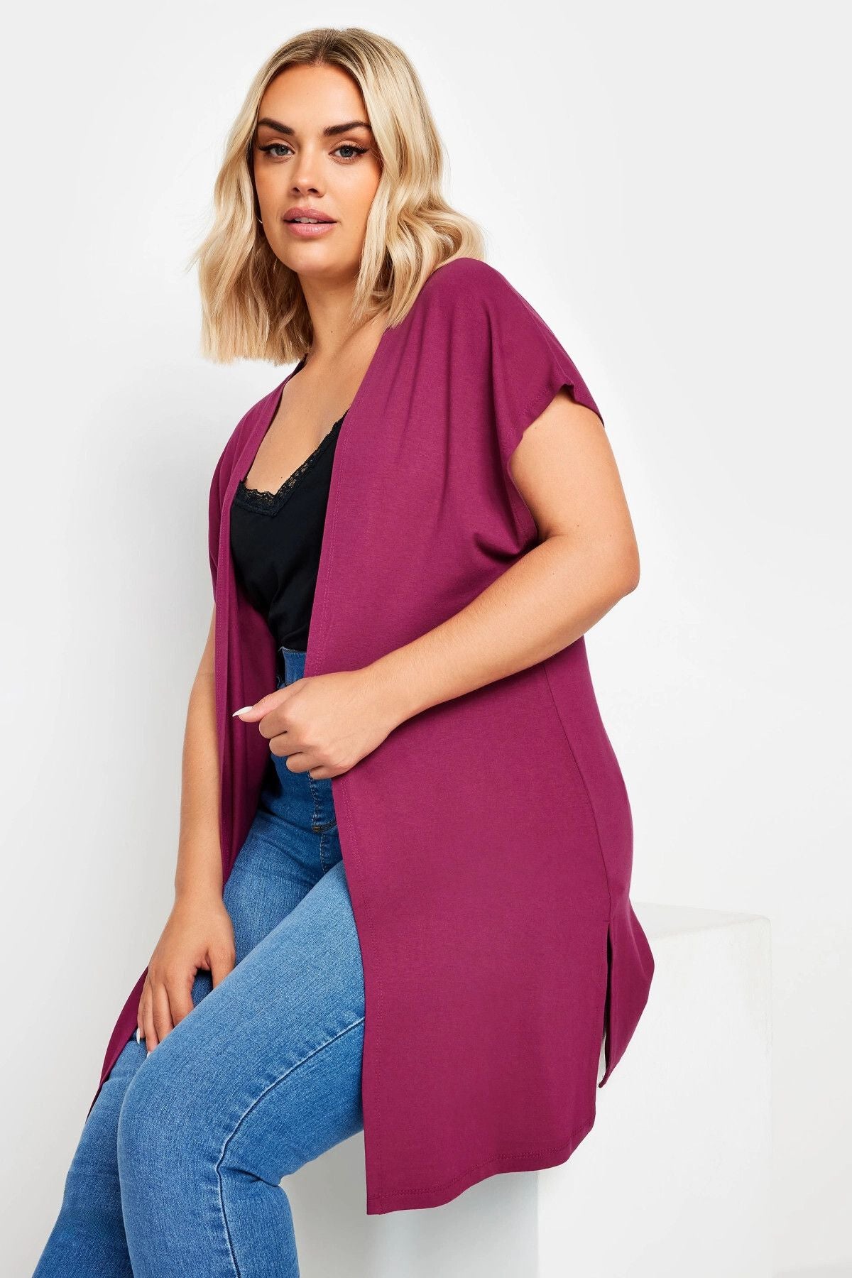 Büyük Beden Yırtmaç Detaylı Düğmesiz Esnek Kumaş Kısa Kollu Hırka 321907