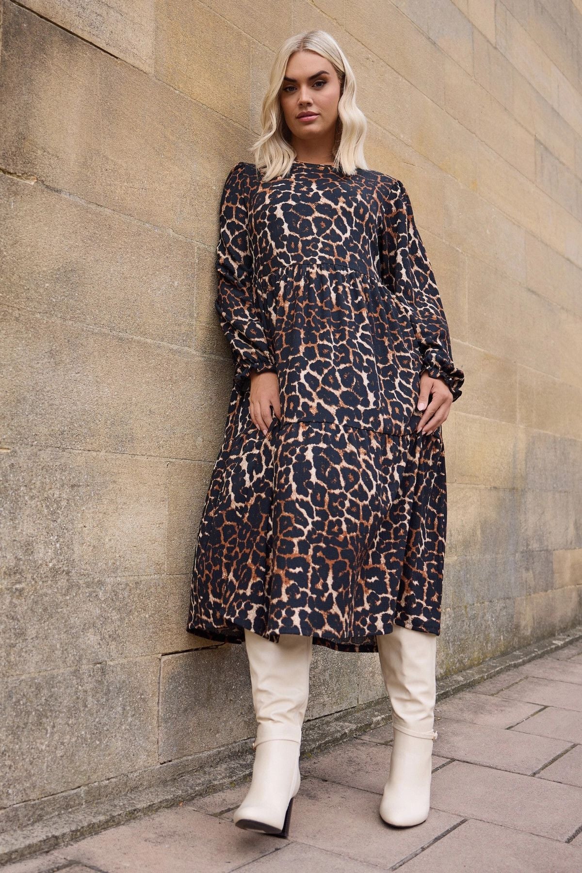 Büyük Beden Yumuşak Dokulu Leopar Desenli Balon Kol Elbise 270014