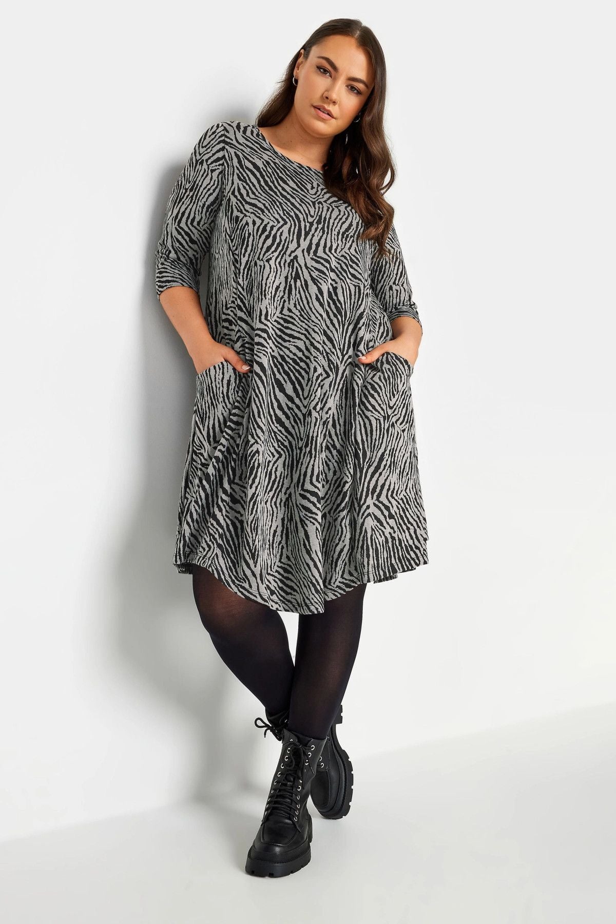 Büyük Beden Zebra Desenli Fakir Kol Bisiklet Yaka Cepli Elbise 302869