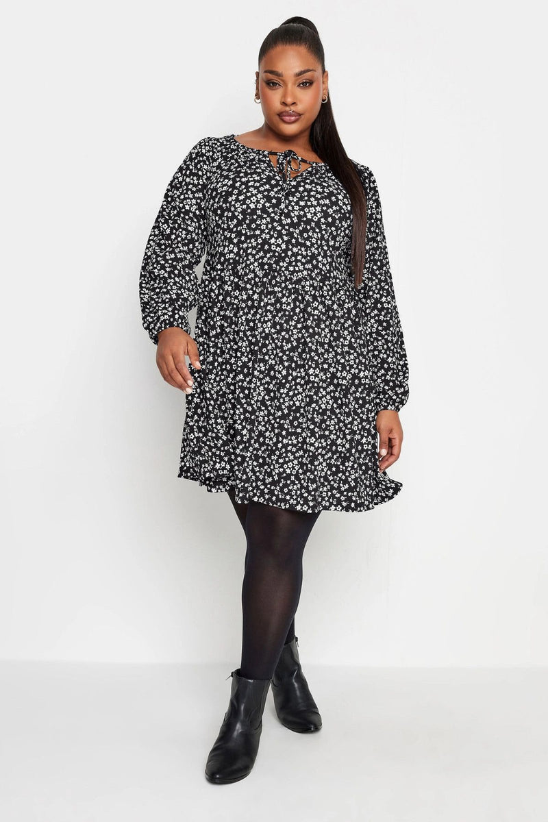 Büyük Beden Çiçek Desenli Uzun Kollu Yakası Bağlama Detaylı Kısa Elbise 302750