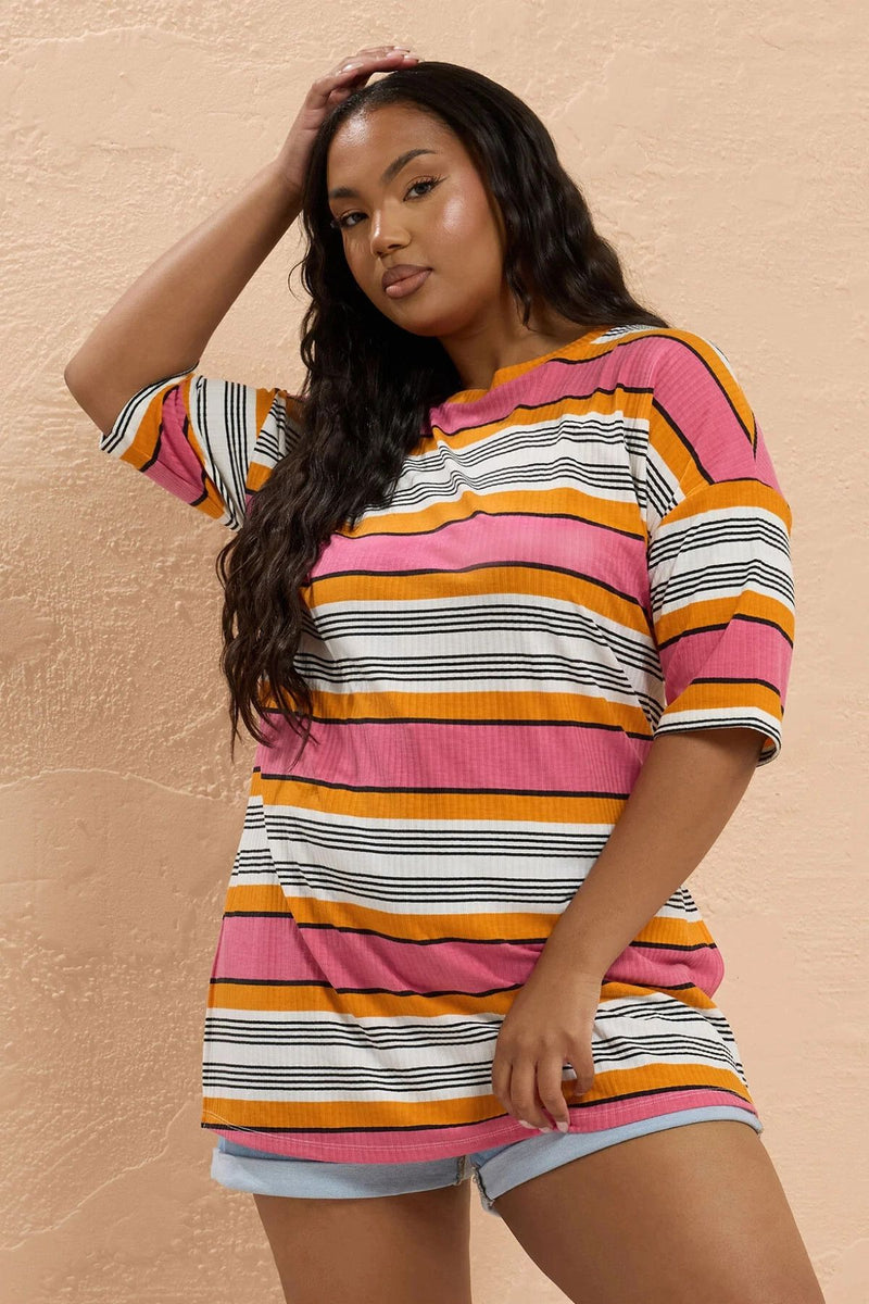 Büyük Beden Çizgili Yırtmaç Detaylı T-shirt 303505