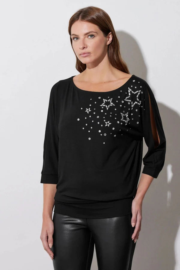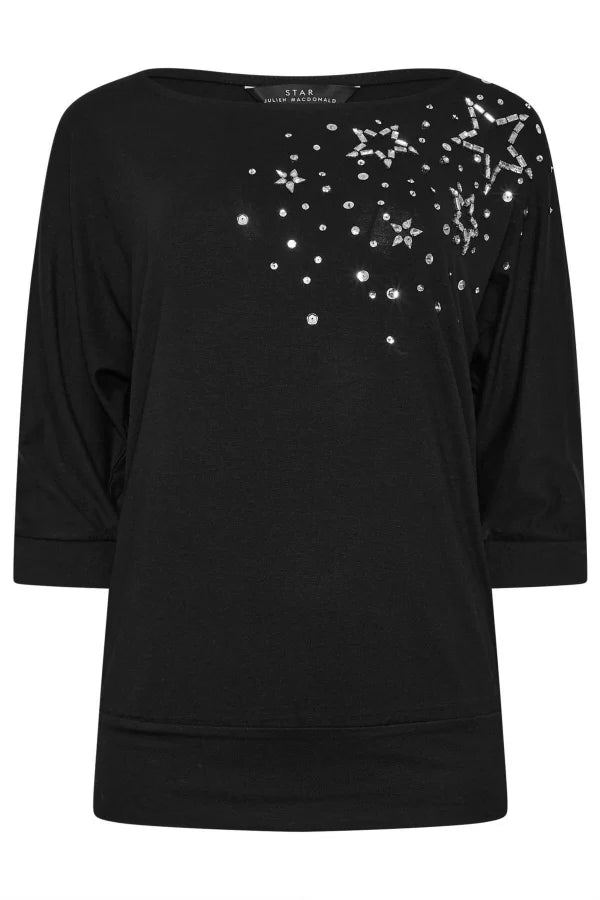 Geniş Bisiklet Yaka Yarım Kollu Yıldız Taş İşlemeli Beli Lastikli Bluz 110695