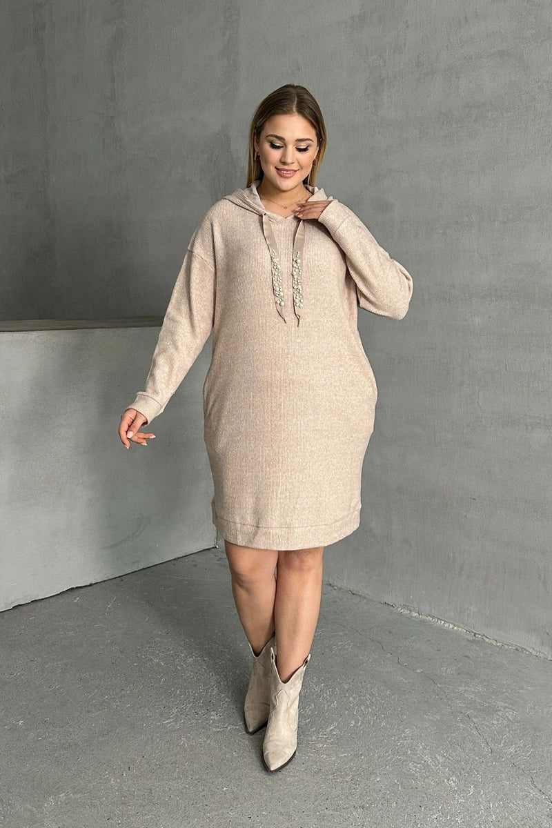 Büyük Beden Kapüşonlu Boncuk İşlemeli Cepli Sweat Elbise 301801