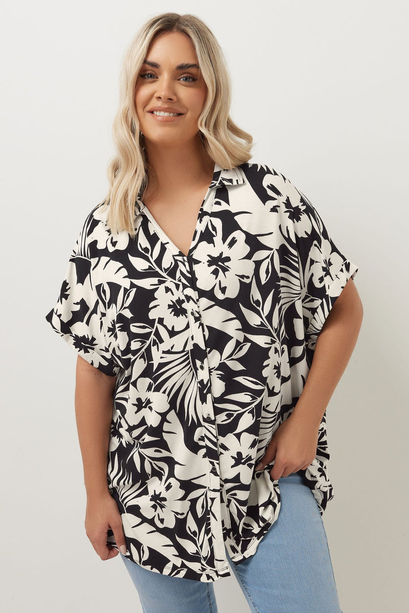 Büyük Beden Kısa Kollu Çiçek Desenli Gömlek 303686