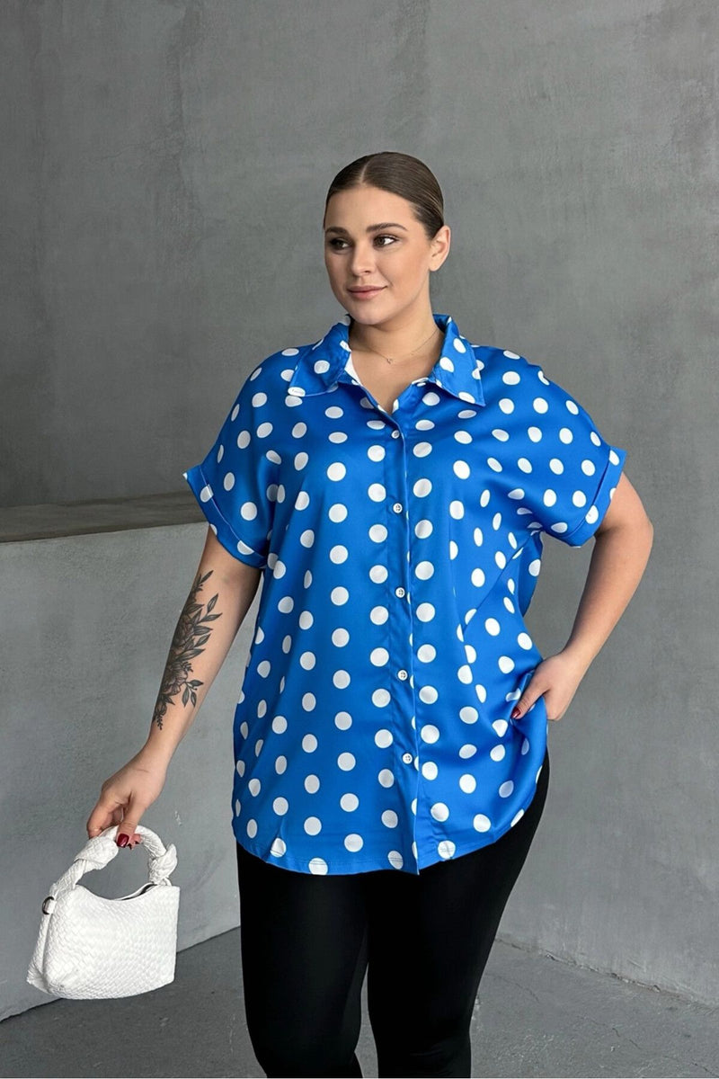 Büyük Beden Önü Düğmeli Kısa Kollu Puantiye Desenli Gömlek 303462