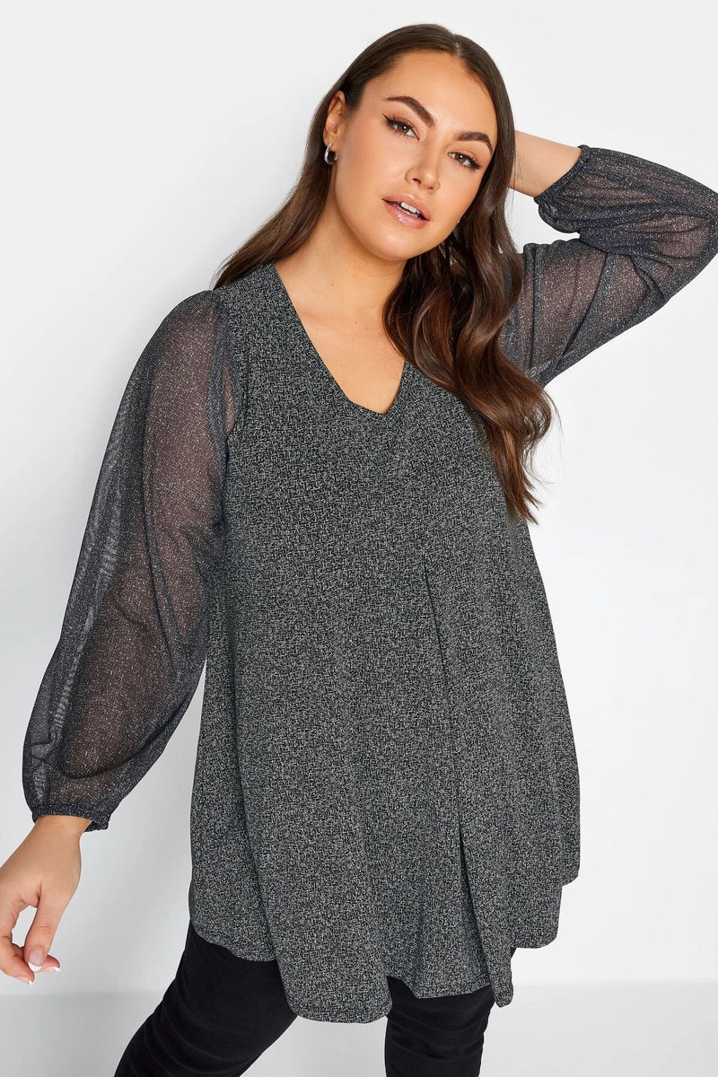 Büyük Beden Uzun Kolları Tül Detaylı Pileli V Yaka Bluz 302824