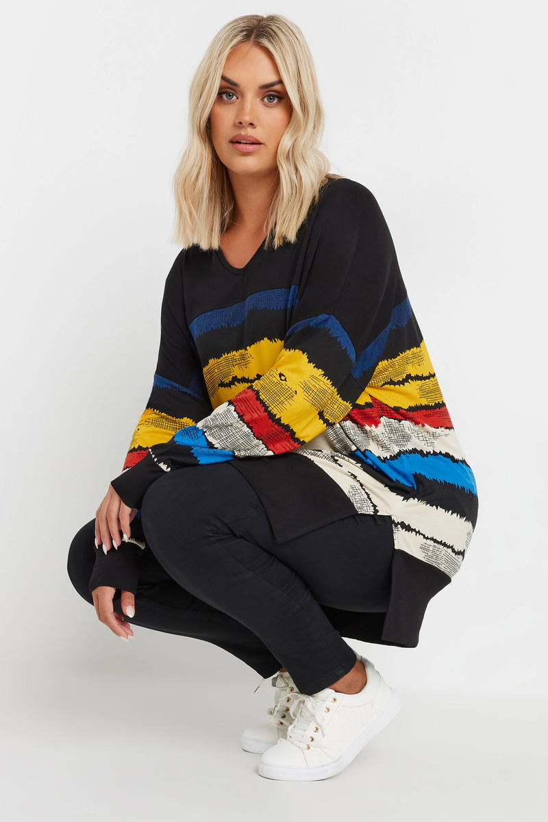 Büyük Beden V Yaka Çizgili Yanları Yırtmaçlı Uzun Kollu Bluz 302920