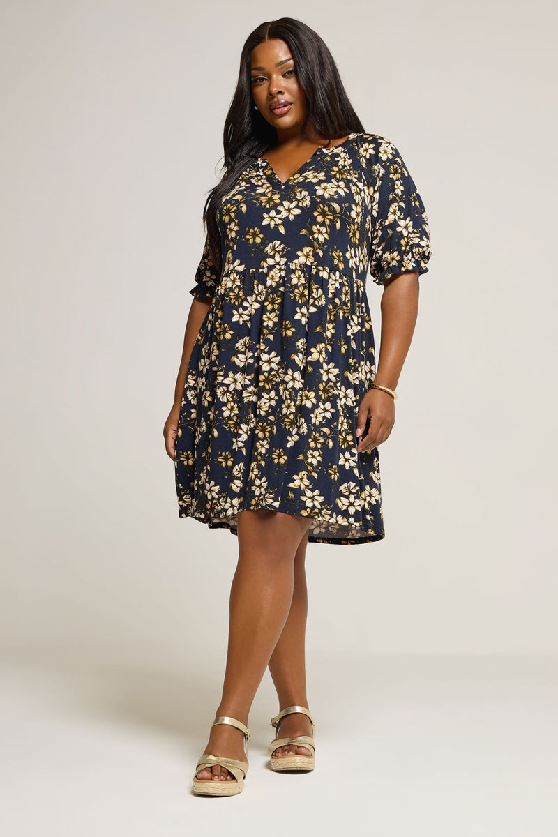 Büyük Beden V Yaka Kısa Kollu Çiçek Desenli Mini Elbise 304076