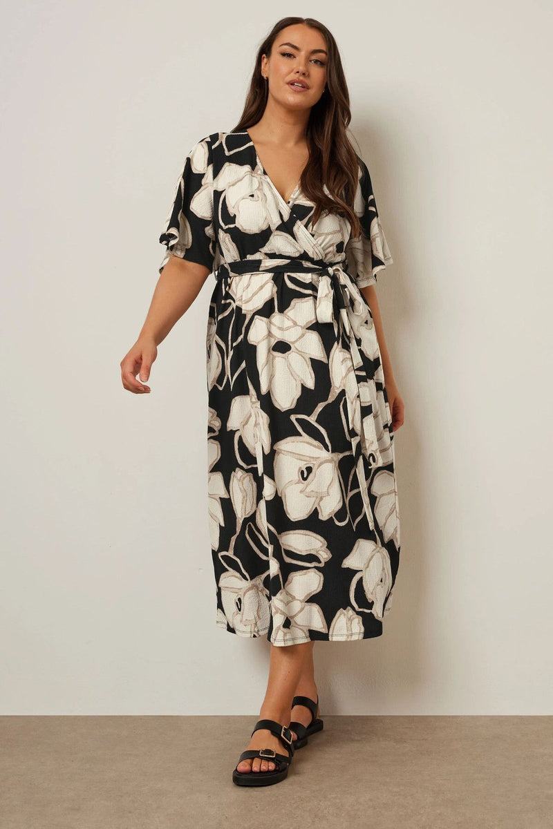 Büyük Beden V Yaka Kısa Kollu Önü Bağlamalı Anvelop Midi Elbise 304069
