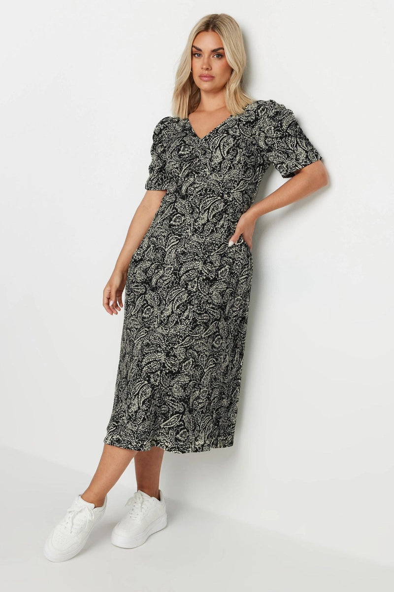 Büyük Beden V Yaka Kolları Drapeli Çiçek Desenli Midi Boy Elbise 137960
